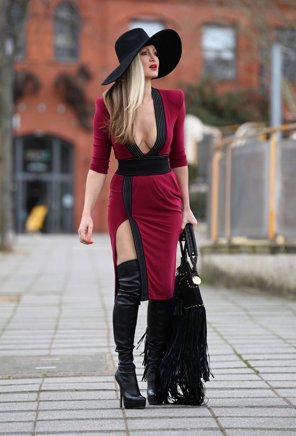 Modelo Caprice muestra su amplio escote con un sexy vestido con abertura en el muslo y botas, mientras su sombrero vuela por las verdaderamente ventosas condiciones al salir de una reunión de producción en Londres, 03/11/2021.