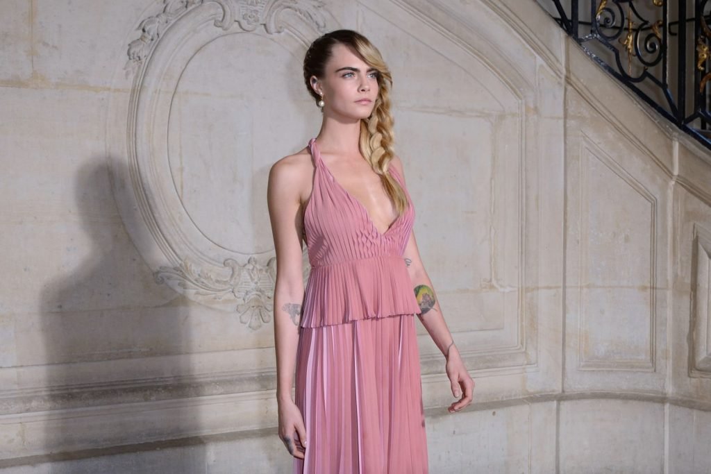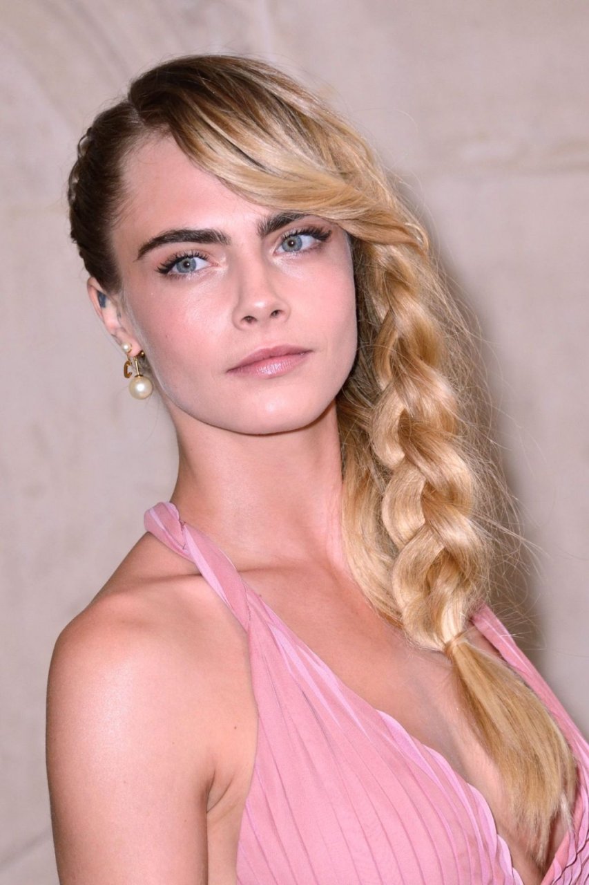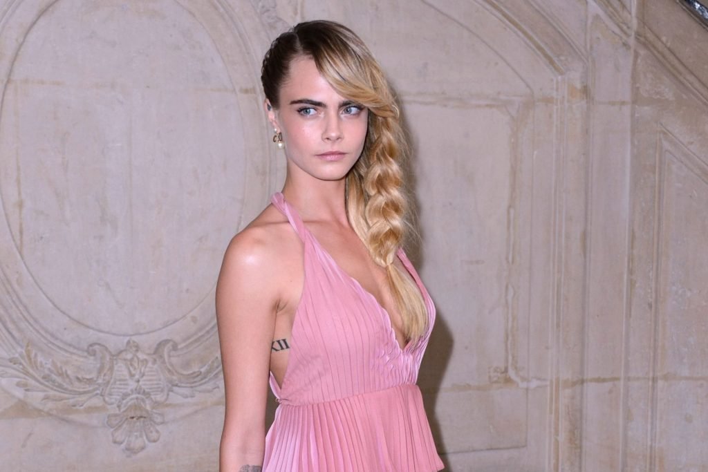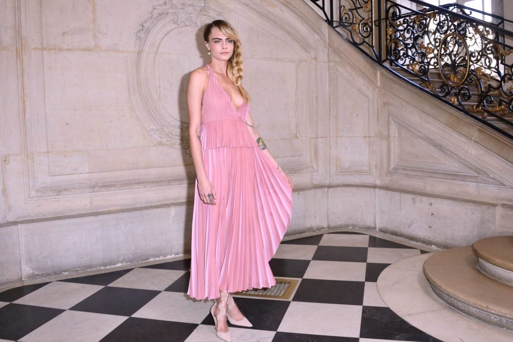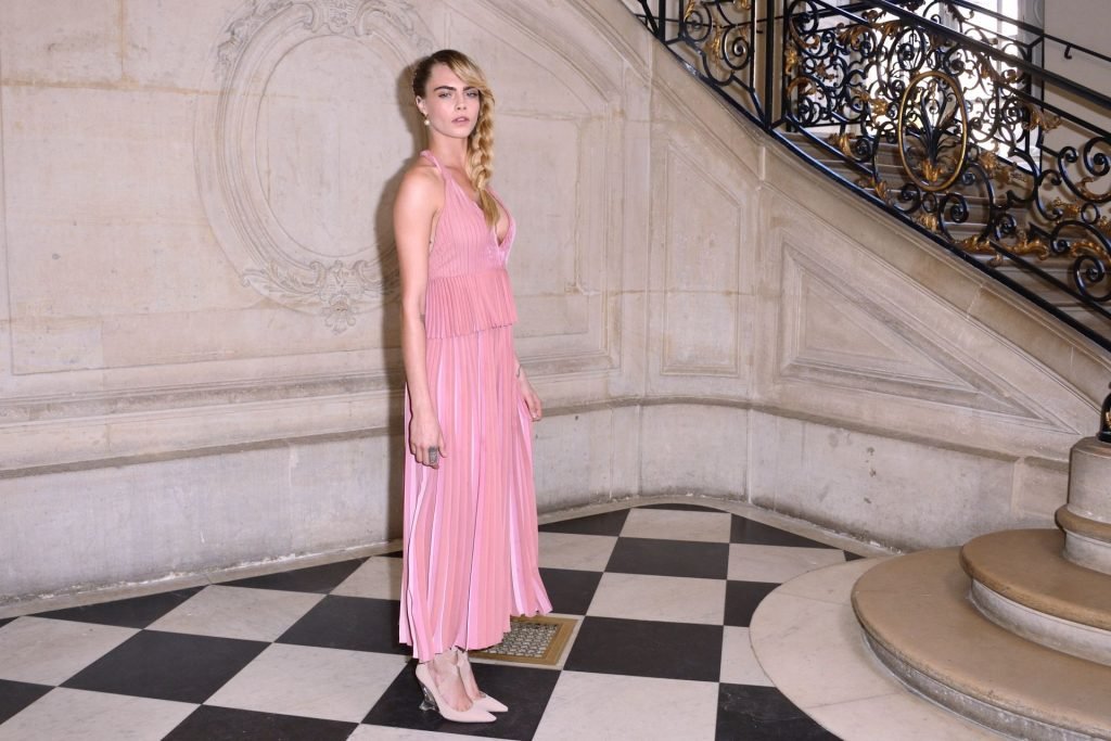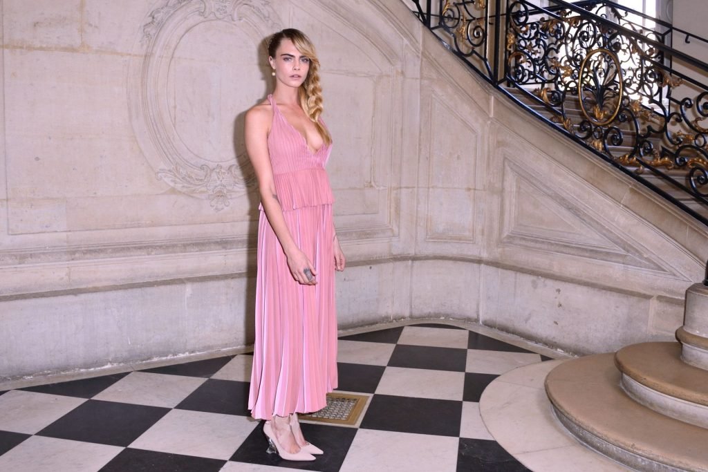 Cara Delevingne fue vista asistiendo al desfile de Christian Dior como parte de la Semana de la Moda de París para ropa femenina otoño/invierno 2019/2020 en París, Francia, 26/02/2019. La modelo/actriz mostró sus pechos frescos vistiendo un vestido rosa.