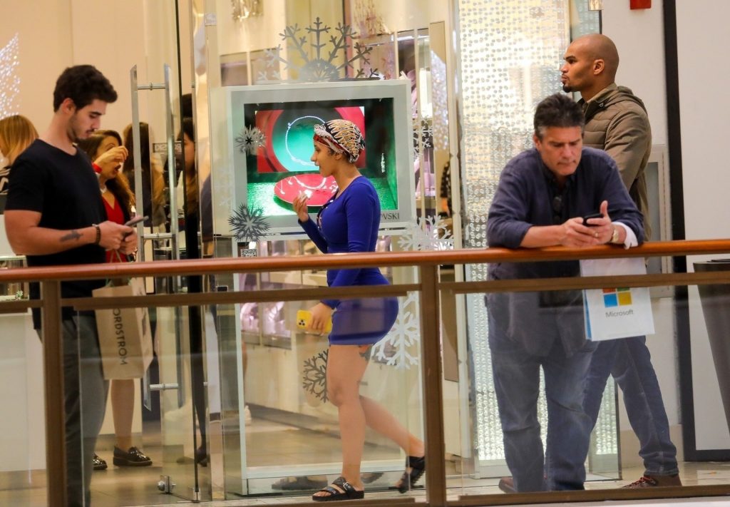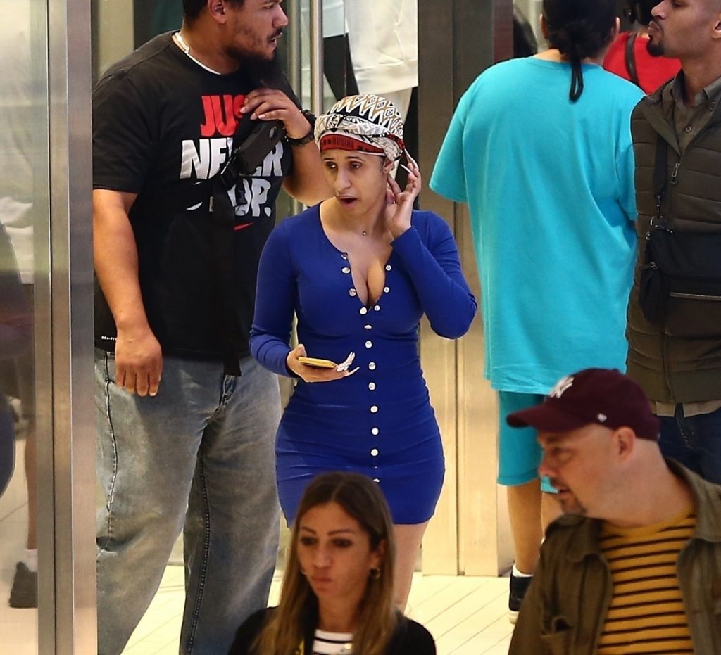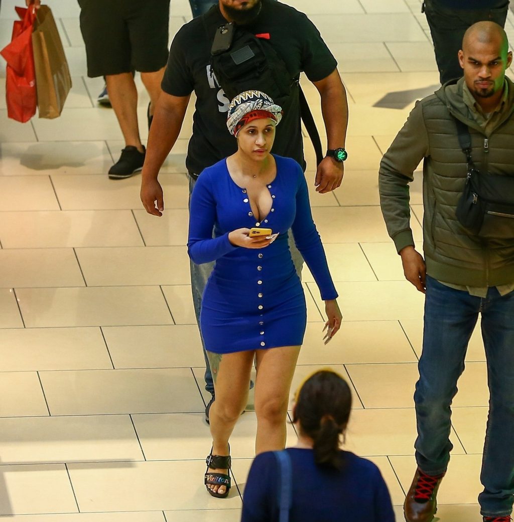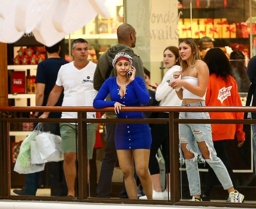 Cardi B atrae a una multitud mientras visita el centro comercial Aventura en Miami para hacer algunas compras en el último fin de semana antes de Navidad, 22/12/2019. La rapera y cantante mantuvo un estilo sencillo sin maquillaje y con el cabello envuelto en un simple turbante, aunque mostró sus curvas con un mini vestido azul corto con un escote pronunciado.
