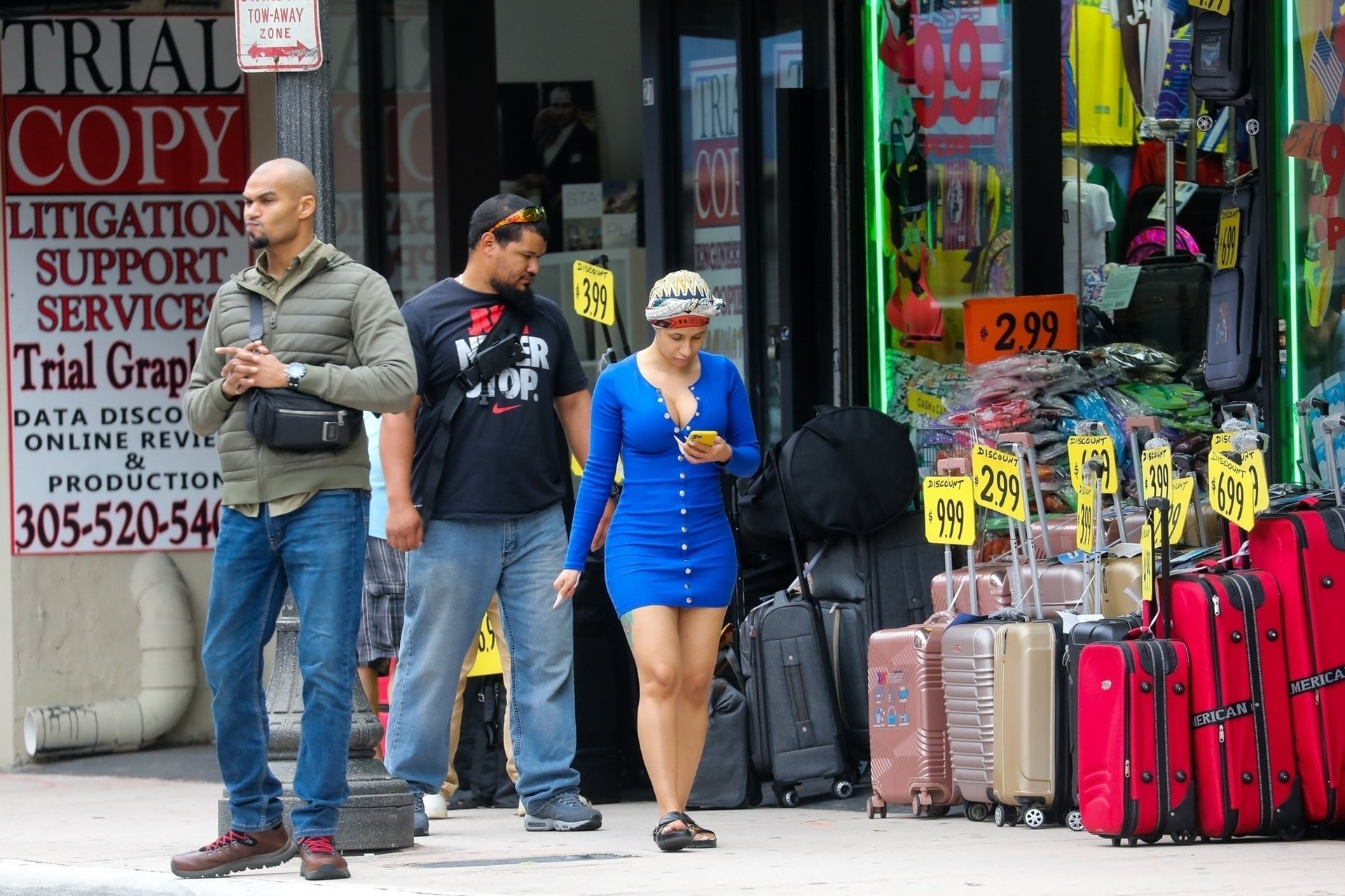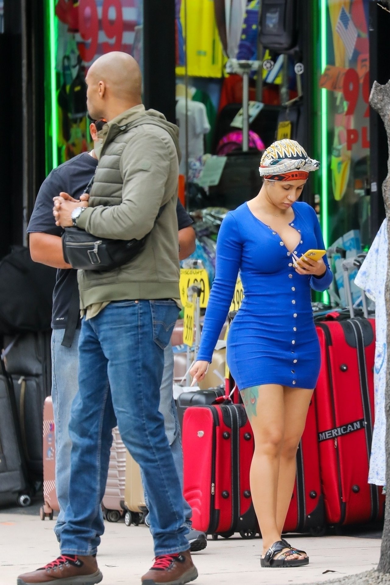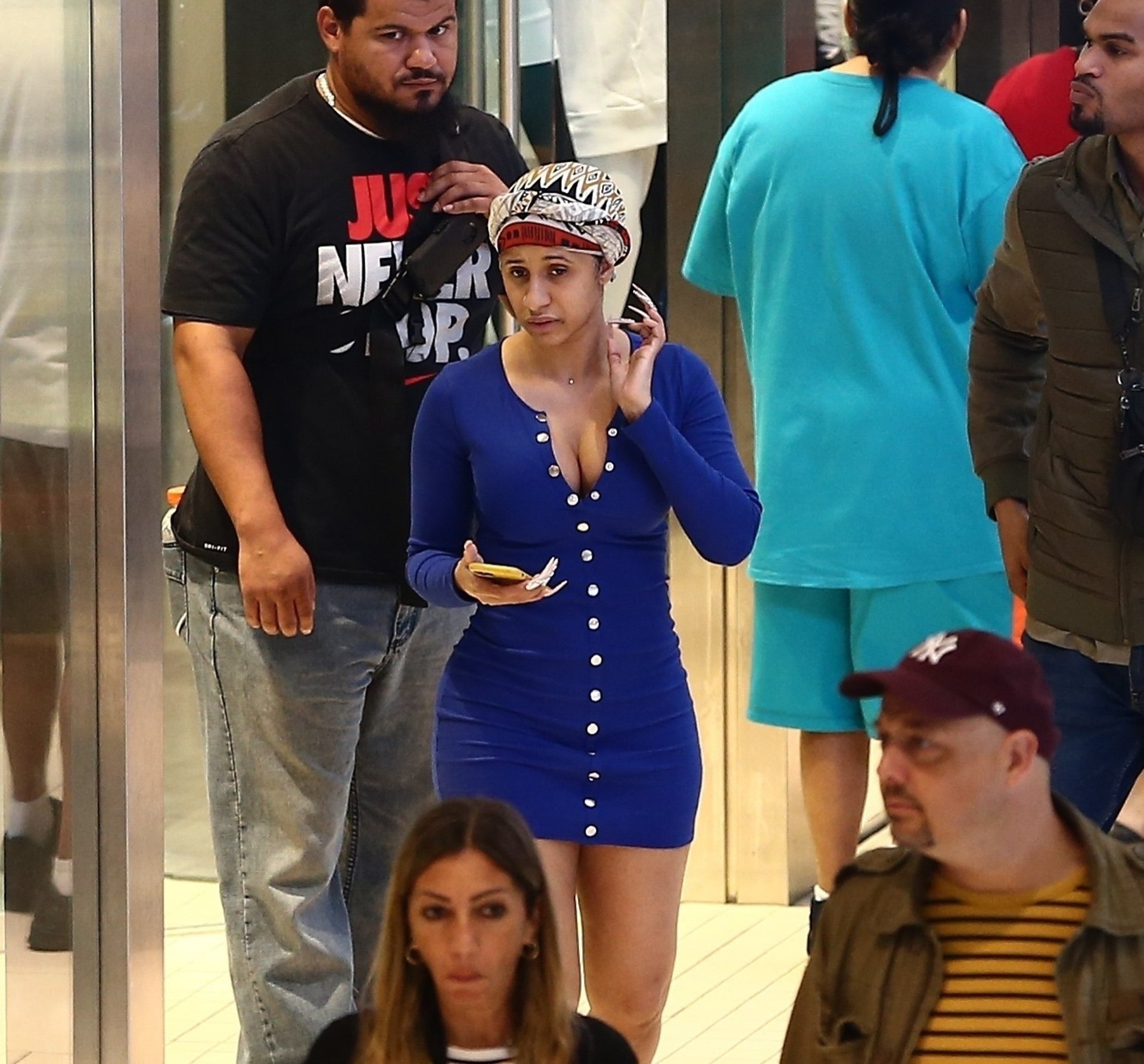 Cardi B atrae a una multitud mientras visita el centro comercial Aventura en Miami para hacer algunas compras en el último fin de semana antes de Navidad, 22/12/2019. La rapera y cantante mantuvo un estilo sencillo sin maquillaje y con el cabello envuelto en un simple turbante, aunque mostró sus curvas con un mini vestido azul corto con un escote pronunciado.
