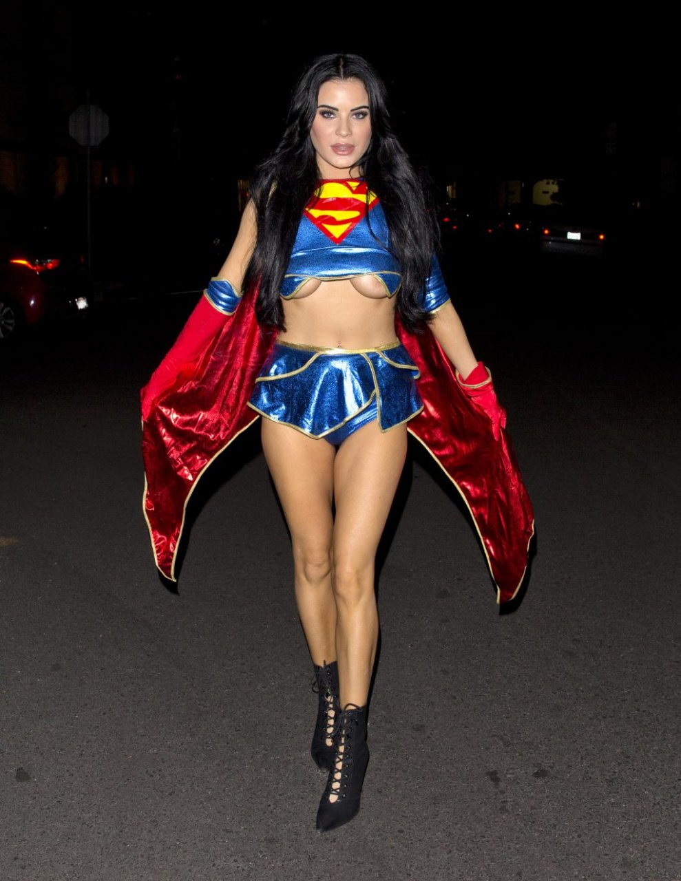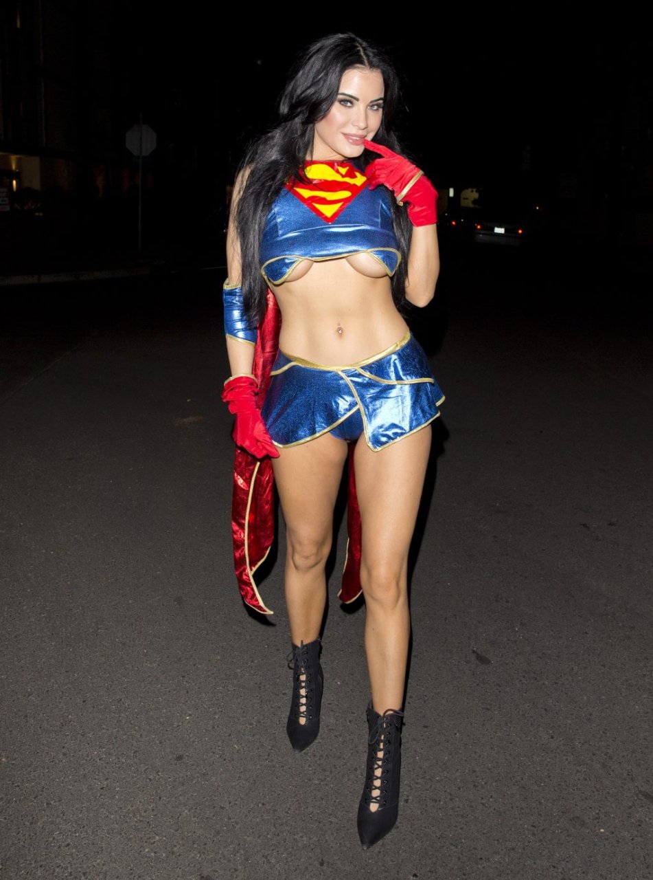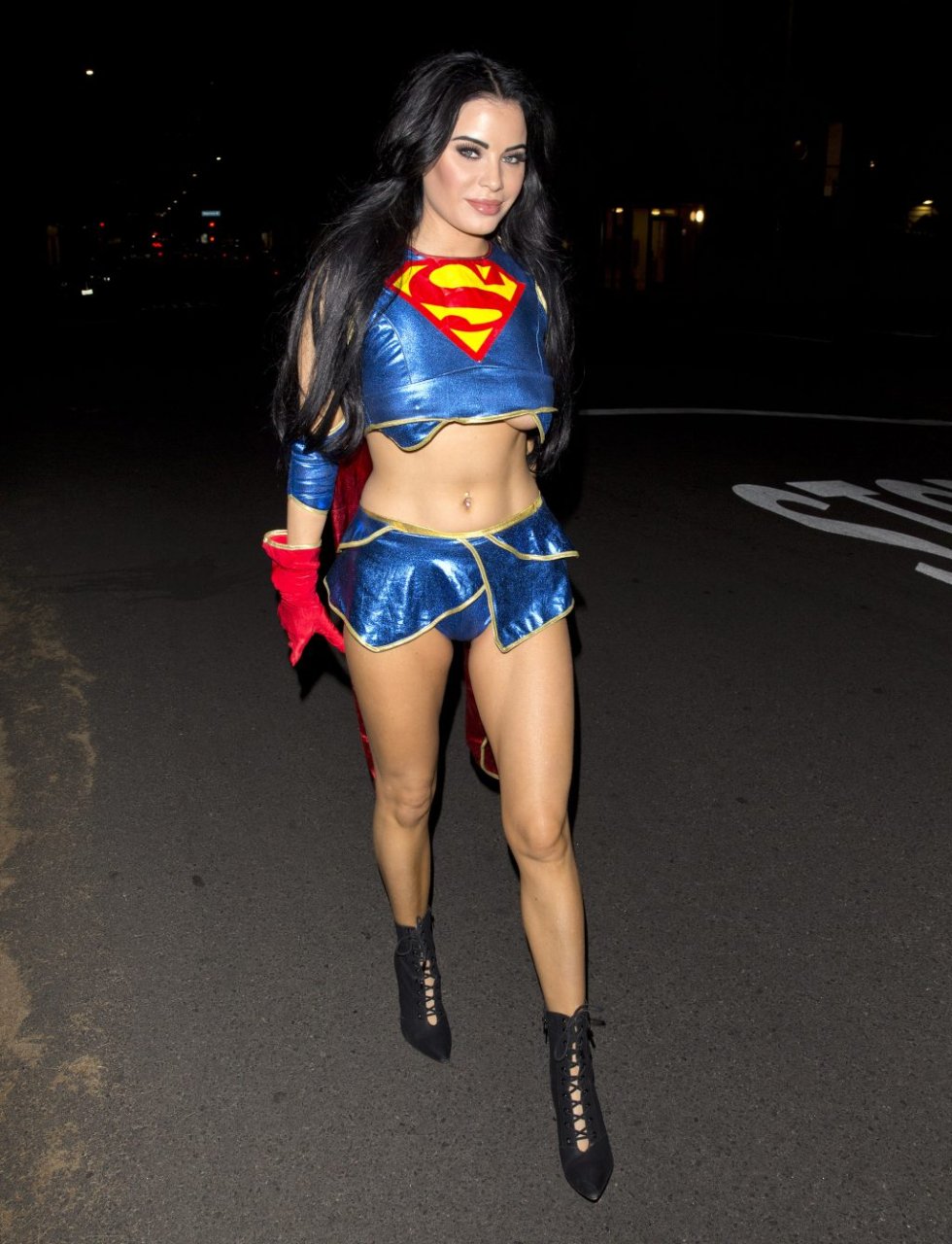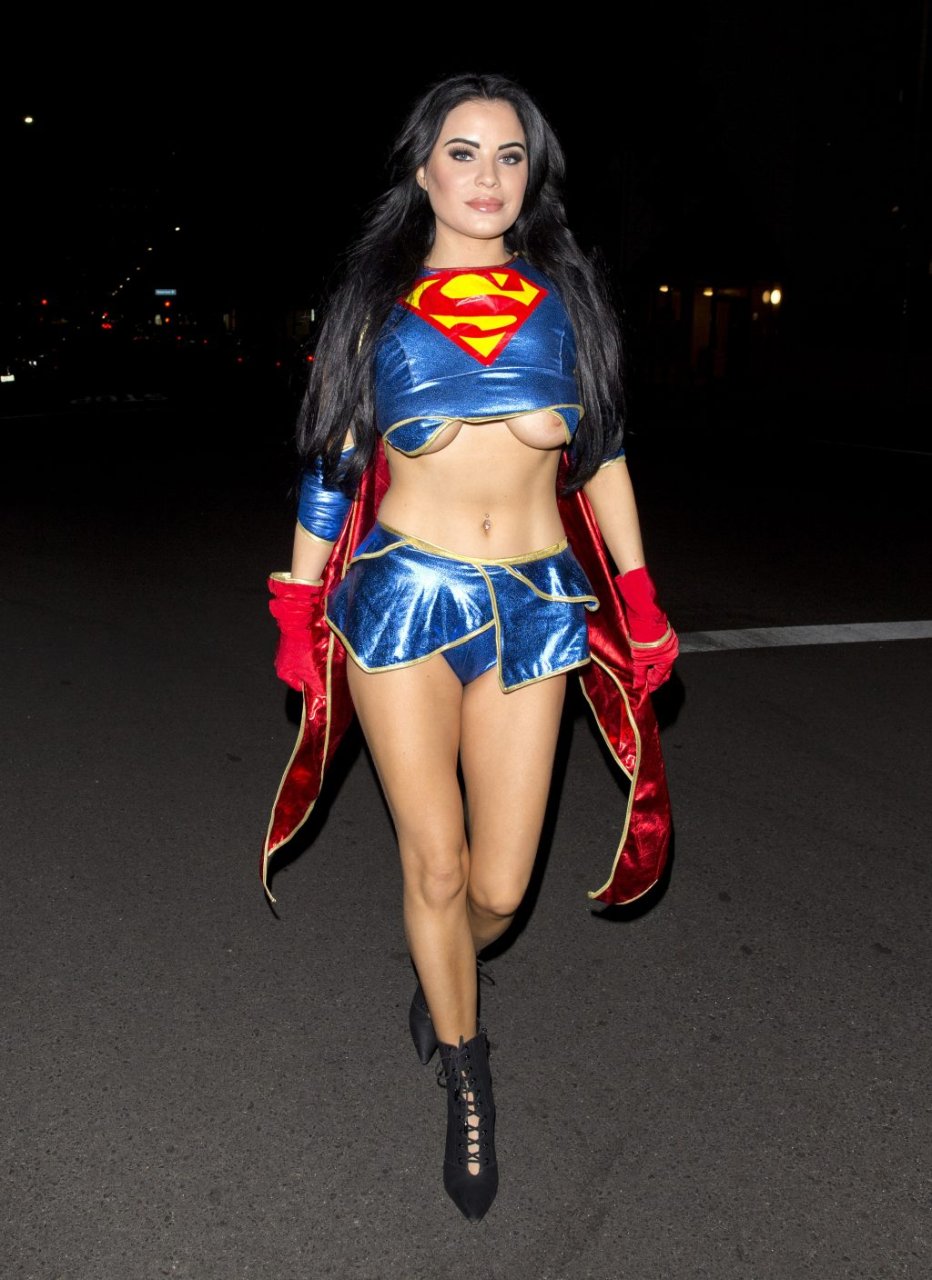 Brunette Carla Howe posa en la alfombra roja en la Fiesta de Halloween Karma en Los Ángeles, 20/10/2018. La modelo/actriz de 28 años mostró su sexy trasero y pechos con un sensual disfraz de Superman.