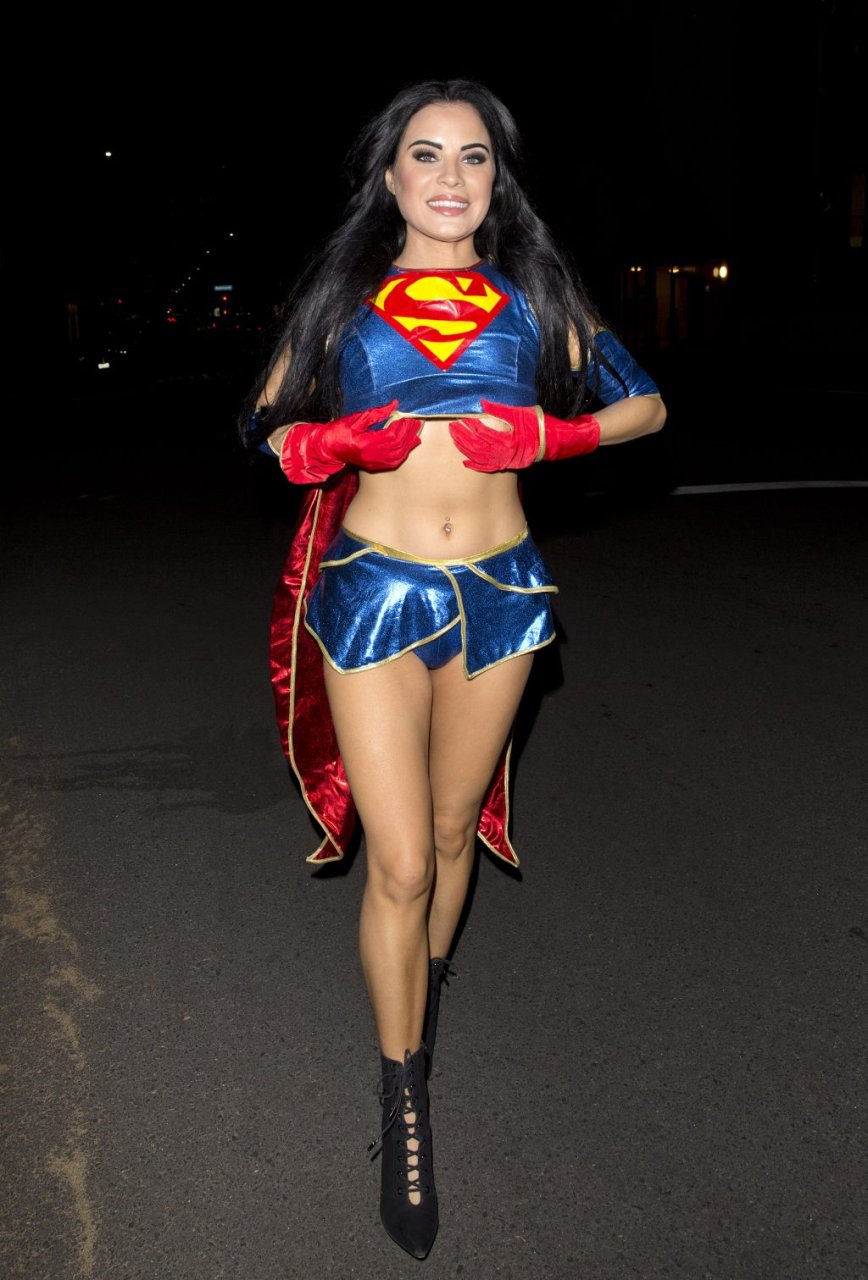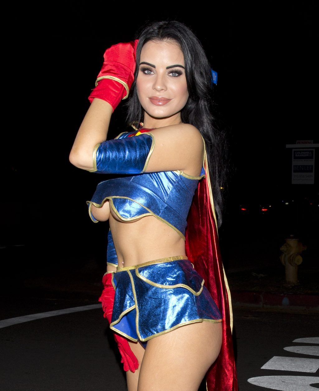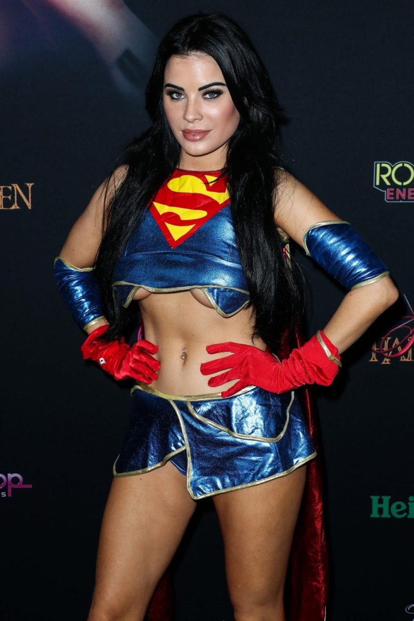 Brunette Carla Howe posa en la alfombra roja en la Fiesta de Halloween Karma en Los Ángeles, 20/10/2018. La modelo/actriz de 28 años mostró su sexy trasero y pechos con un sensual disfraz de Superman.