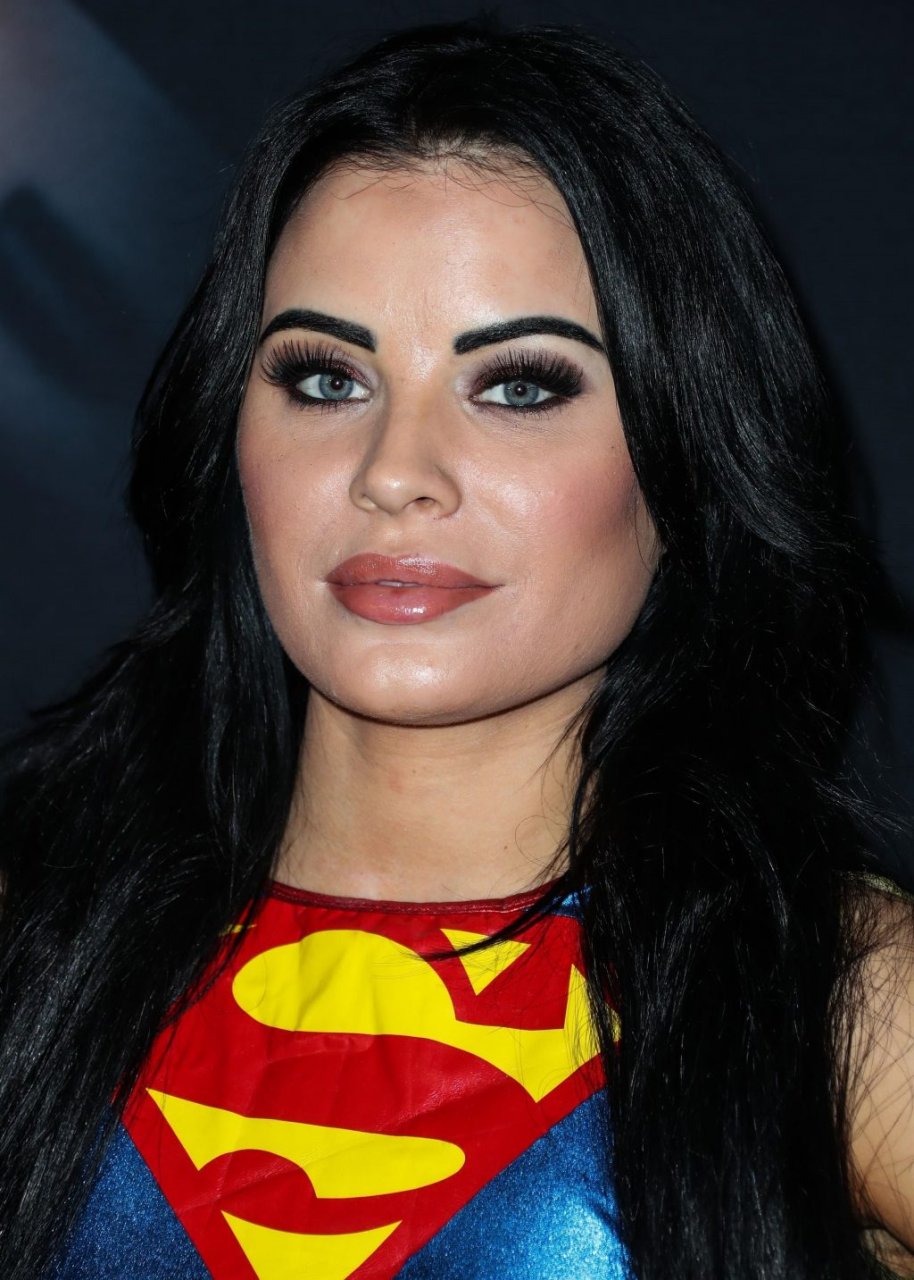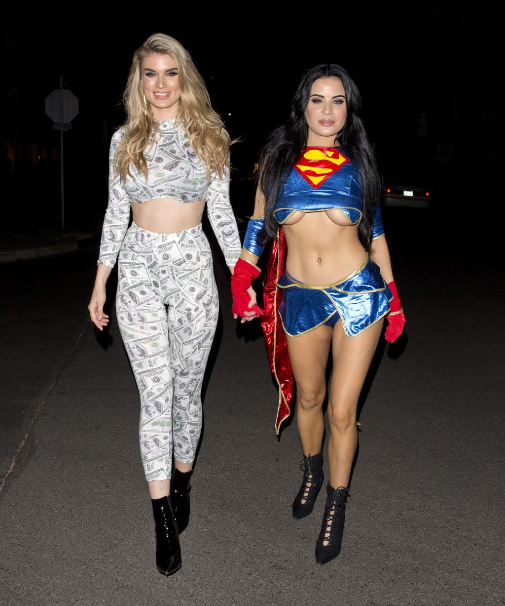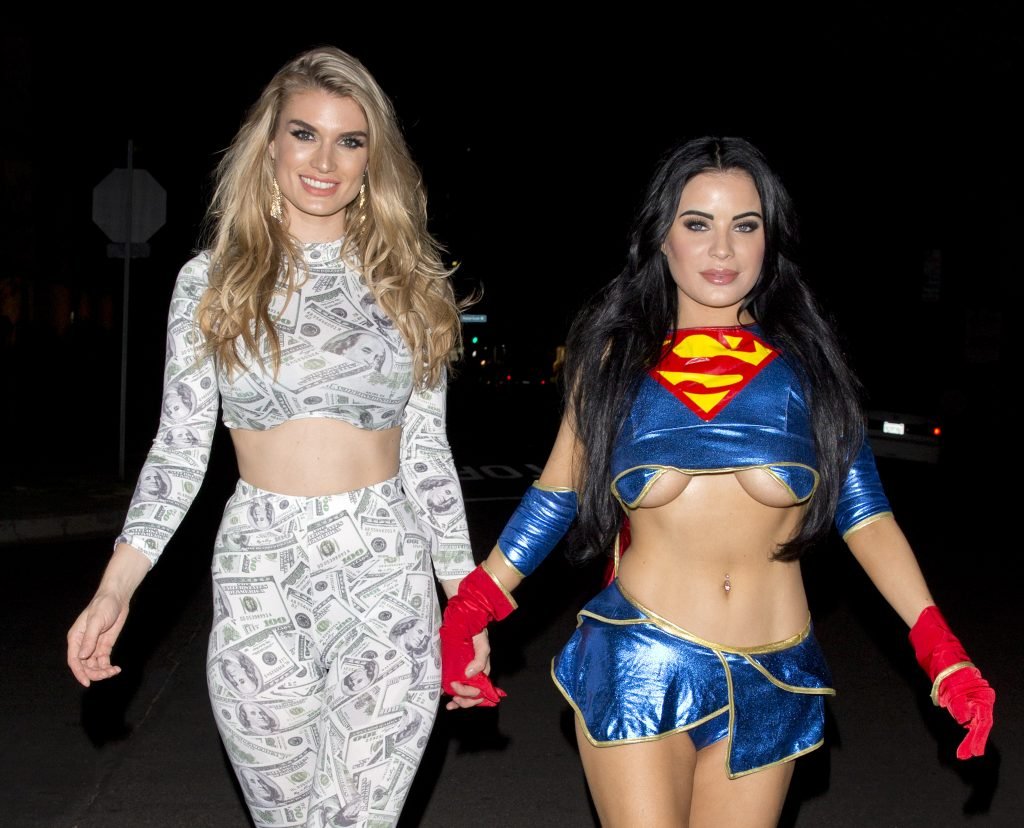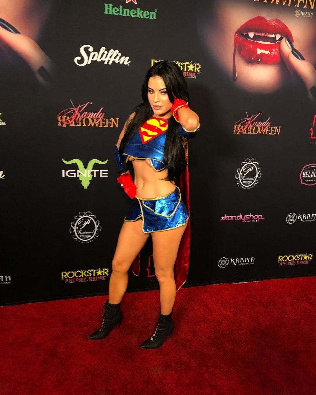 Brunette Carla Howe posa en la alfombra roja en la Fiesta de Halloween Karma en Los Ángeles, 20/10/2018. La modelo/actriz de 28 años mostró su sexy trasero y pechos con un sensual disfraz de Superman.