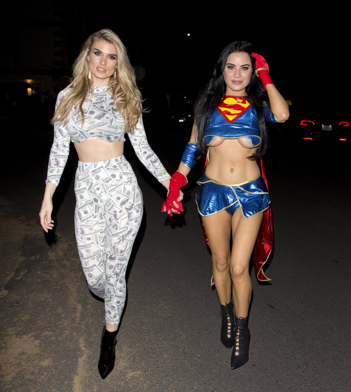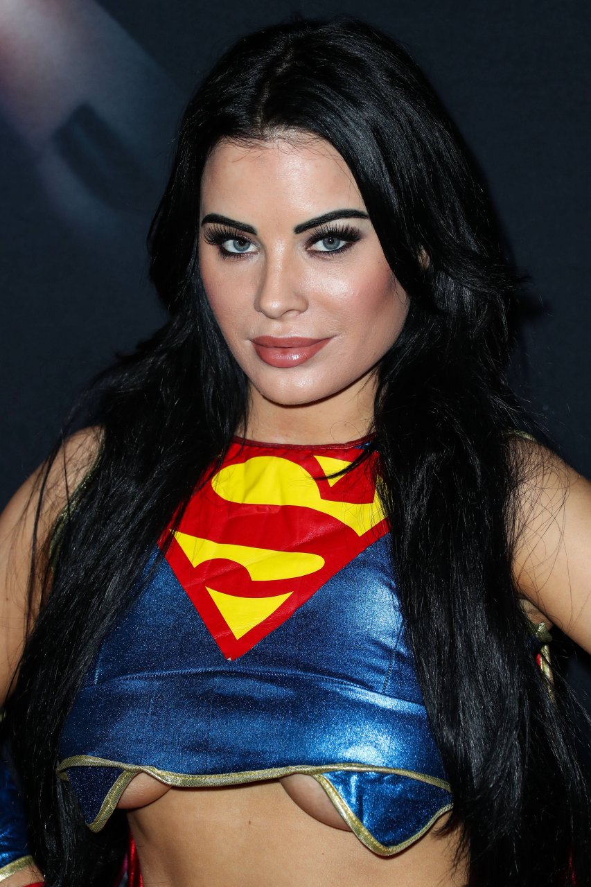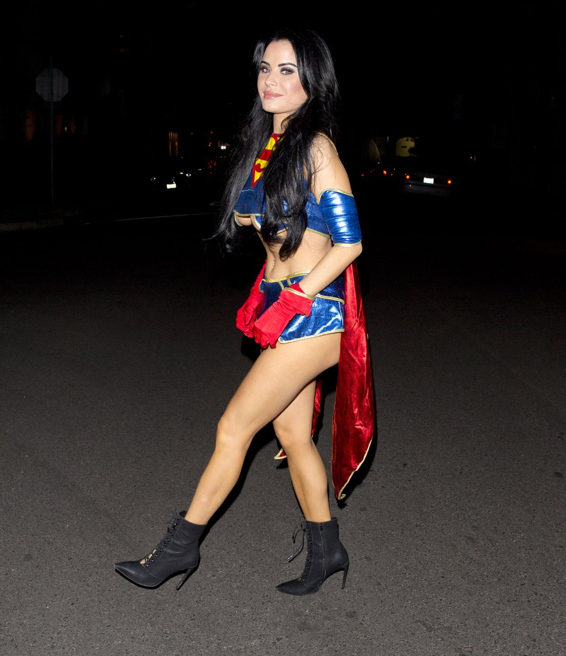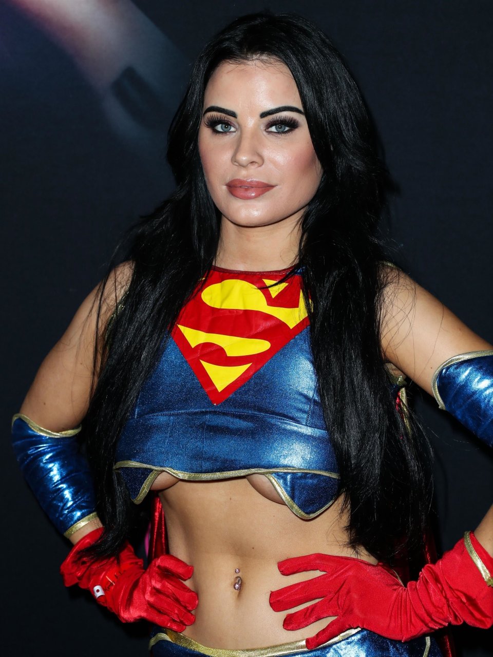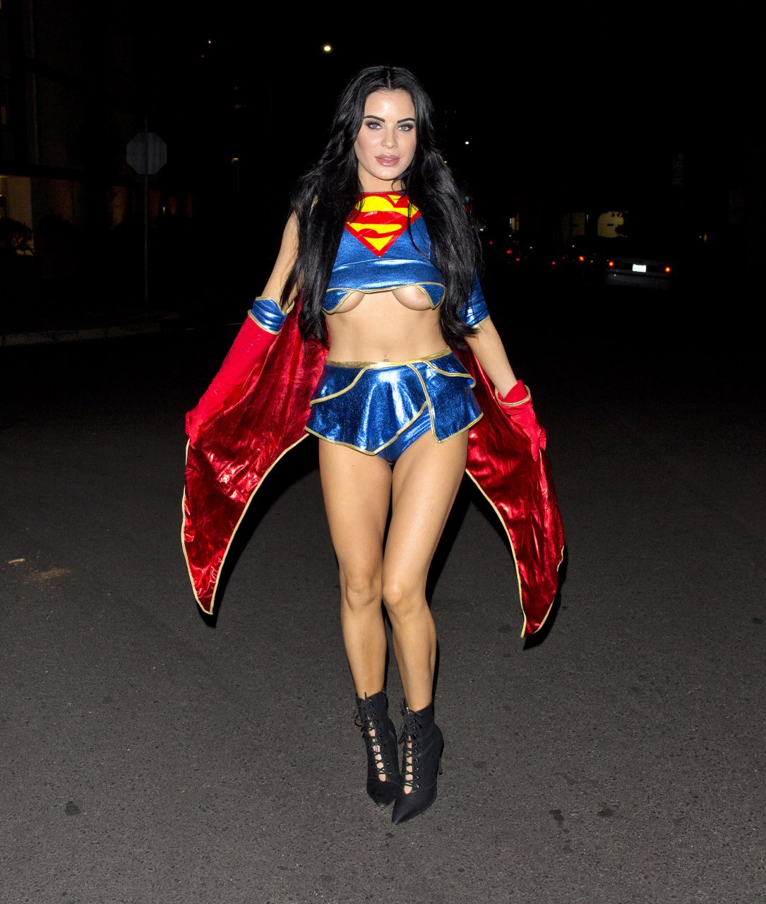 Brunette Carla Howe posa en la alfombra roja en la Fiesta de Halloween Karma en Los Ángeles, 20/10/2018. La modelo/actriz de 28 años mostró su sexy trasero y pechos con un sensual disfraz de Superman.