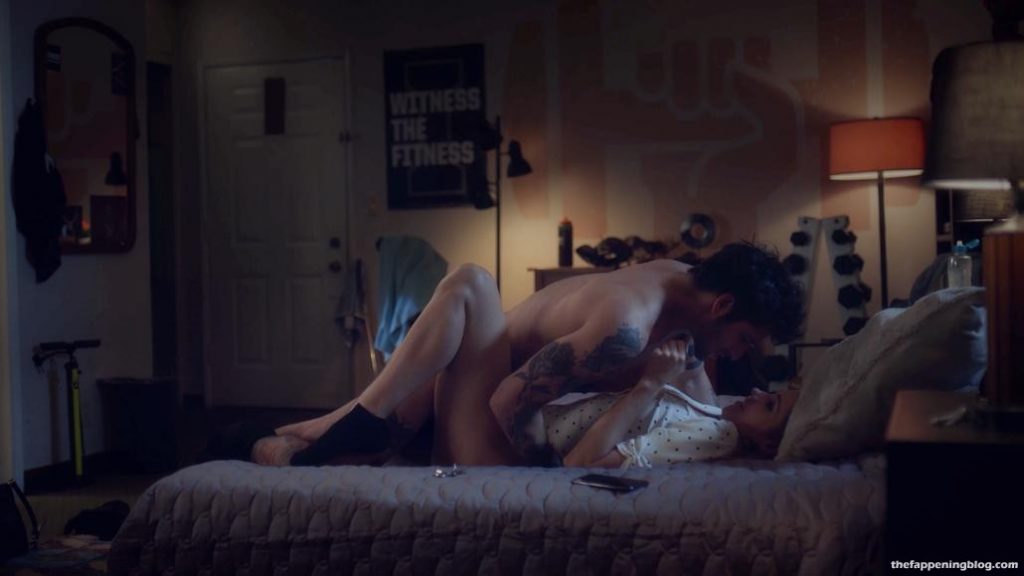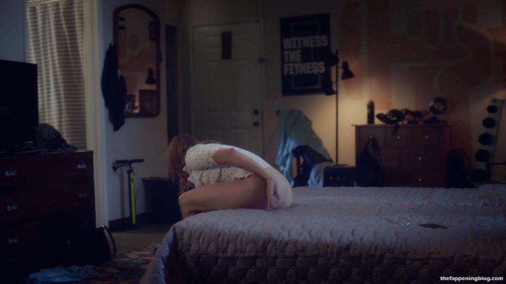 Carly Craig is lying on her back on a bed as a guy helps pull her pants and panties off. She and the guy then begin to have sex, the guy pausing to go down on her for a bit. After they have sex some more, the guy then goes into the bathroom and Carly is left on the bed bottomless, showing her butt when she sits up and leans over to pick up her panties off the floor.