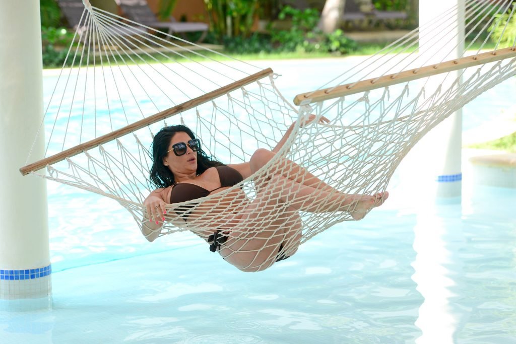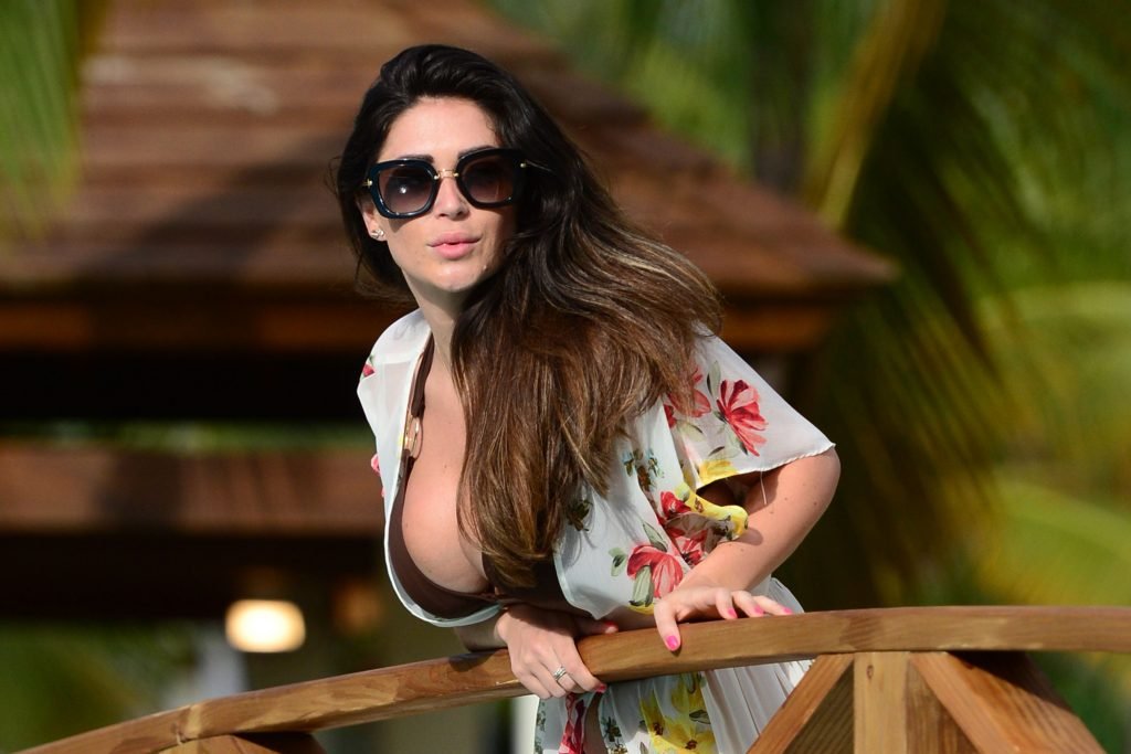 Casey Batchelor con busto lleva un bikini negro de vacaciones en República Dominicana, 15/04/2017. Casey Batchelor es una modelo y actriz (Bonded by Blood 2, 2017) de Essex. Edad – 32 años (nacida el 2 de octubre de 1984).