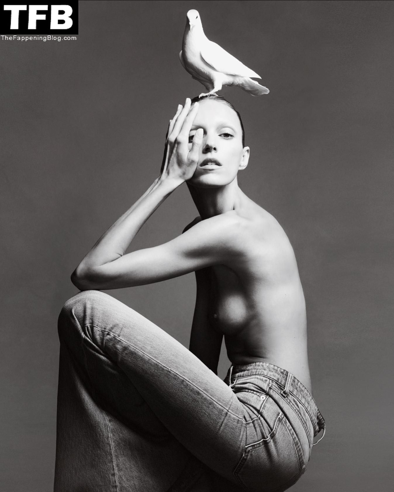 La modelo Anja Rubik aparece en la foto, mostrando sus pechos desnudos bajo un top transparente para una sesión realizada por Juergen Teller.