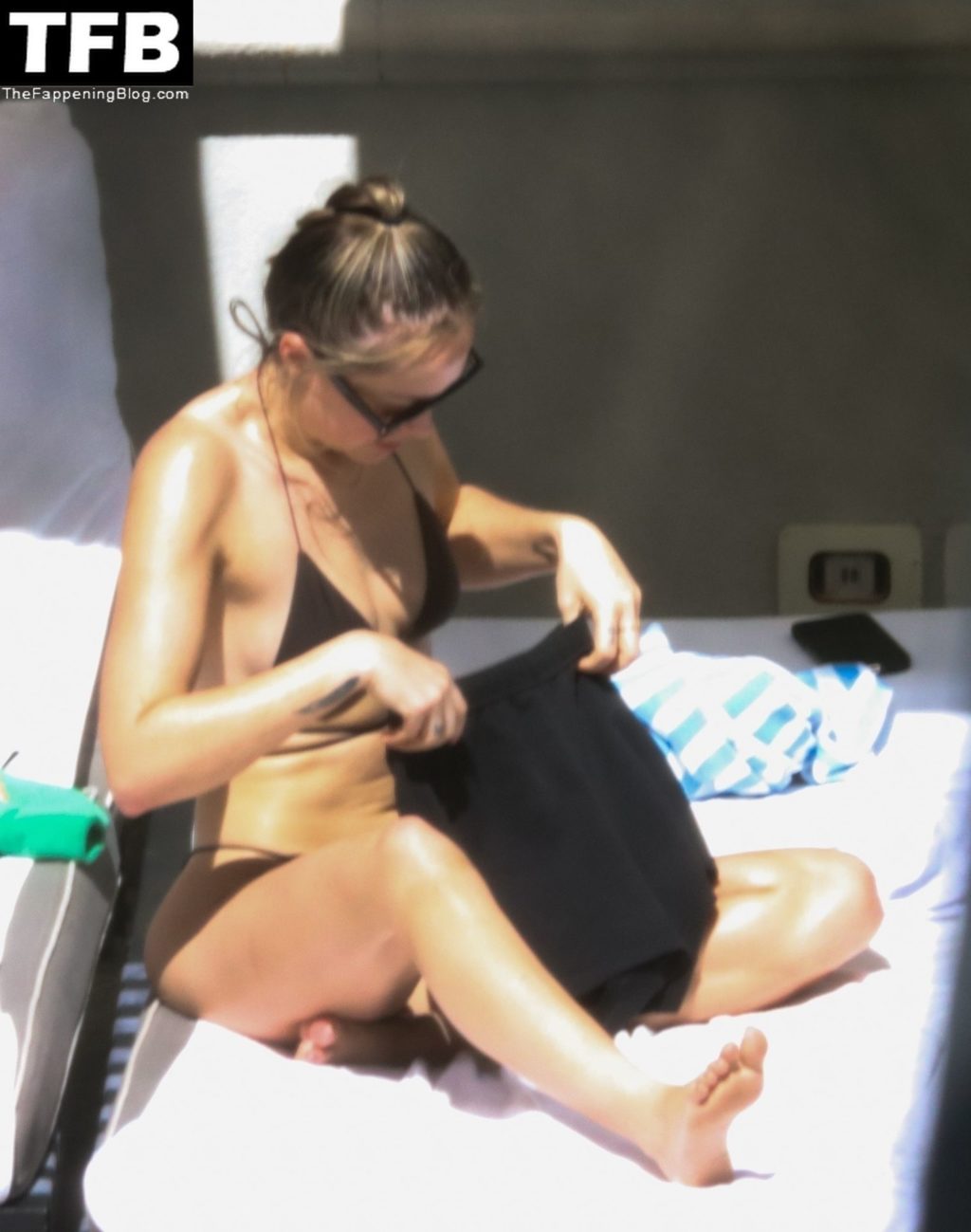 La hermana de Miley Cyrus, Brandi Cyrus, se relaja junto a la piscina de su hotel antes de su presentación en Lollapalooza en Sao Paulo, 25/03/2022.