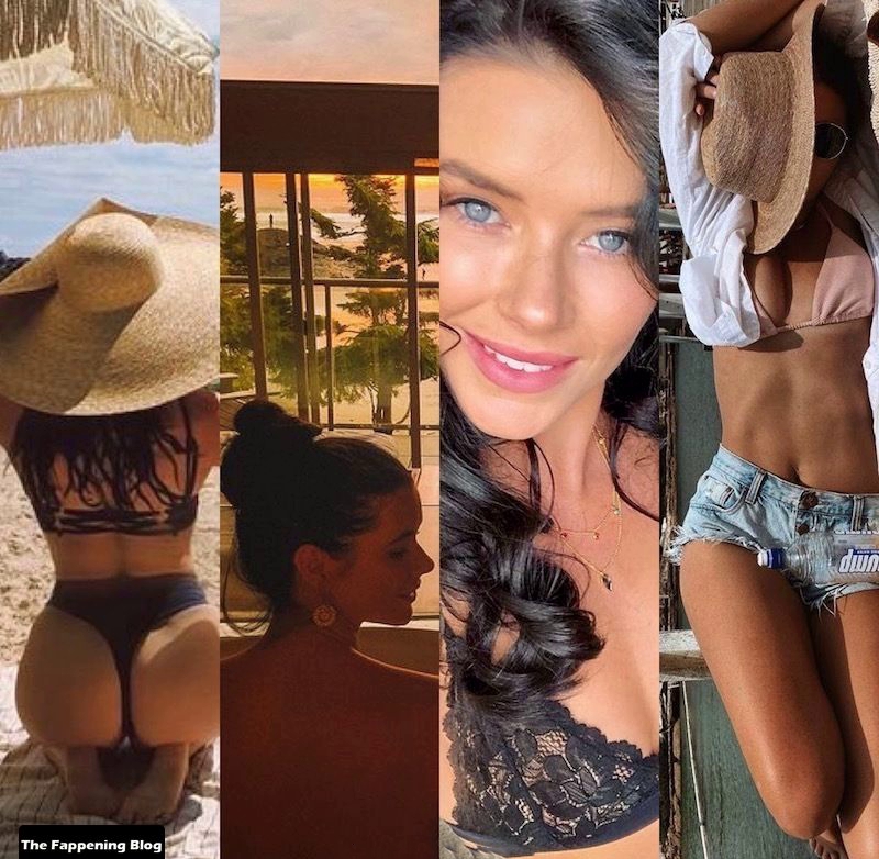 Radio DJ, personalidad mediática, presentadora de radio y autora Brittany Hockley muestra un escote increíblemente abundante en un bikini a rayas blancas y crema mientras juega con su perro mascota en la Playa Tamarama, 12/07/2023.