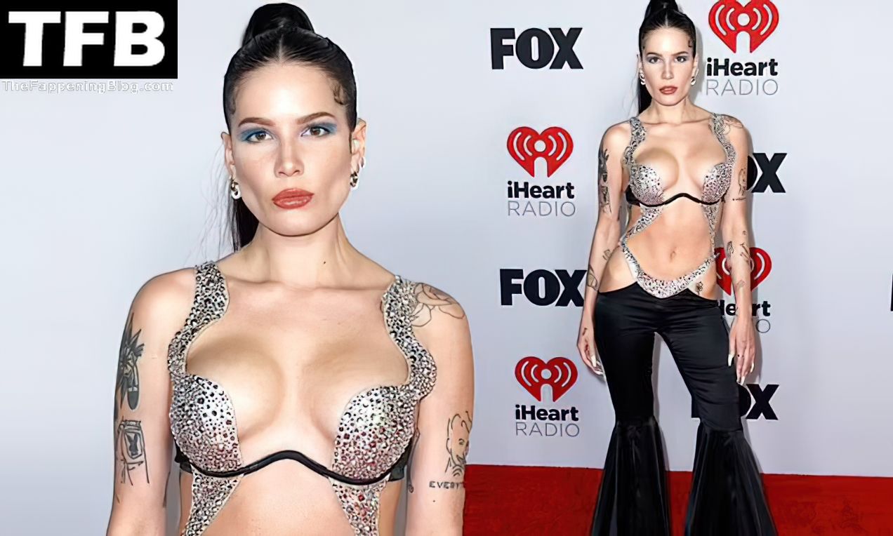 Halsey va sin sostén con un vestido negro ceñido en la fiesta de los Oscar Vanity Fair 2023 en Beverly Hills, 12/03/2023. La tela transparente es un guiño a su Instagram, y también muestra las protuberancias de los pezones en la alfombra roja.