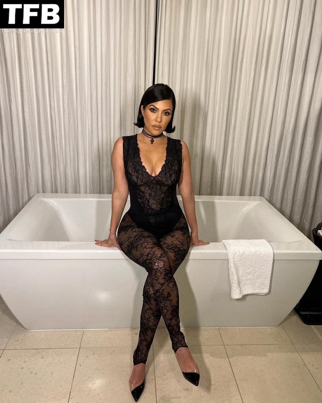 La estrella de la televisión de realidad Kourtney Kardashian muestra un bonito escote mientras posa con lencería negra de encaje antes del desfile AMIRI Otoño-Invierno 2022 en Los Ángeles, 11/02/2022.