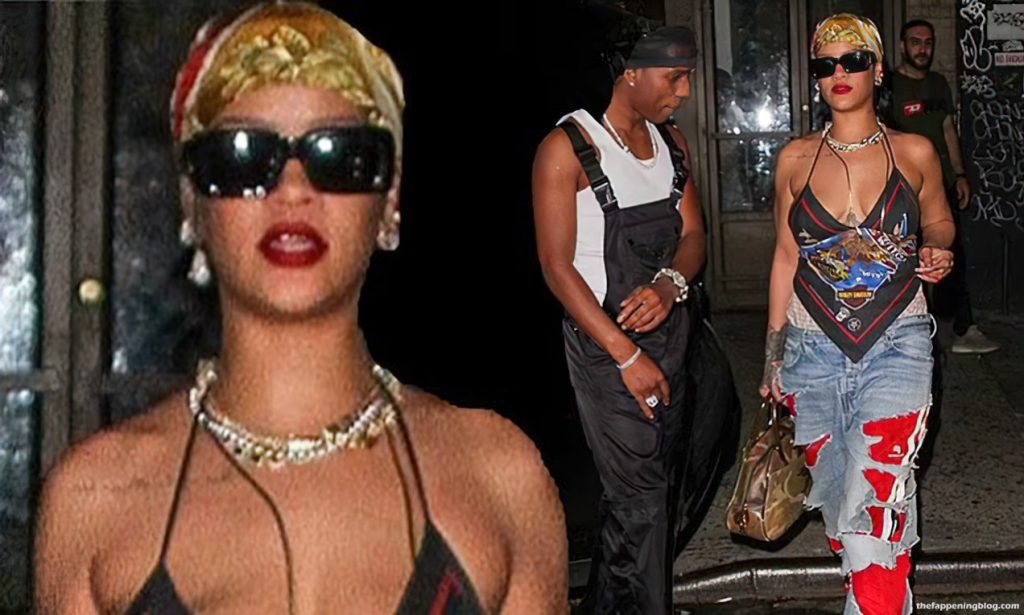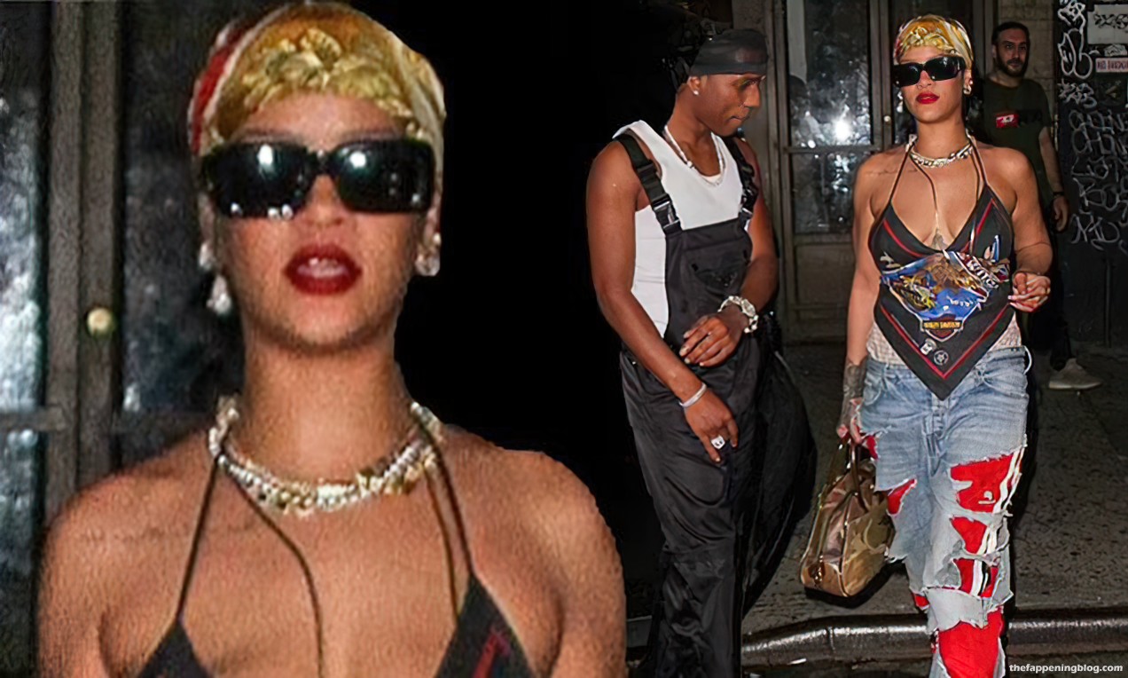 Rihanna disfruta de una noche en Nueva York con un top de bandana Harley de escote bajo y jeans rasgados sobre sus pantalones deportivos – Nueva York, 08/12/2021.