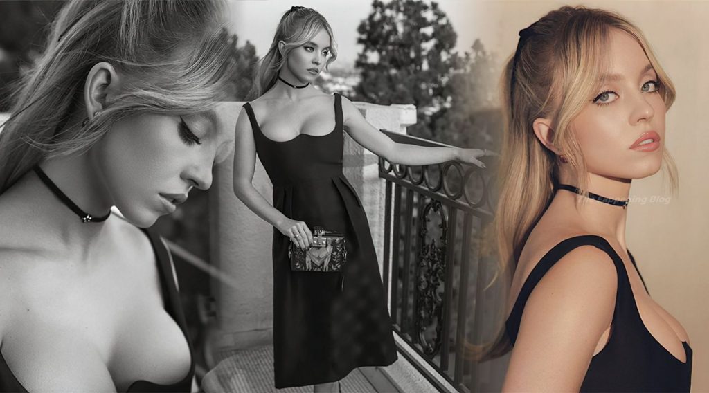 Actriz Sydney Sweeney muestra sus magníficos pechos posando con un elegante vestido negro en una sesión de fotos promocional de Elias Tahan (agosto 2021).