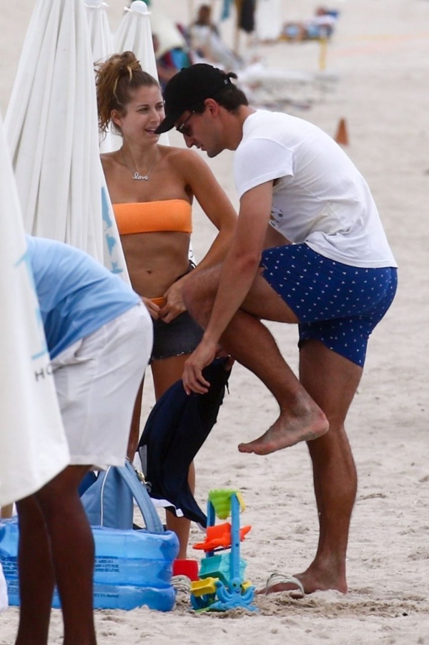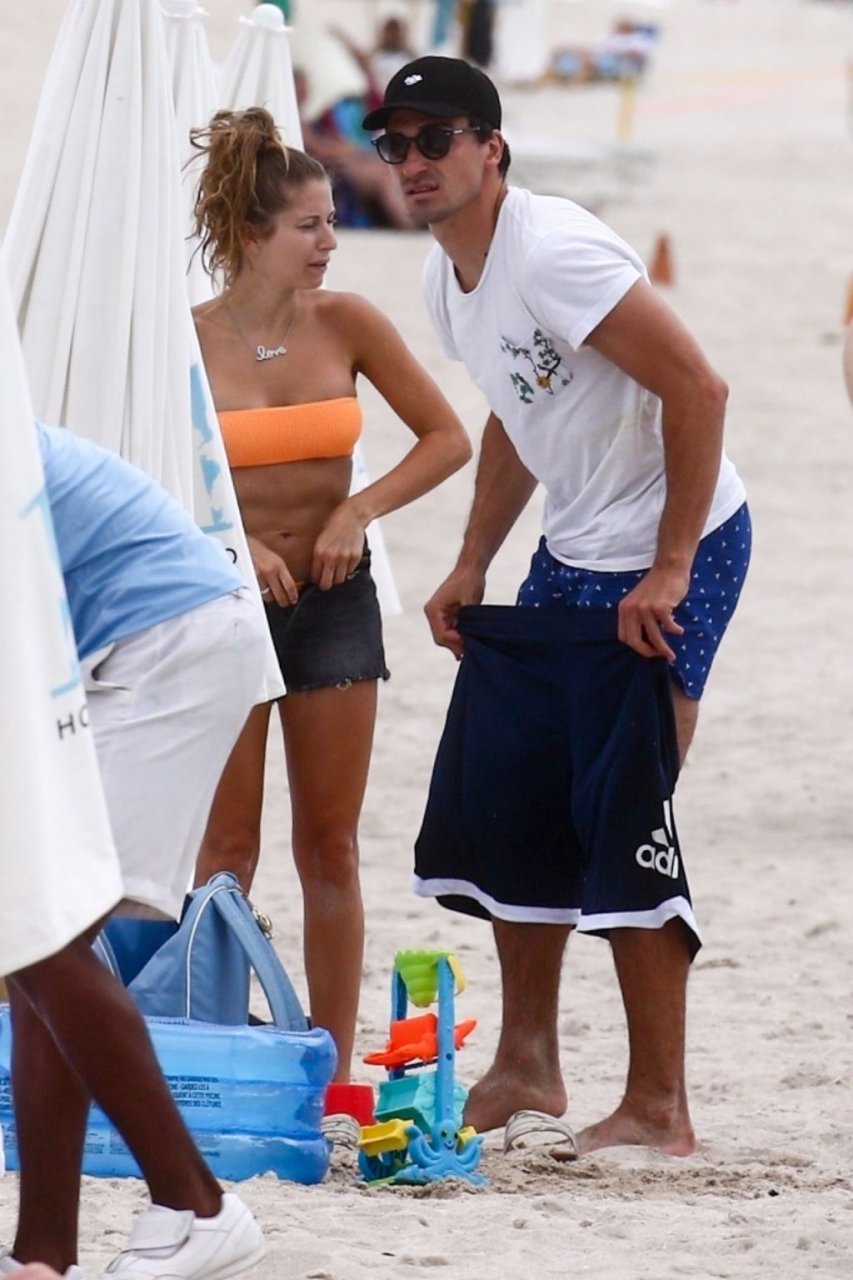 Cathy Hummels lleva un bikini bandeau naranja mientras disfruta de la playa con su esposo Mats Hummels y su hijo en Miami, 13/06/2019. Cathy mostró su cuerpo después del embarazo y se refrescó en el agua.