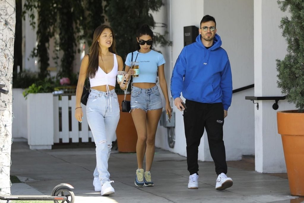 Modelo y DJ Chantel Jeffries está lista para el verano mientras sale con amigos en Los Ángeles, 10/04/2019. La modelo lleva un crop top azul bebé con la inscripción “Too Busy” y shorts de mezclilla de cintura alta y corte. Chantel completa su look con las codiciadas Sean Wotherspoon Air Max 97/1, las zapatillas perfectas para el verano.