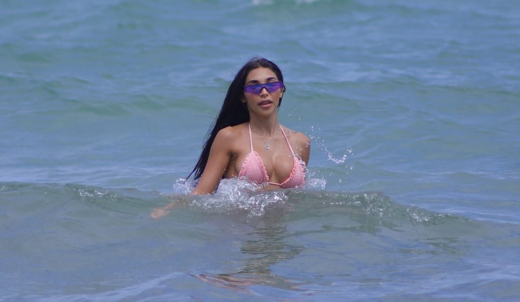 Chantel Jeffries muestra su cuerpo tonificado mientras se moja en el océano con un traje de baño Revolve rosa intenso mientras arrasa en Miami Swimweek con una amiga en South Beach, 12/07/2019.