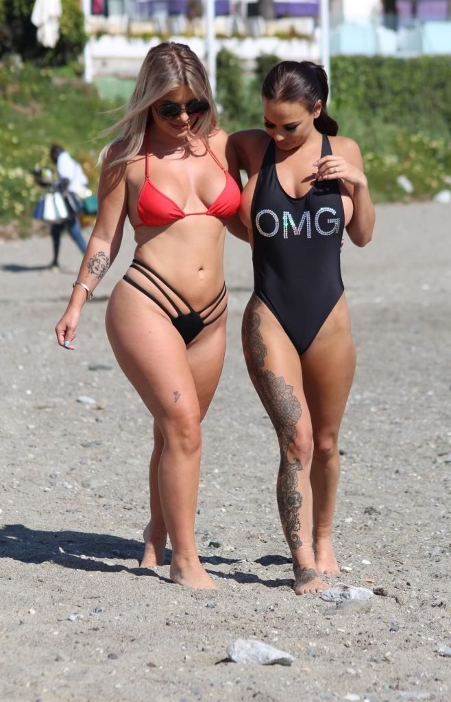 Former Geordie Shore (TV) babe Chantelle Connelly fue vista con Lois Molloy (Serene Cosmetic) aplicándose crema solar mutuamente mientras estaban en la playa en Marbella, 05/10/2018. Chantelle voló para una consulta antes de su segundo procedimiento con el servicio de cirugía estética de lujo. Lois apareció con un sexy bikini rojo mientras Chantelle deslumbraba a los turistas con su traje de baño negro OMG.