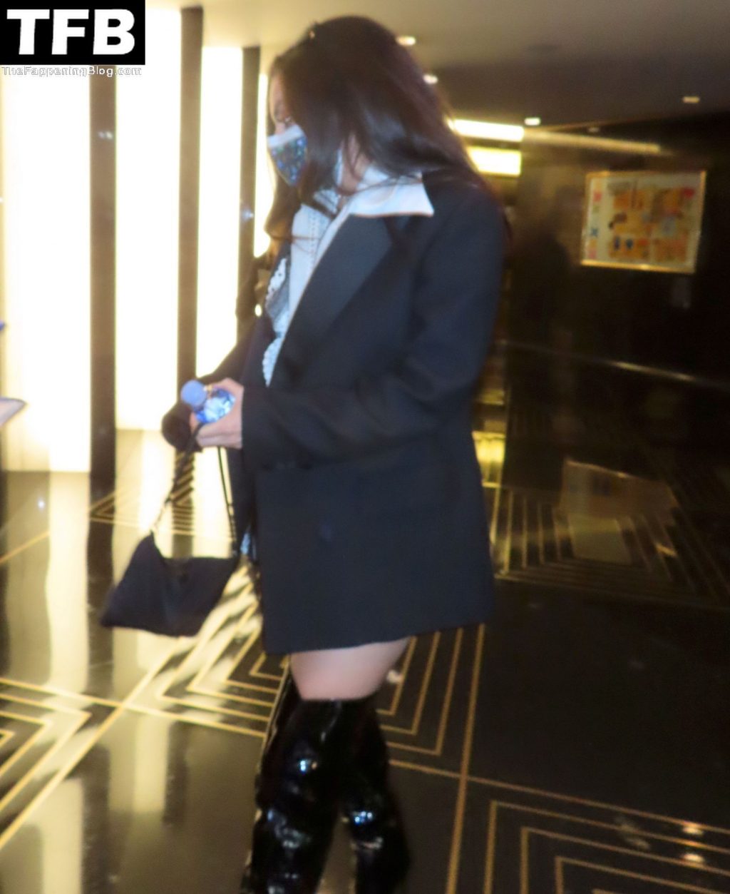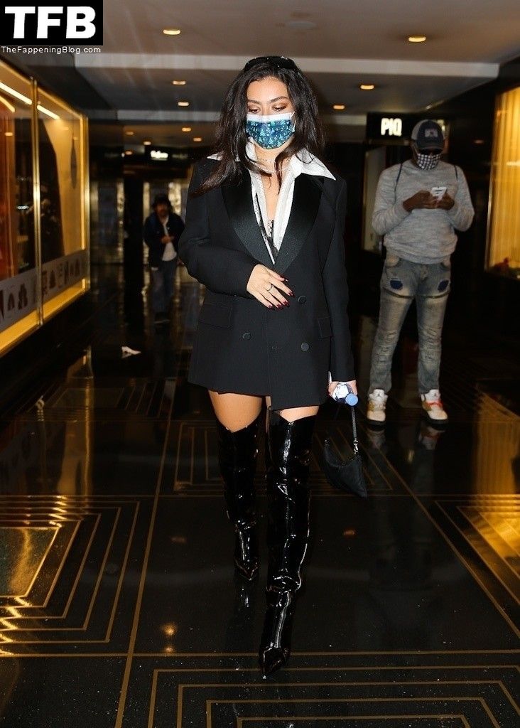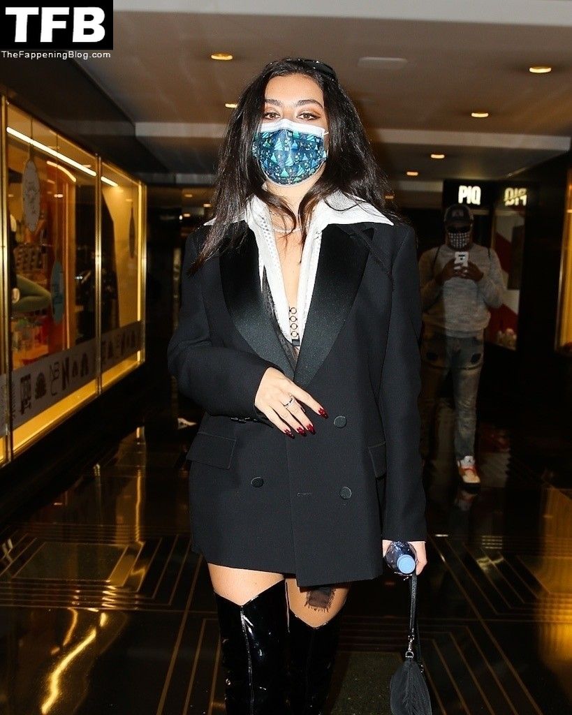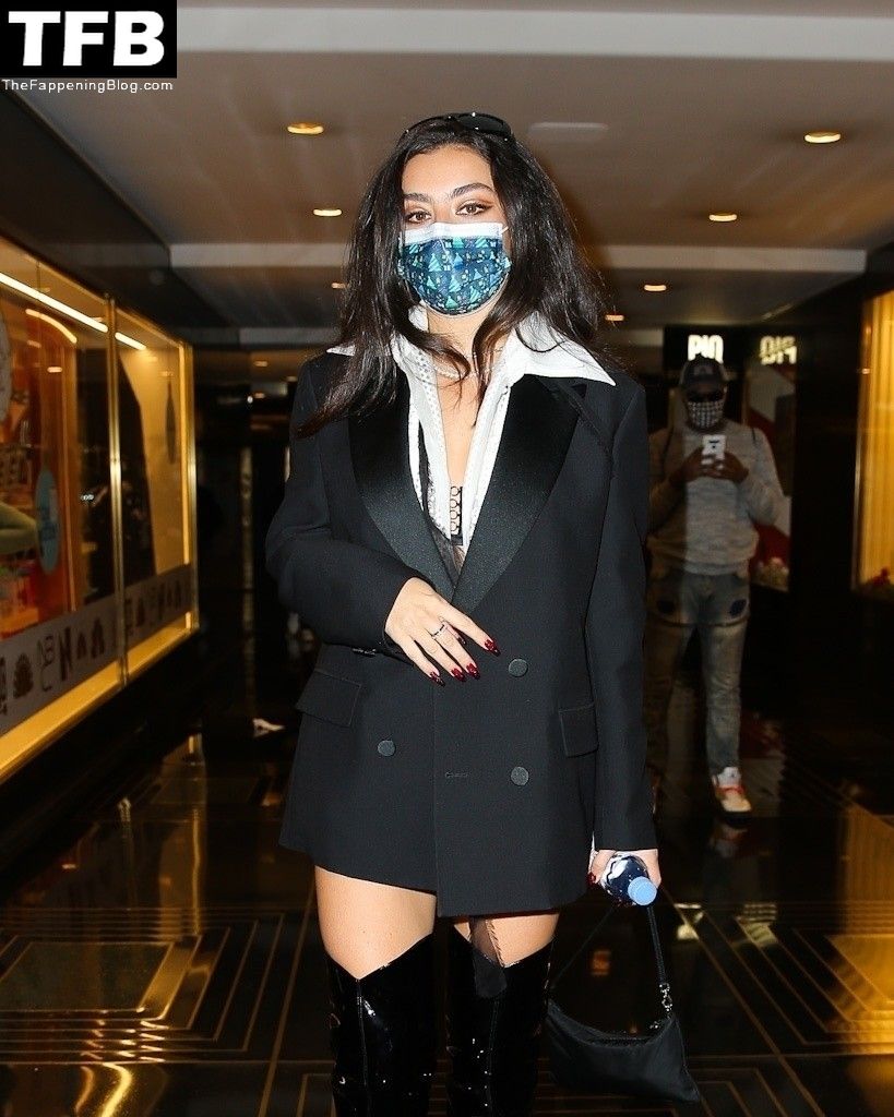 Singer Charli XCX expone su pecho desnudo con el pezón visible mientras lleva un sostén transparente al llegar a los ensayos de Saturday Night Live en los estudios de NBC en Nueva York, 16/12/2021.