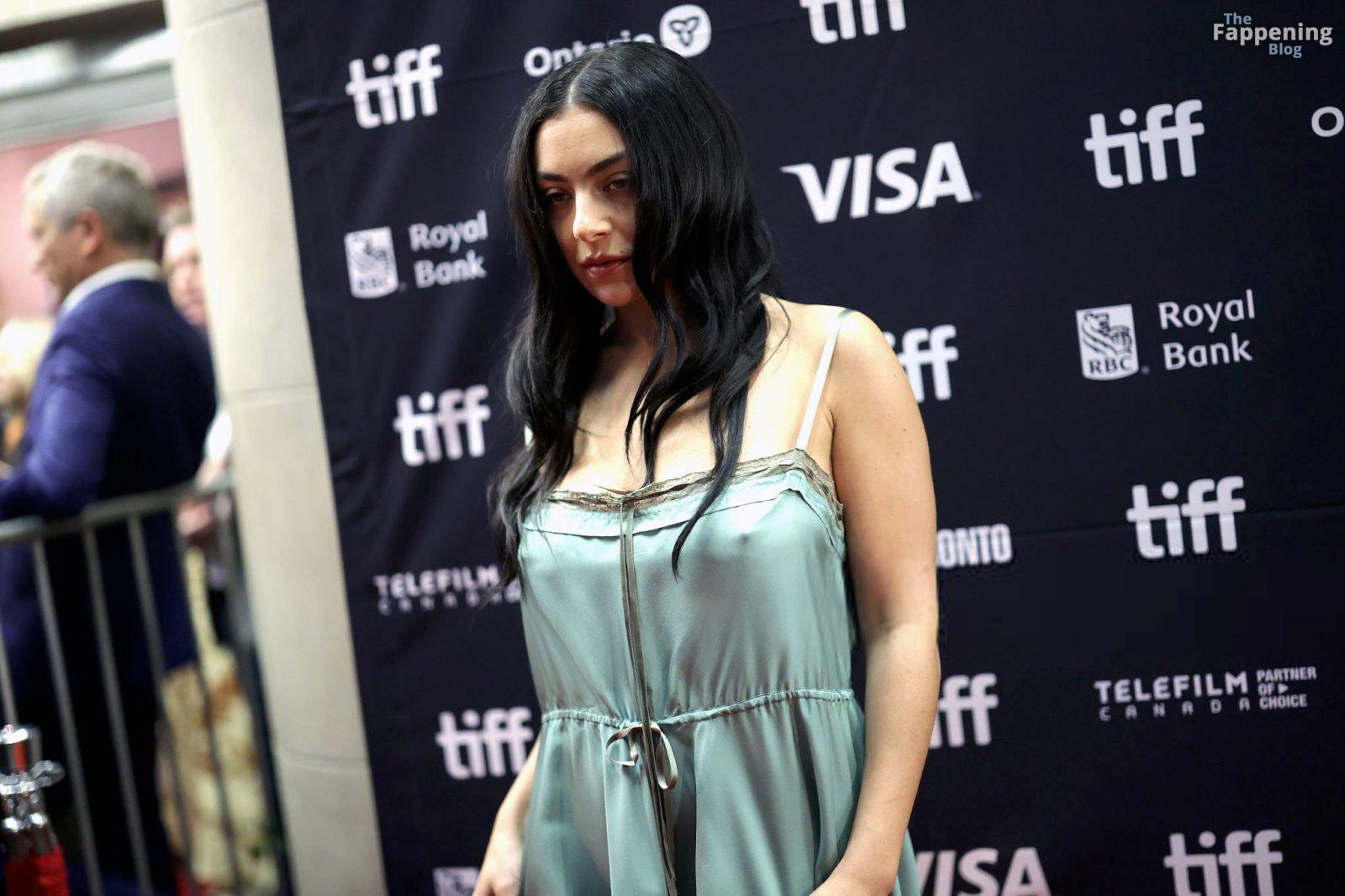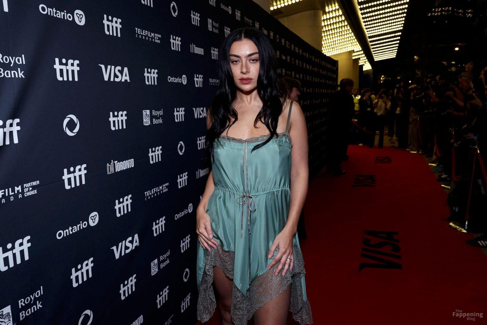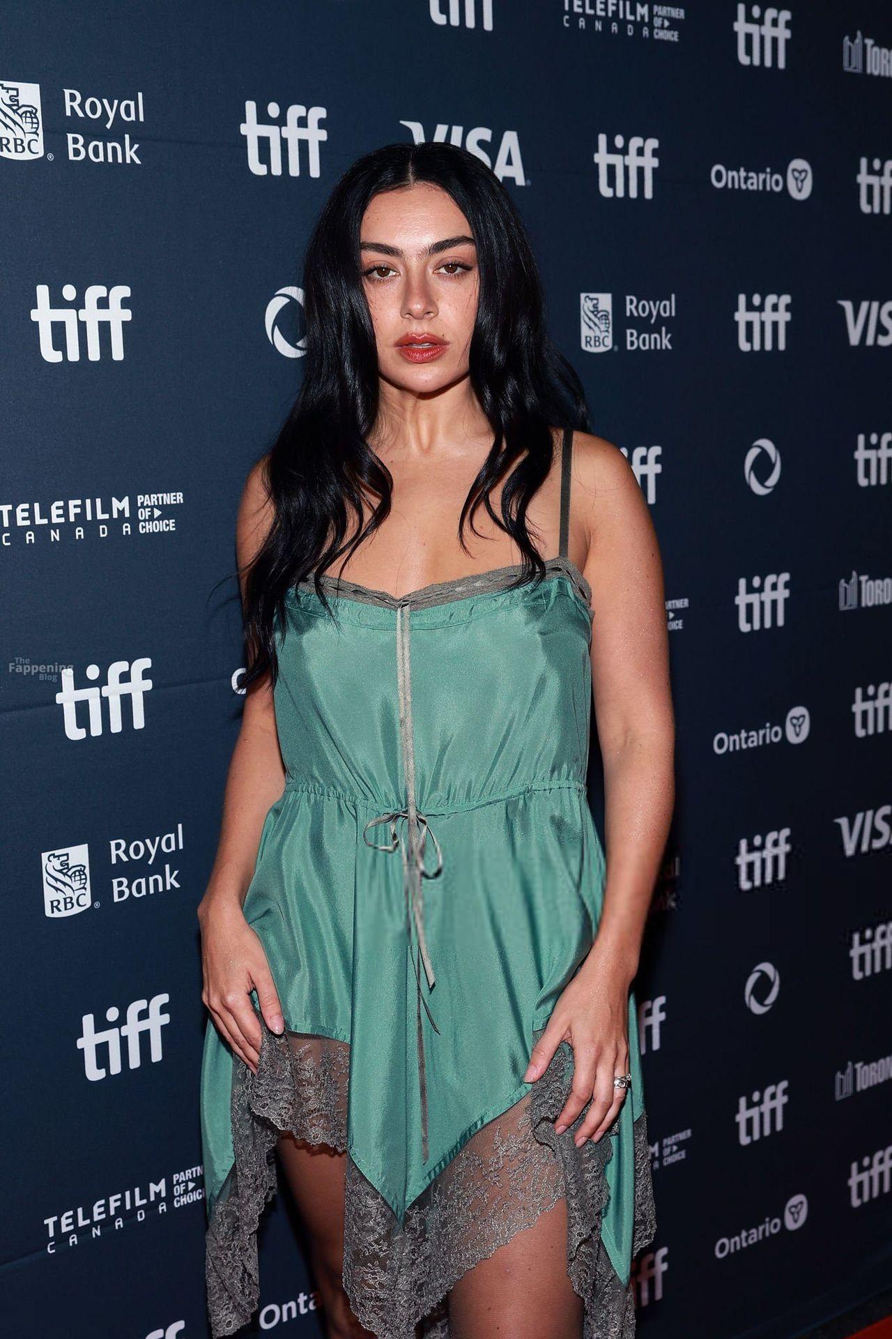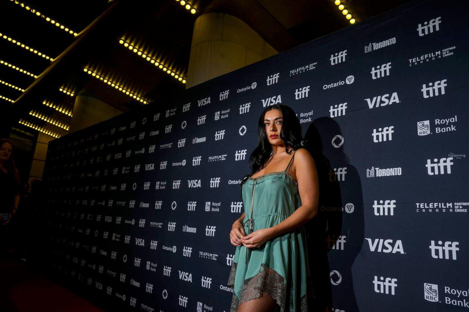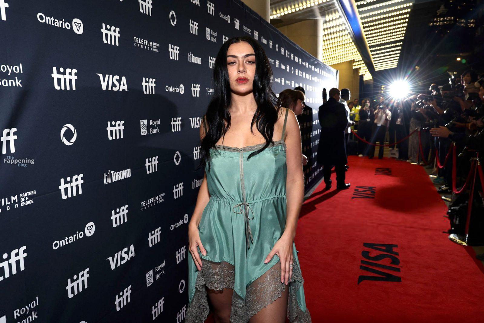 Charli XCX deslumbra en TIFF con un slip de encaje sedoso, mostrando escote y piernas en la alfombra roja del estreno de “Sacrifice”.