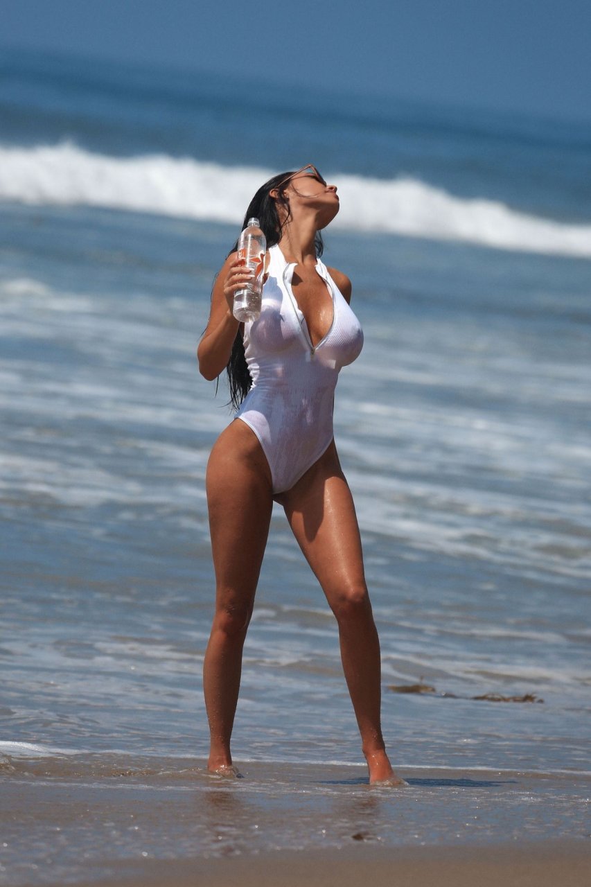 Playmate de Playboy Charlie Riina (34) muestra su sexy cuerpo en bikini con un traje de cuerpo transparente mientras realiza una sesión de fotos en la playa para 138 Water con el fotógrafo Lee LHGFX en Santa Mónica, 25/11/2018.