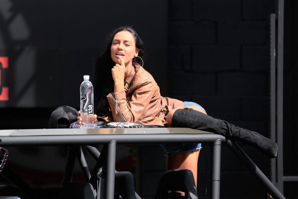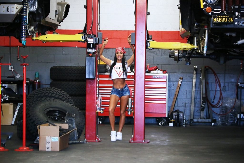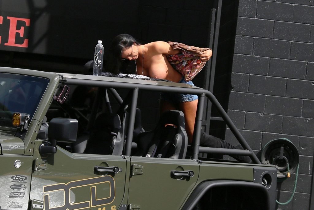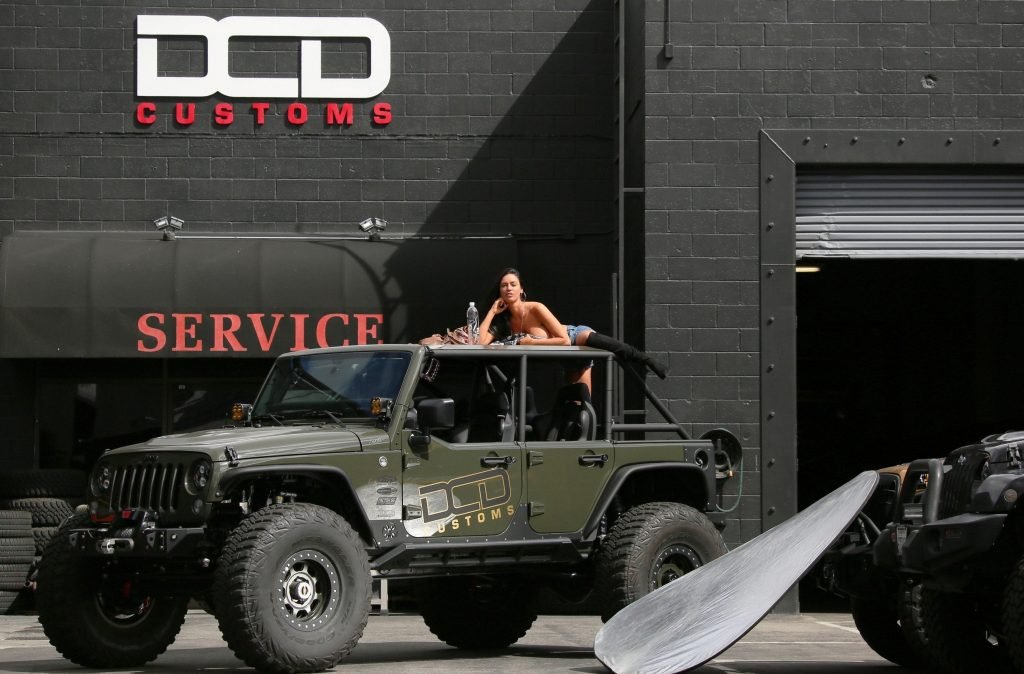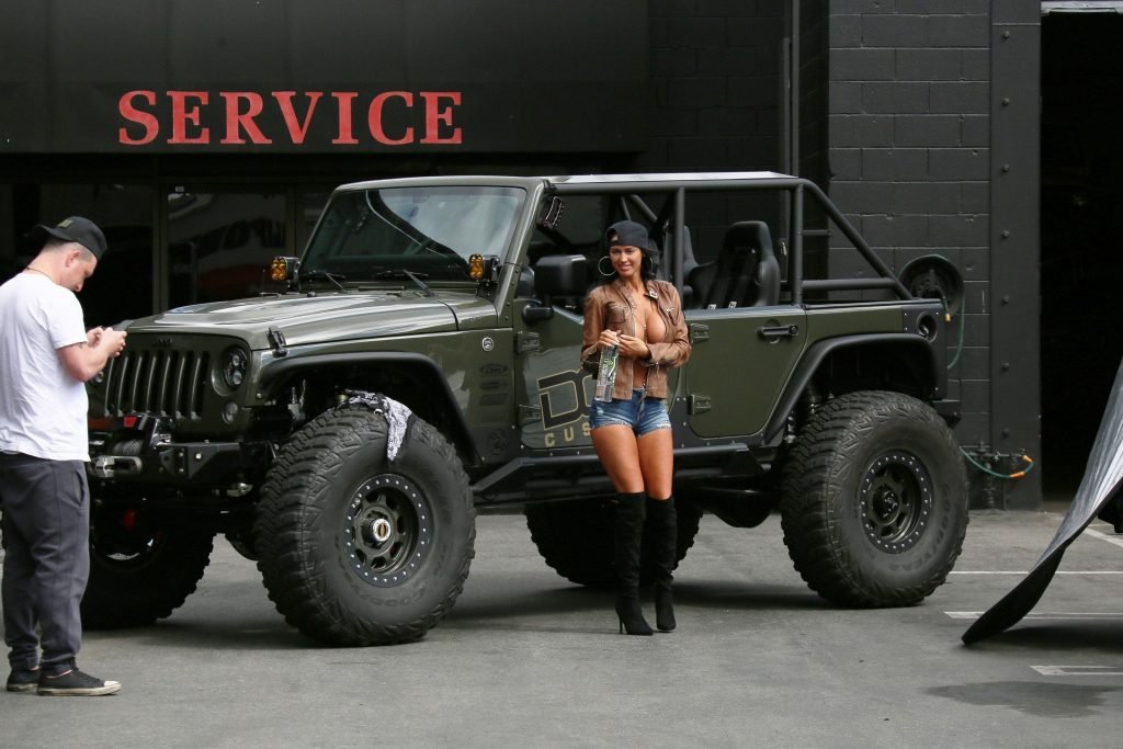 International Playmate of the Year & la modelo caliente de Guess Charlie Riina realiza una nueva campaña 138 Water en JEEP DCD Customs en Calabasas, California, 21/03/2018. Charlie Riina mostró sus grandes pechos falsos y trasero con shorts de mezclilla. Necesitamos un mecánico para revisar el frente y la parte trasera.
