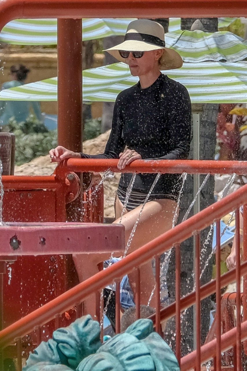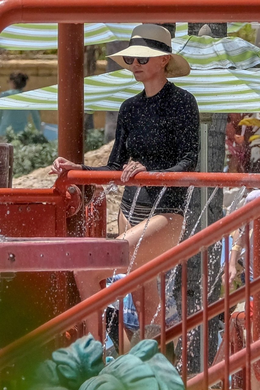 La estrella de Hollywood Charlize Theron (43) lleva a su mamá Gerda y a sus dos hijos Jackson y August al mundialmente famoso Atlantis Bahamas Resort, 17/08/2018. El grupo feliz disfrutó de las cálidas y cristalinas aguas de la playa y se relajó en el pintoresco Paseo por el Río Perezoso.