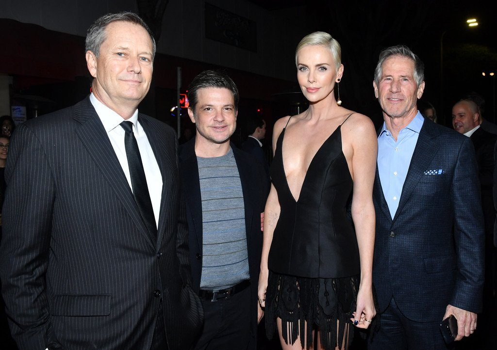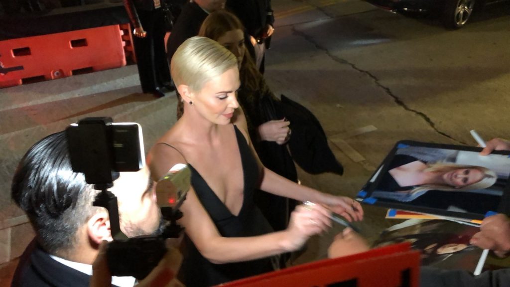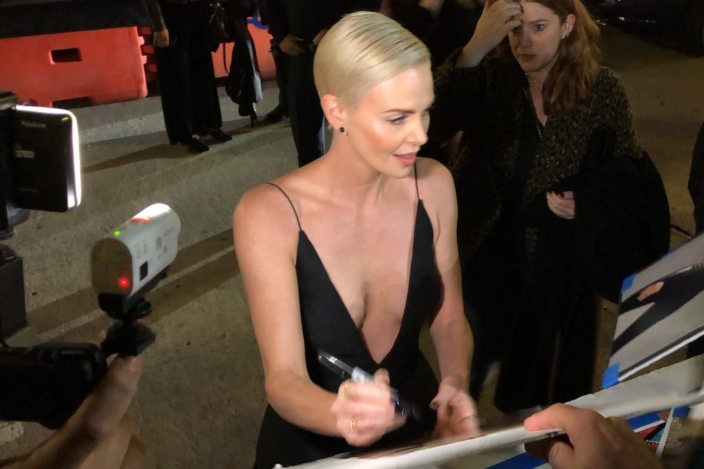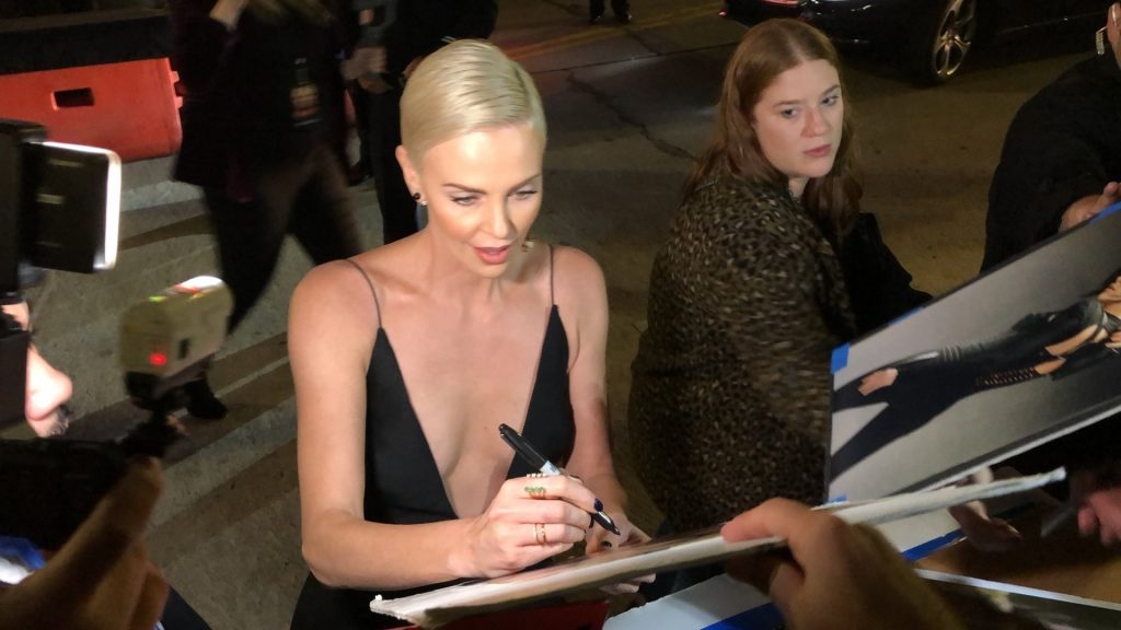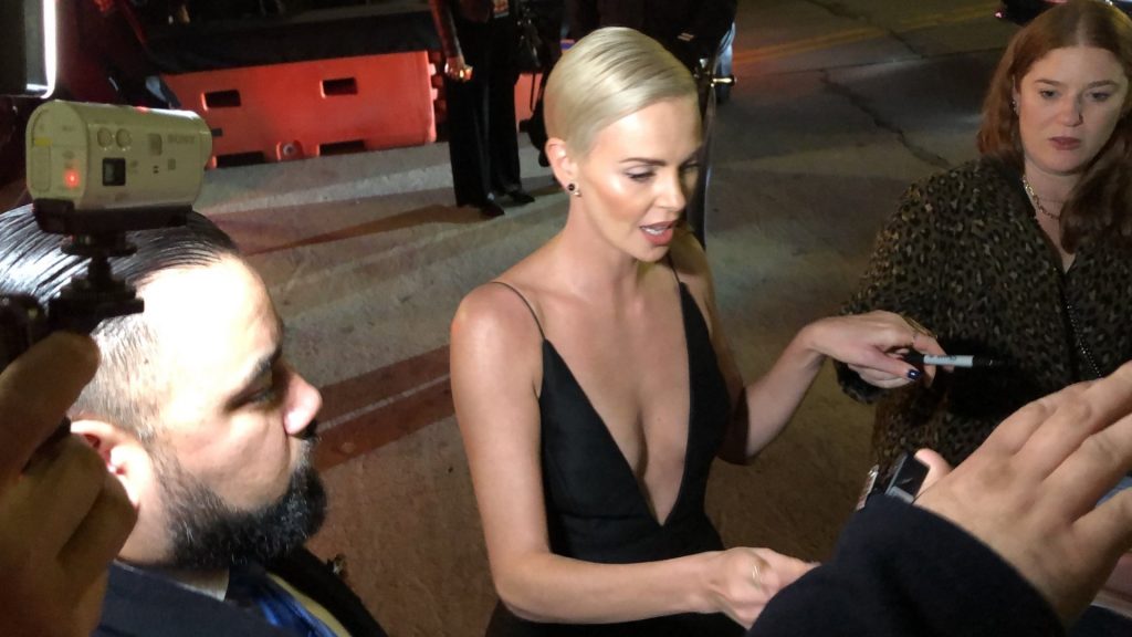 Charlize Theron mostró su escote y sus piernas esbeltas en la proyección especial de ‘Bombshell’ en el Regency Village en Los Ángeles, California, 12/10/2019. La actriz también saludó a los fans con un sexy vestido negro con escote pronunciado.