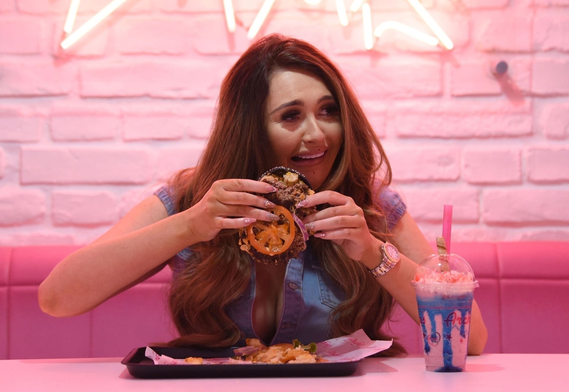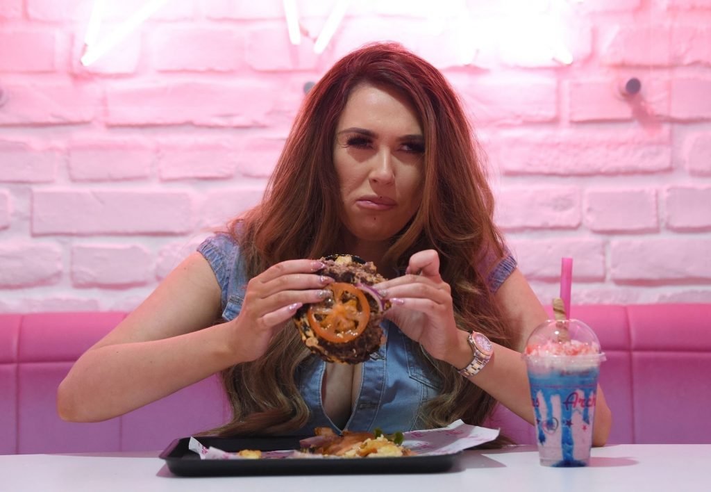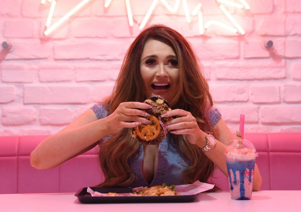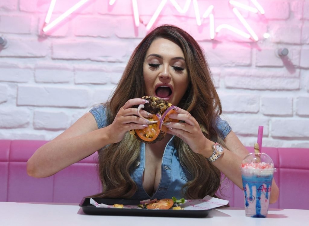 La estrella de reality Charlotte Dawson disfruta de su enorme hamburguesa en Archie’s Burger and Milkshake bar después de un largo día asistiendo a la sesión de fotos de fredafunk en Manchester, 21/03/2019. ¡Disfruta tu comida!