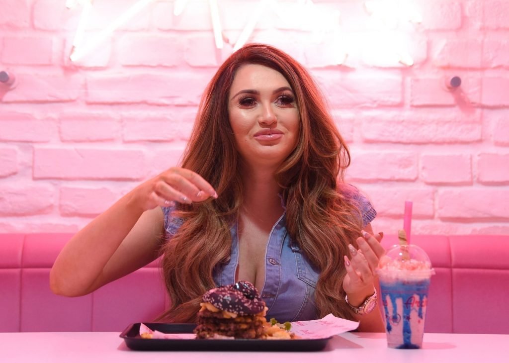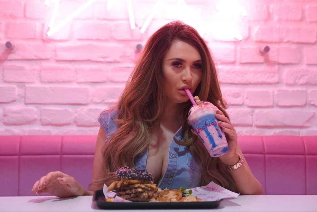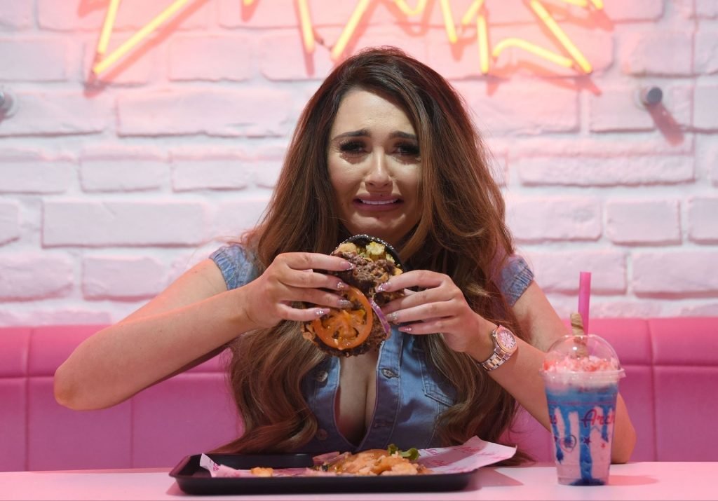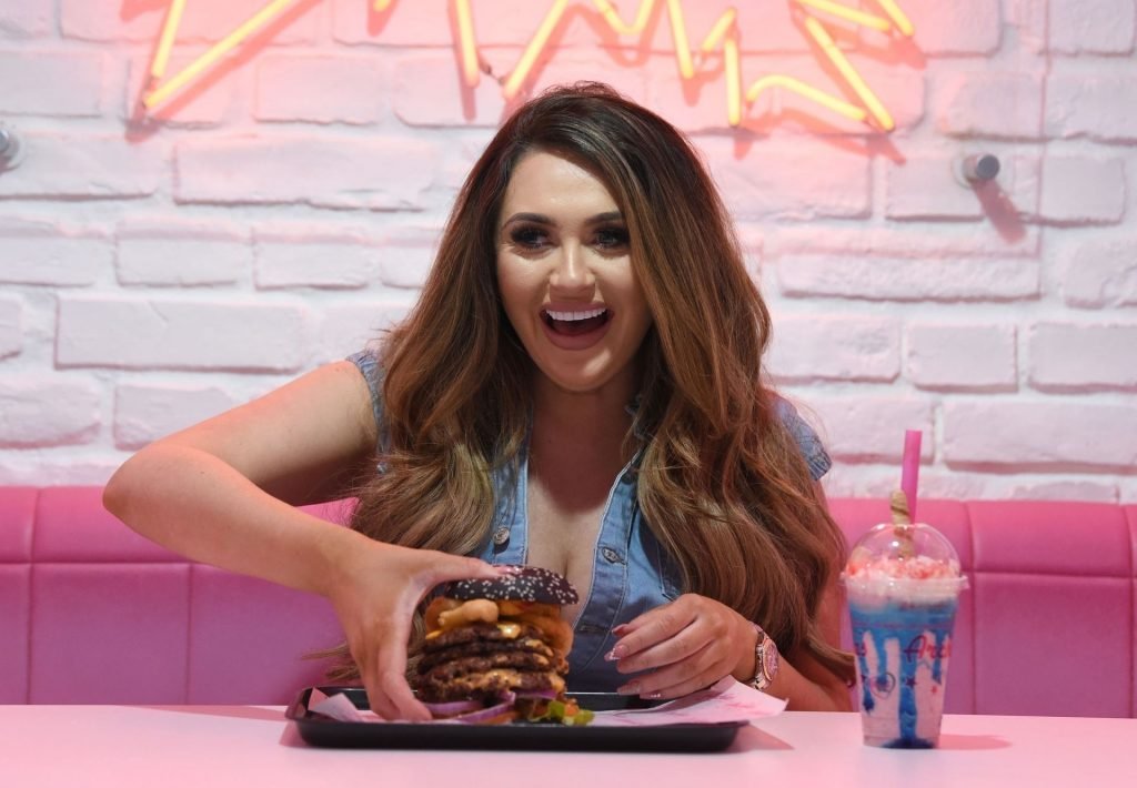 La estrella de reality Charlotte Dawson disfruta de su enorme hamburguesa en Archie’s Burger and Milkshake bar después de un largo día asistiendo a la sesión de fotos de fredafunk en Manchester, 21/03/2019. ¡Disfruta tu comida!