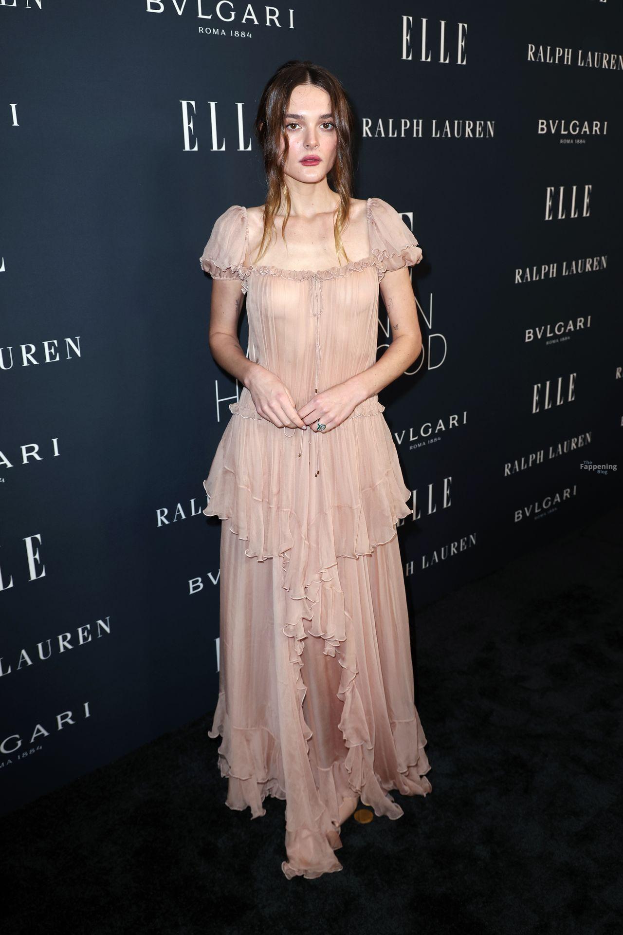 La cantante Charlotte Lawrence fue fotografiada con un vestido transparente color nude en la celebración de Mujeres en Hollywood 2025 de ELLE presentada por Ralph Lauren y Bvlgari en Los Ángeles, California.