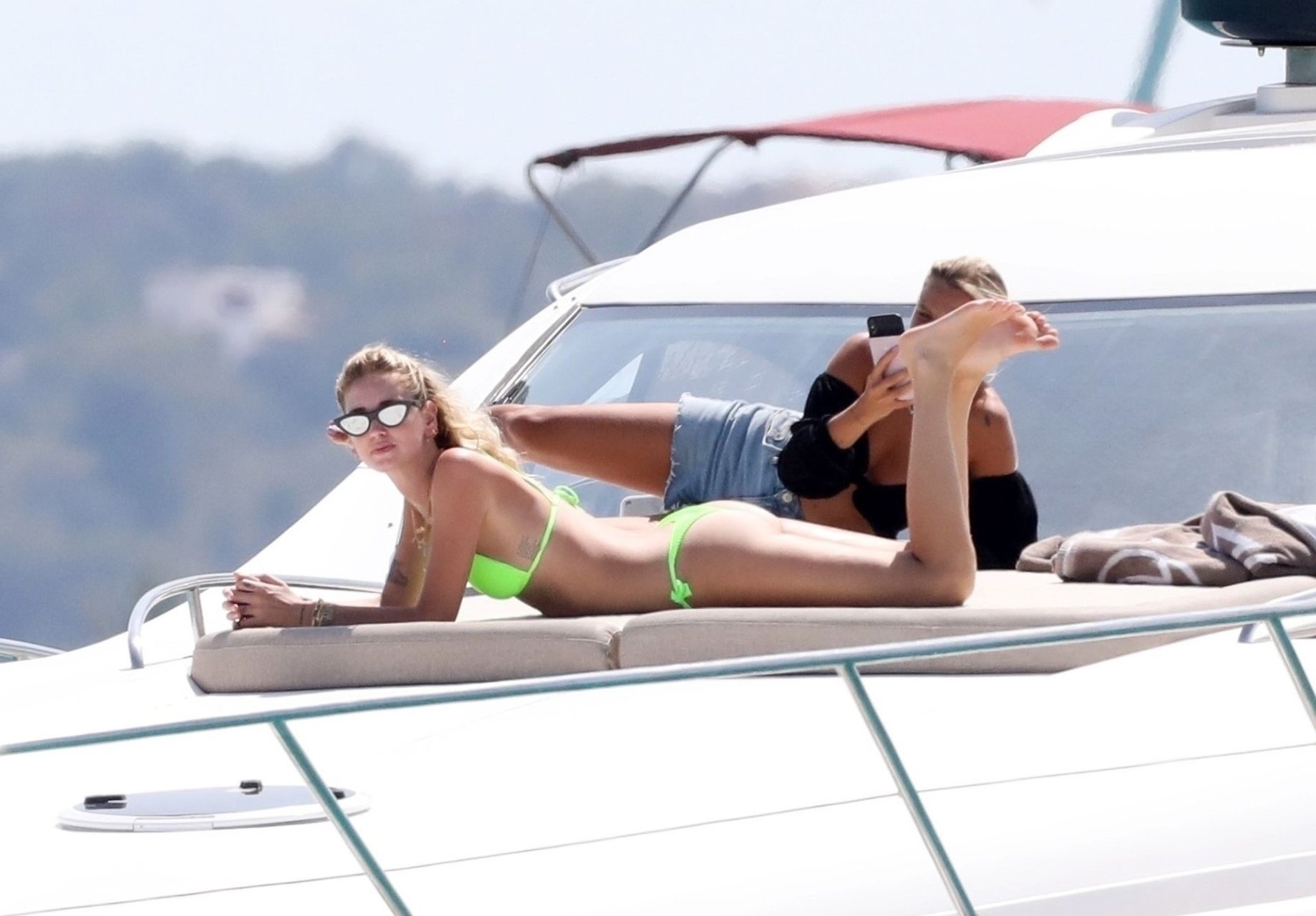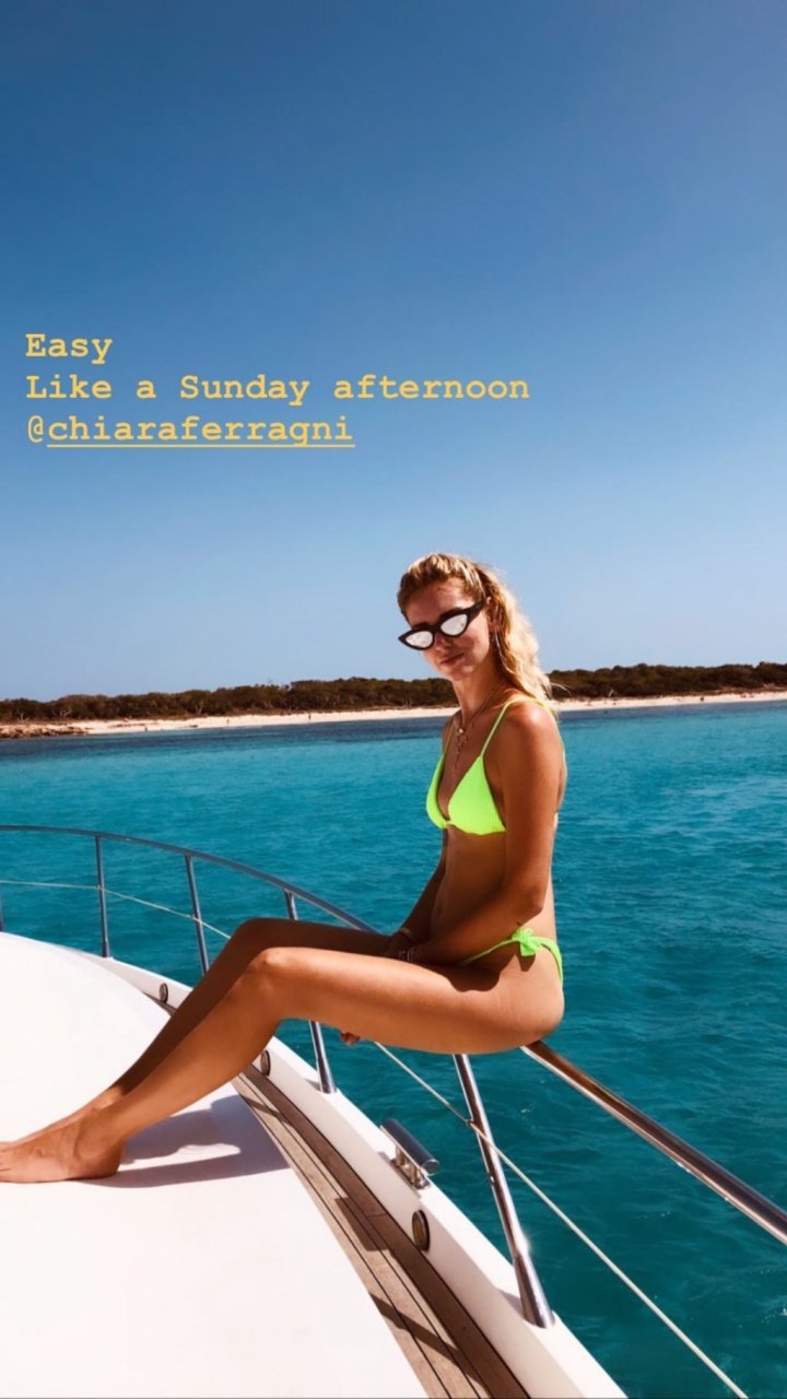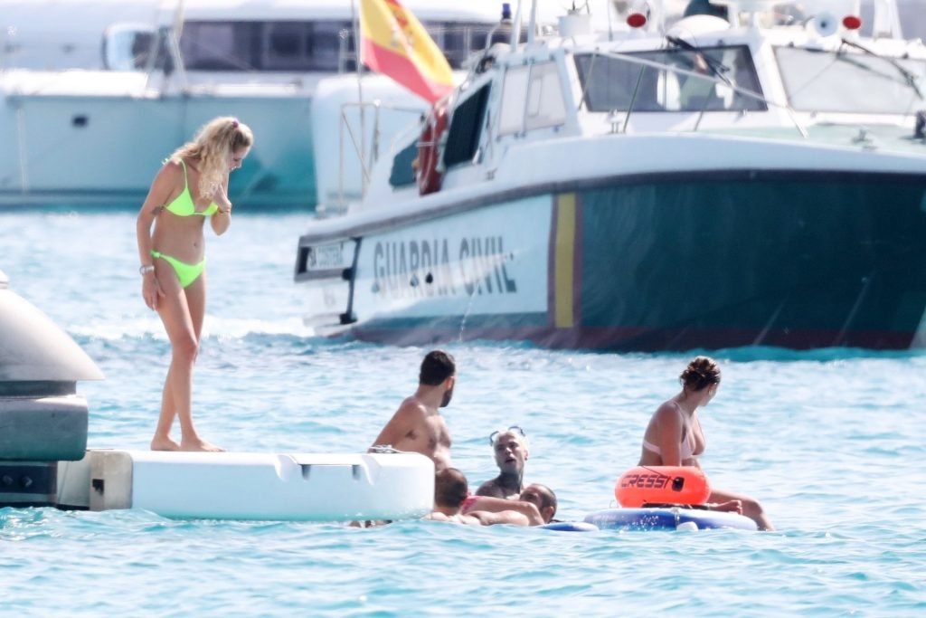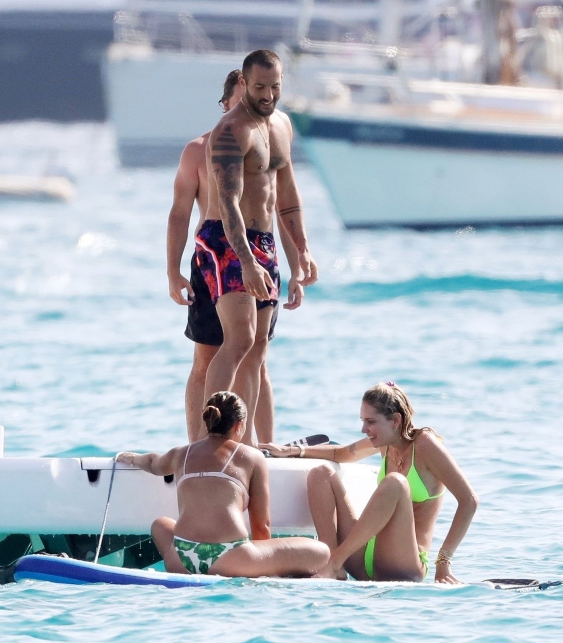 Chiara Ferragni fue fotografiada con su esposo Fedez disfrutando de sus vacaciones en Formentera, 08/04/2019. Chiara Ferragni fue vista con un bikini de dos piezas de neón brillante y Fedez con pantalones cortos estampados, camiseta blanca y zapatillas.