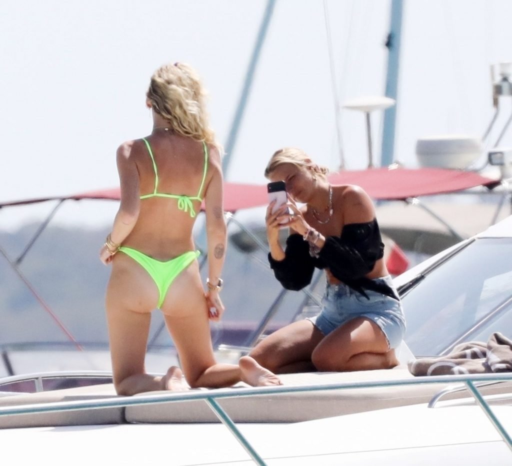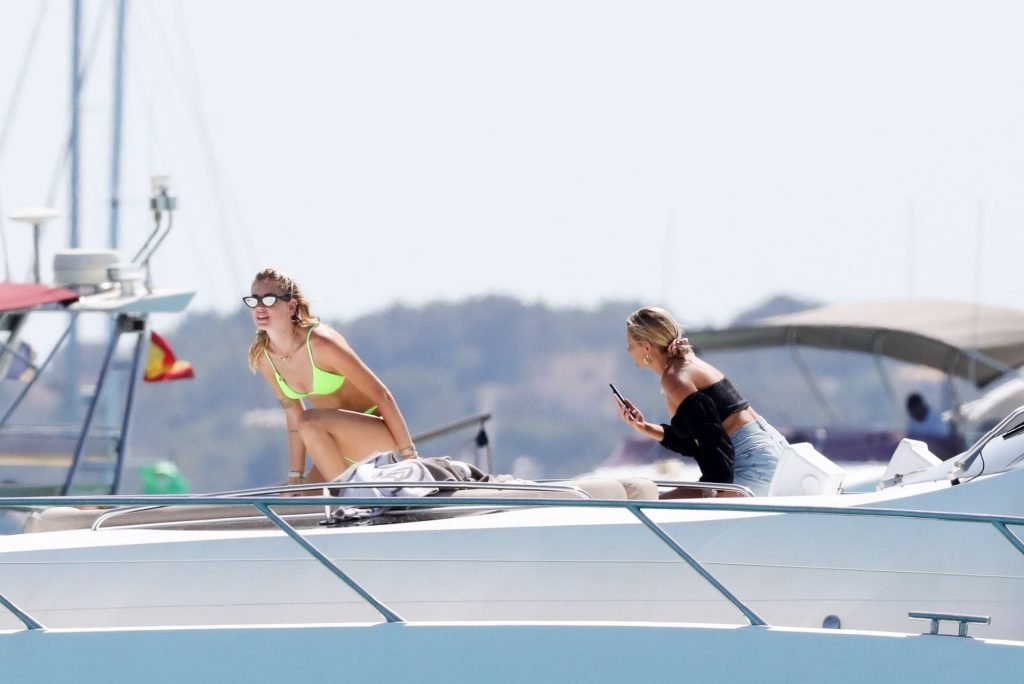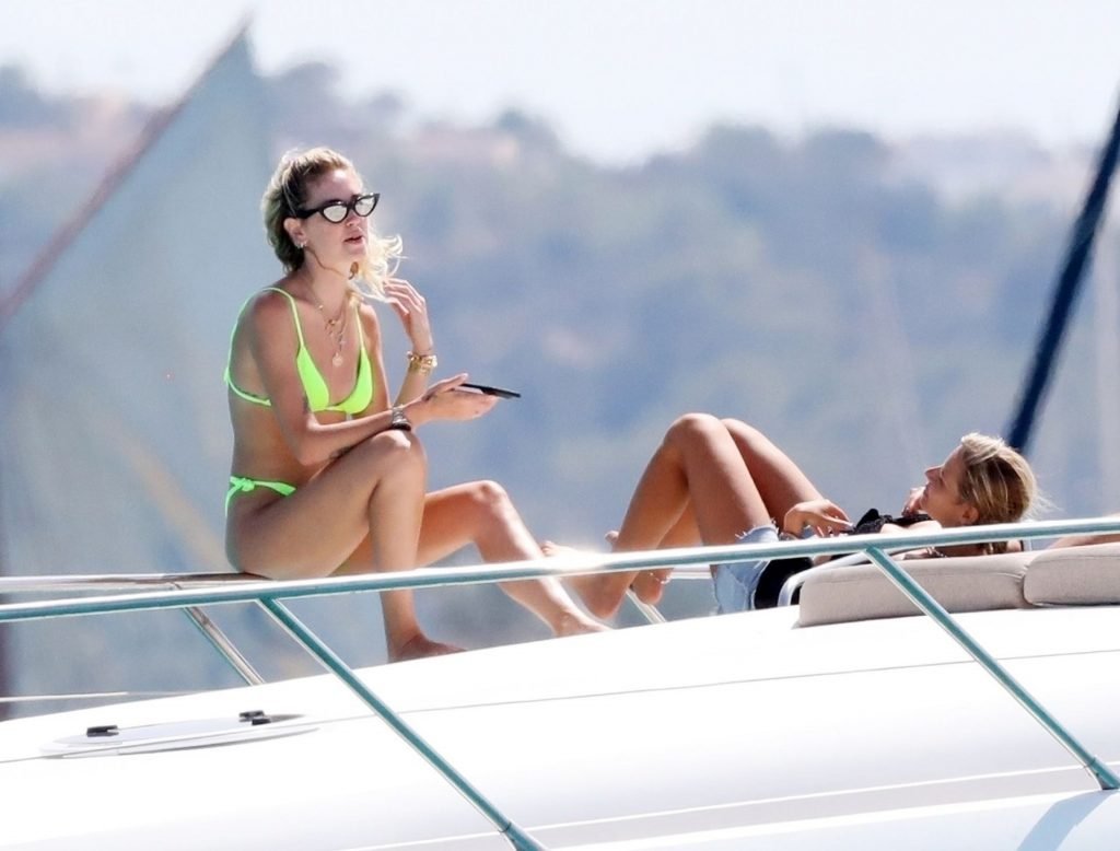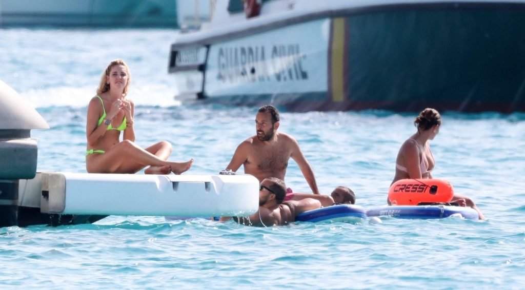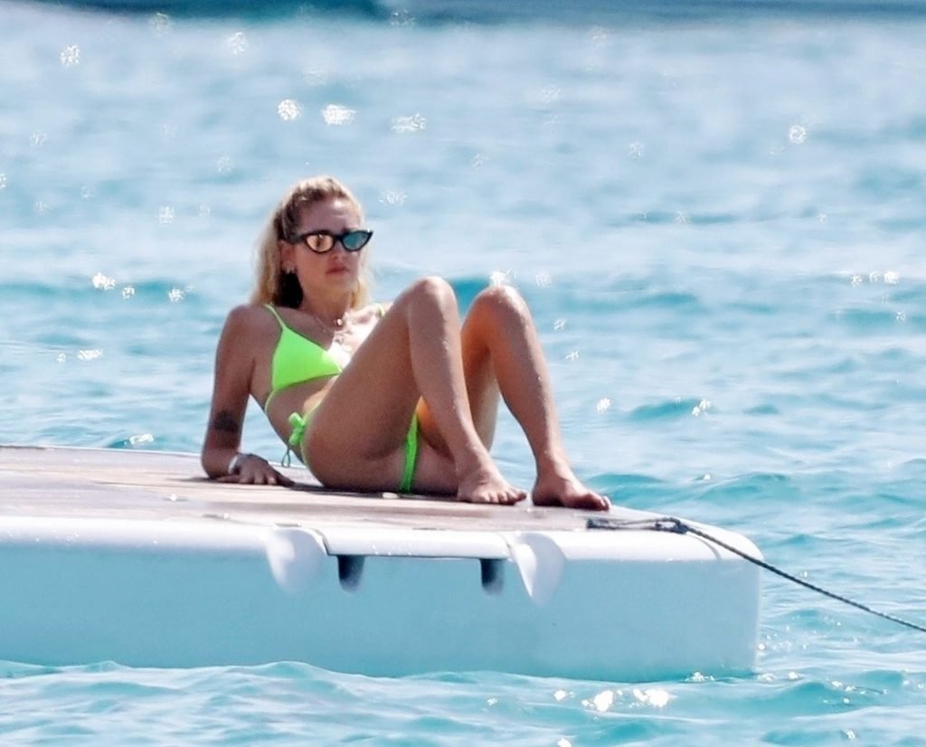 Chiara Ferragni fue fotografiada con su esposo Fedez disfrutando de sus vacaciones en Formentera, 08/04/2019. Chiara Ferragni fue vista con un bikini de dos piezas de neón brillante y Fedez con pantalones cortos estampados, camiseta blanca y zapatillas.