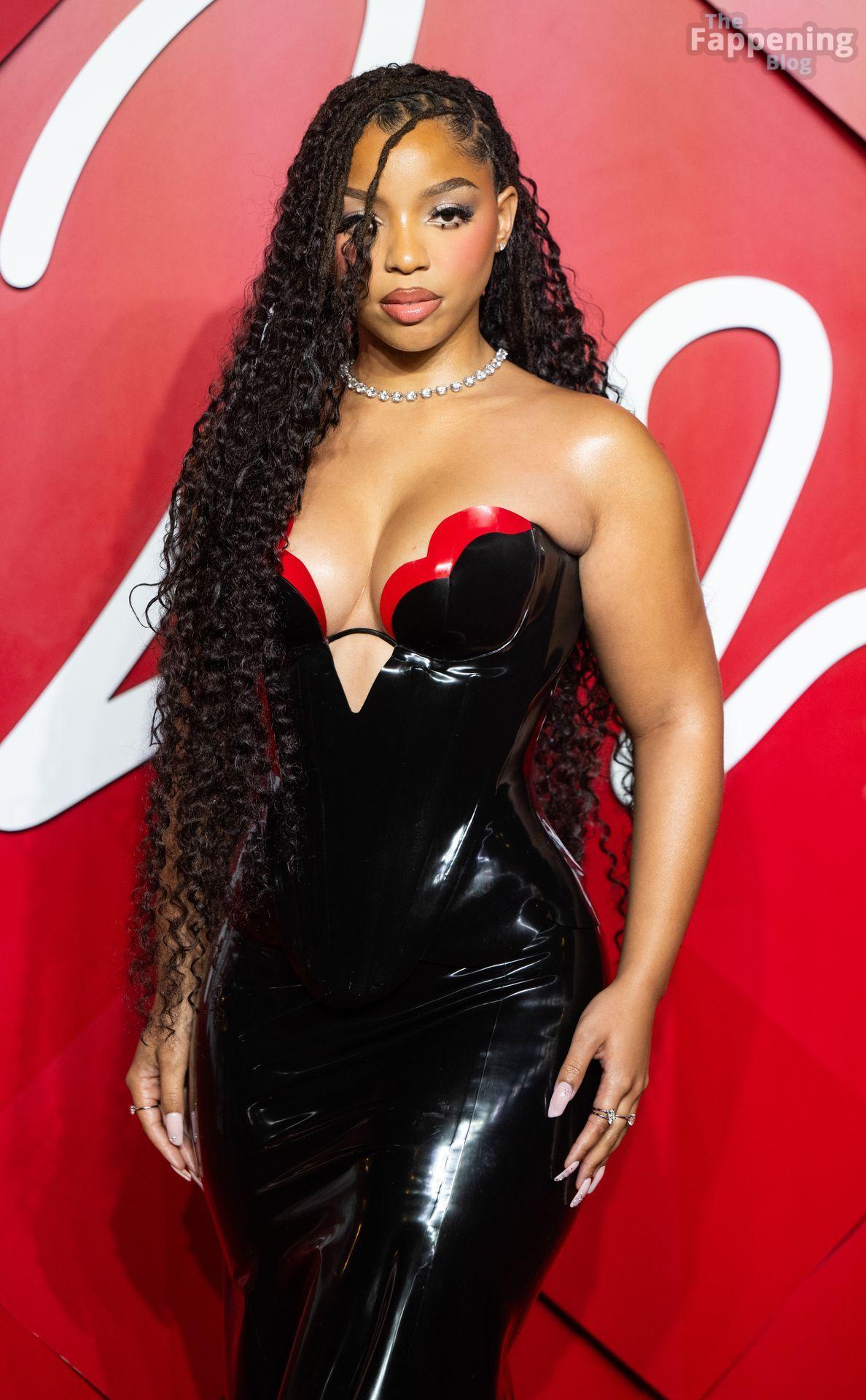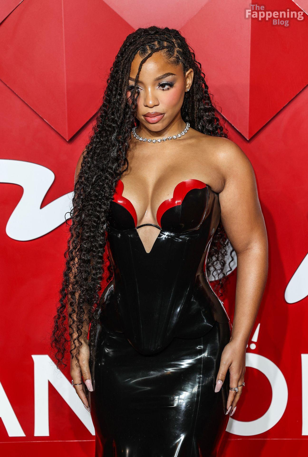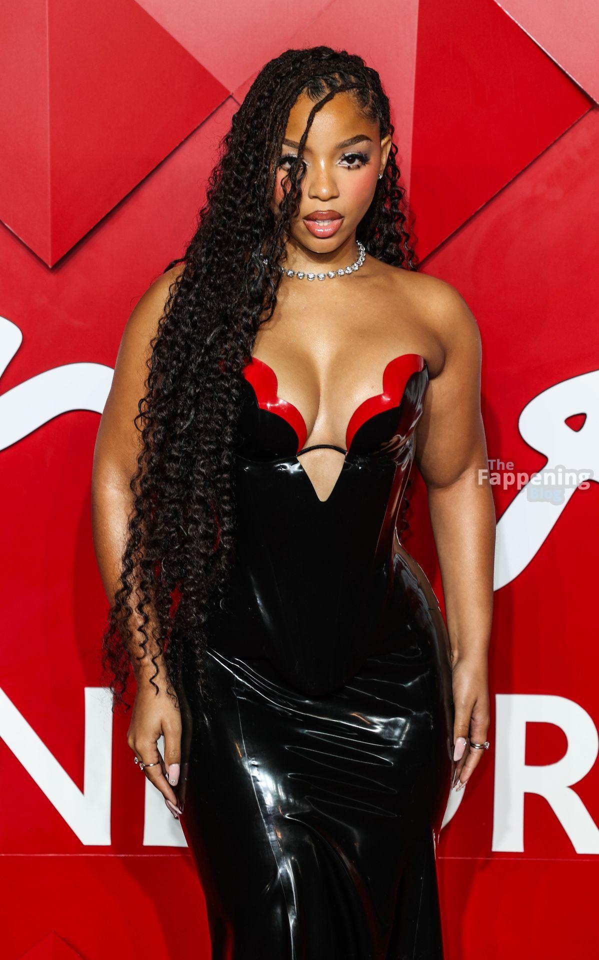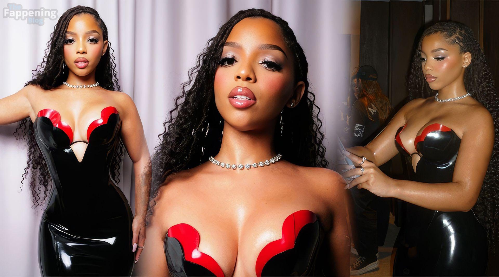 Chloe Bailey aparece en un atrevido vestido de cuero negro y rojo que resalta todas sus curvas y su escote.