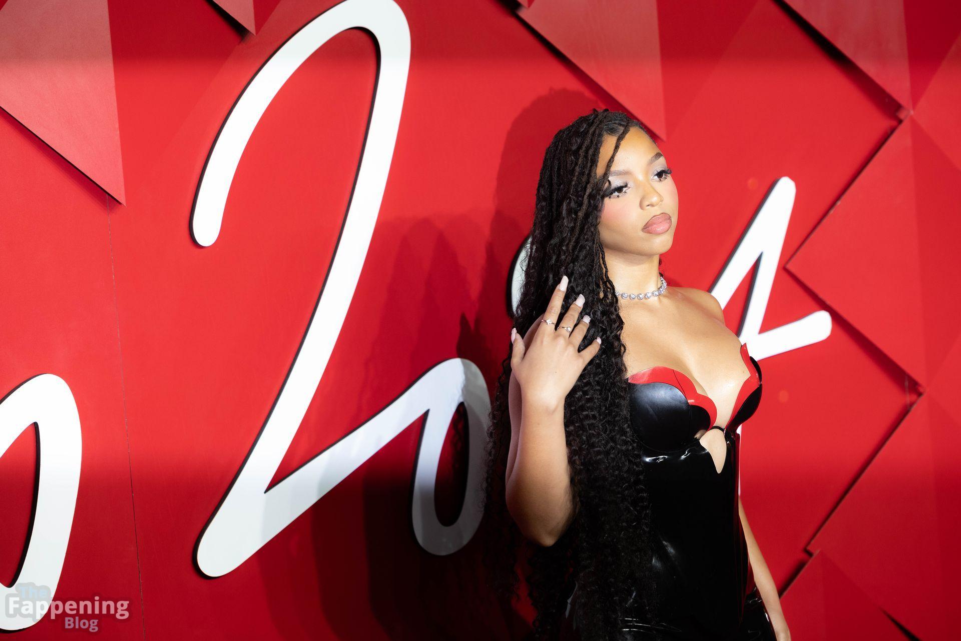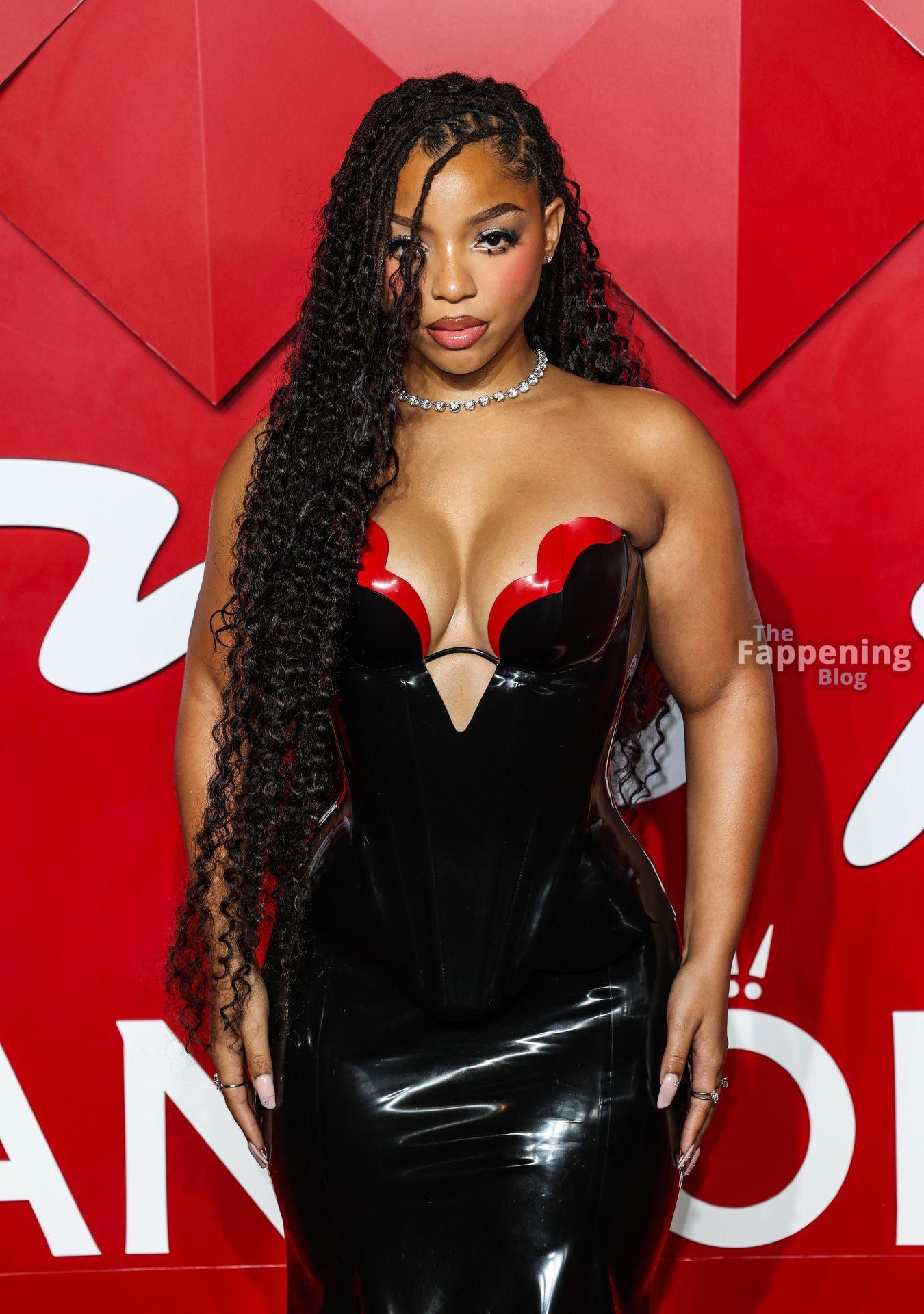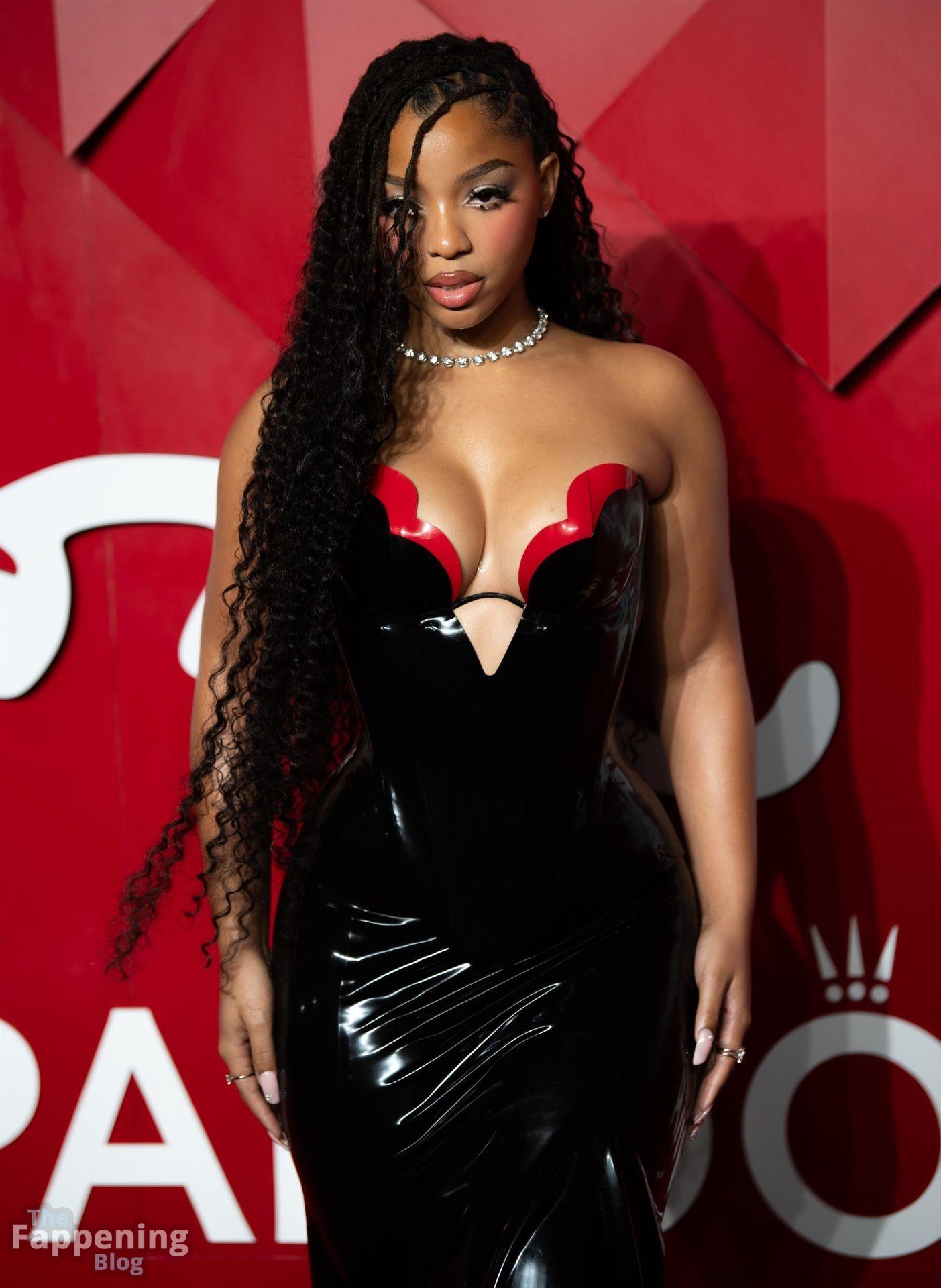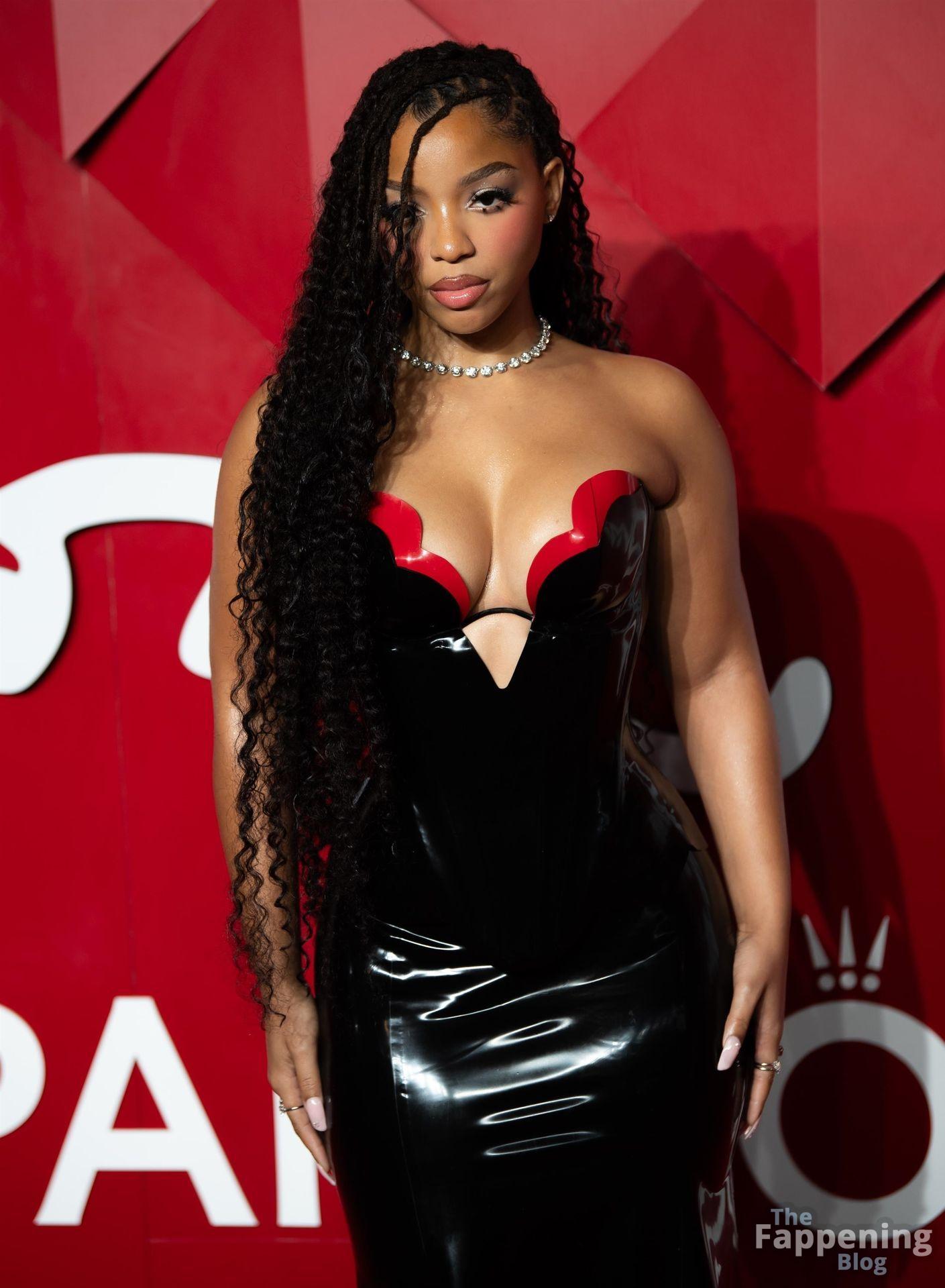 Chloe Bailey aparece en un atrevido vestido de cuero negro y rojo que resalta todas sus curvas y su escote.
