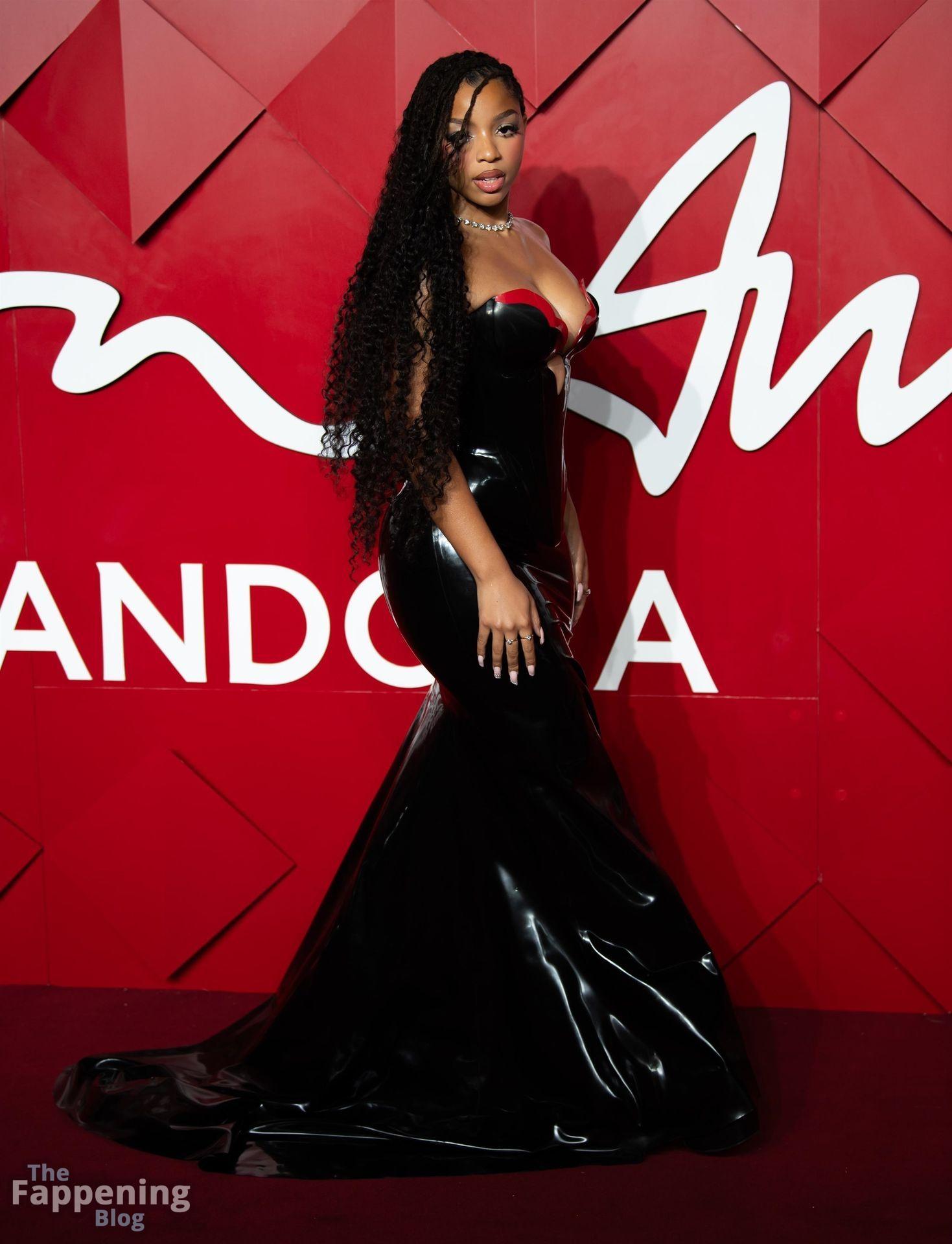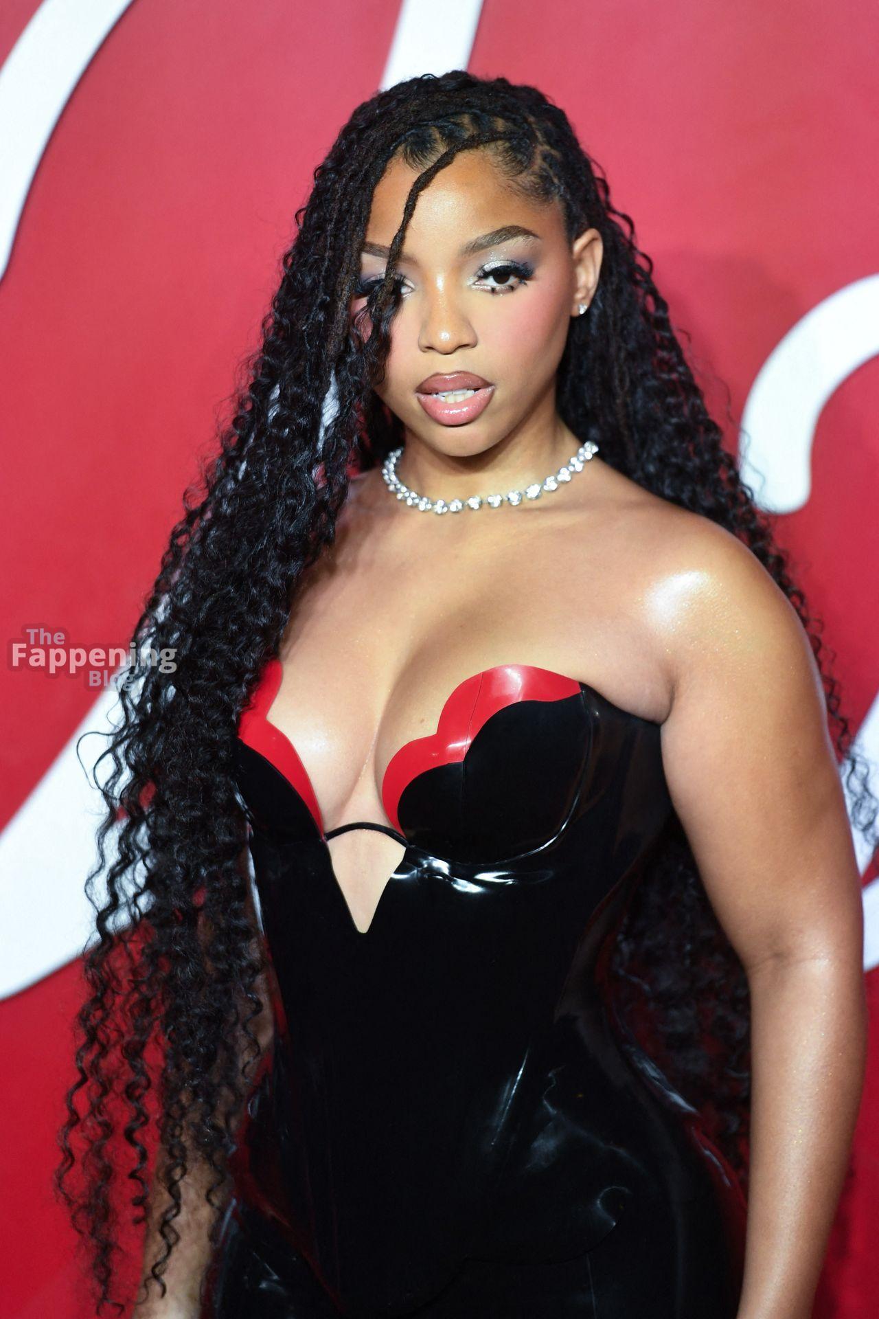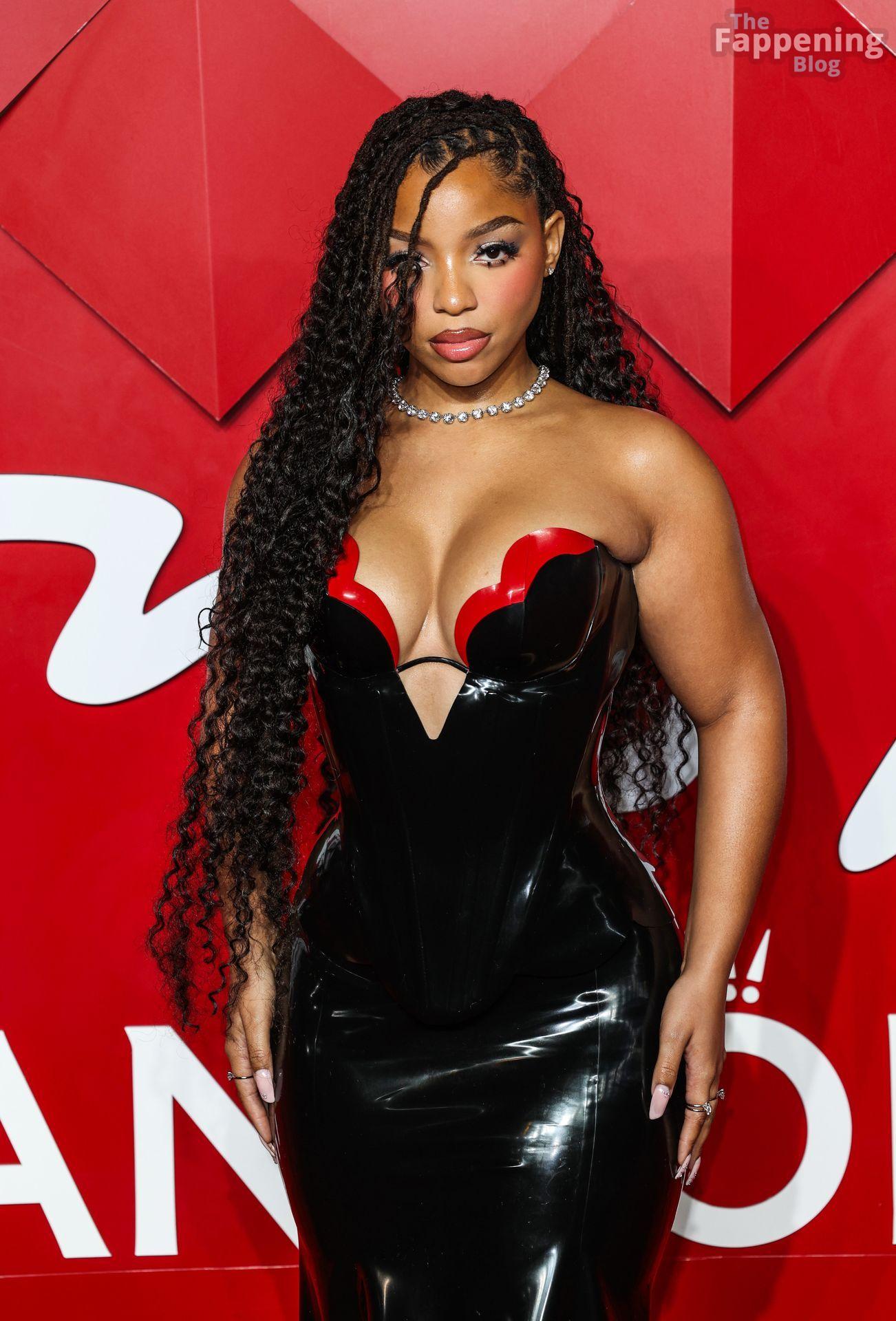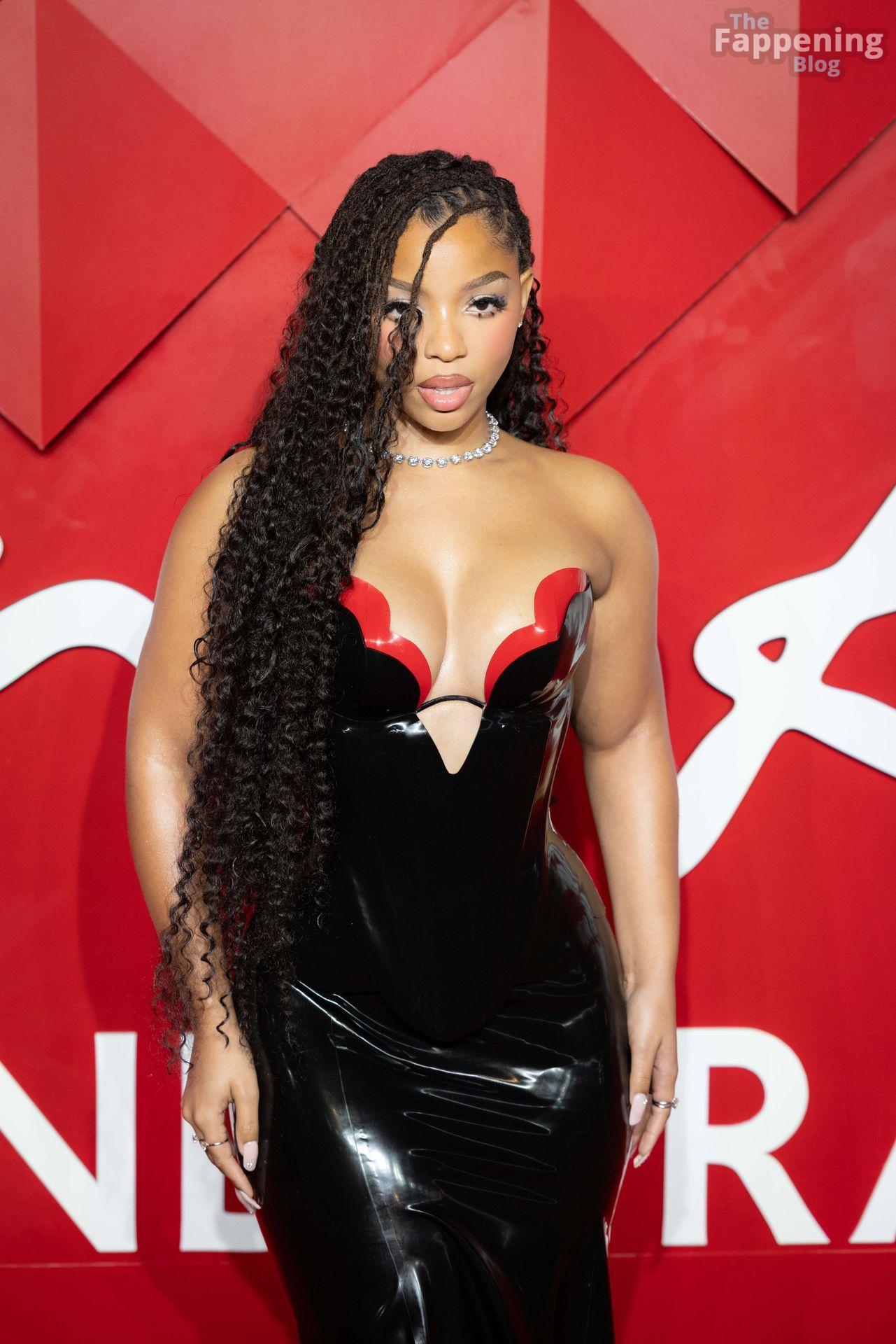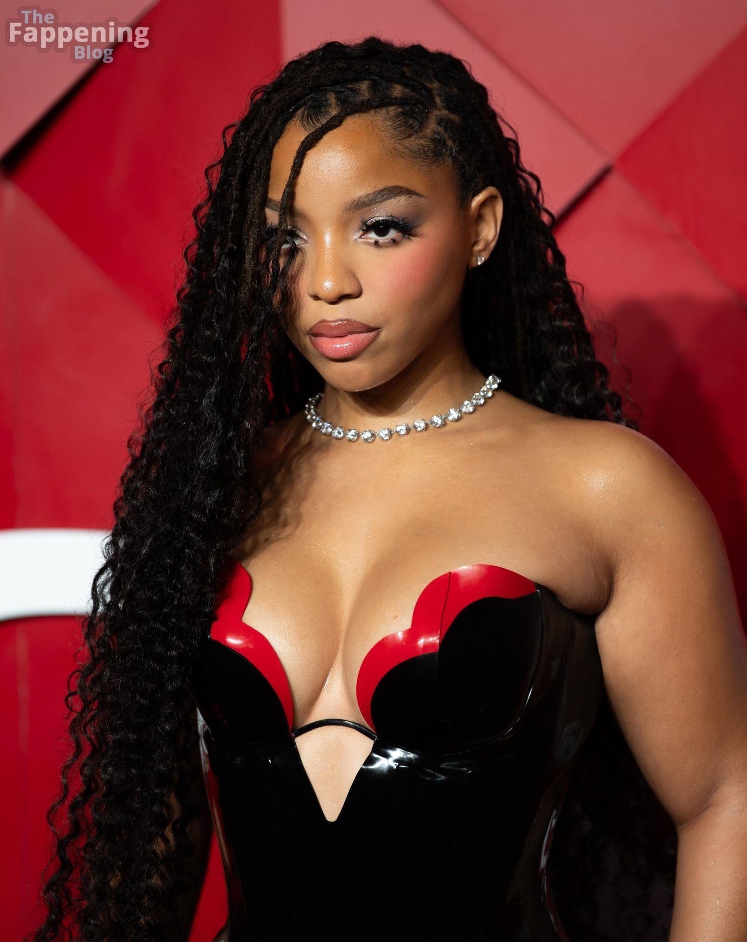 Chloe Bailey aparece en un atrevido vestido de cuero negro y rojo que resalta todas sus curvas y su escote.