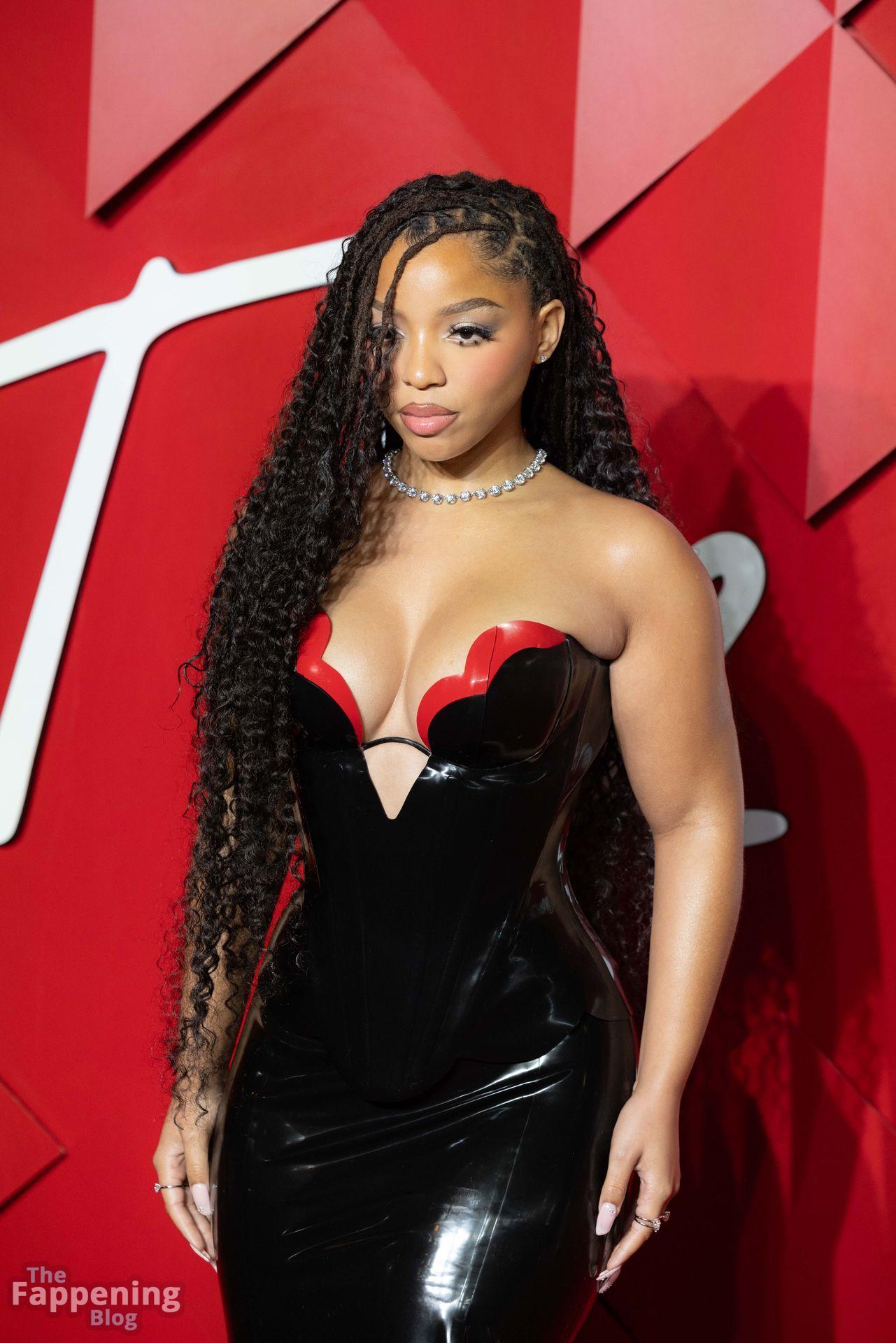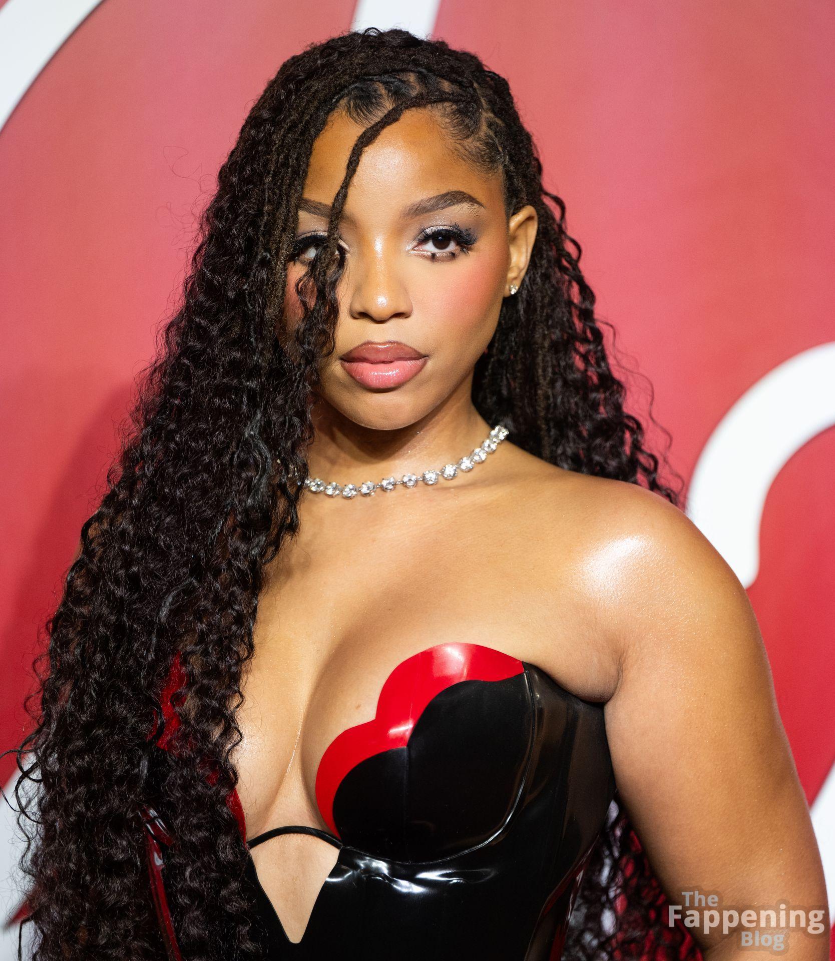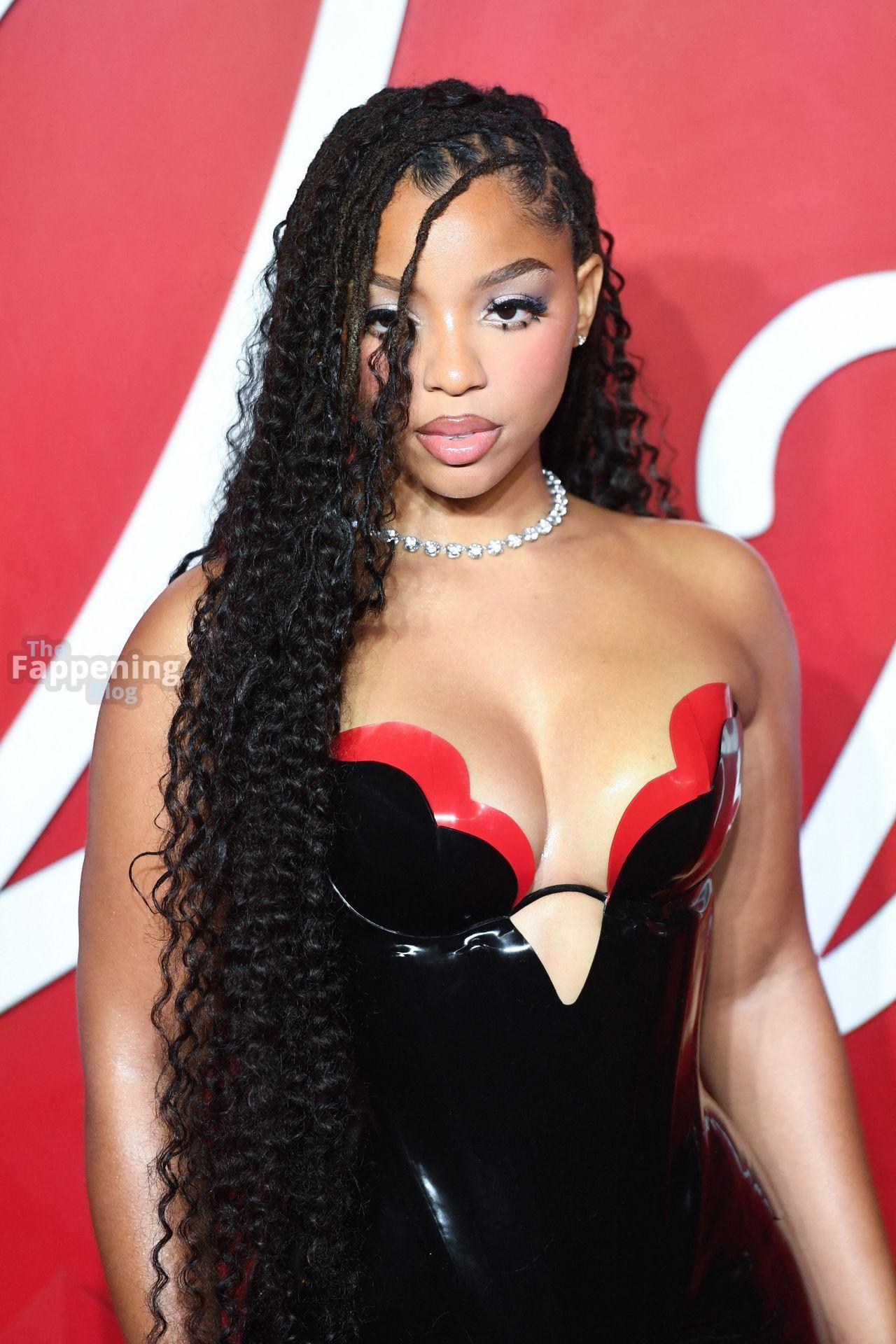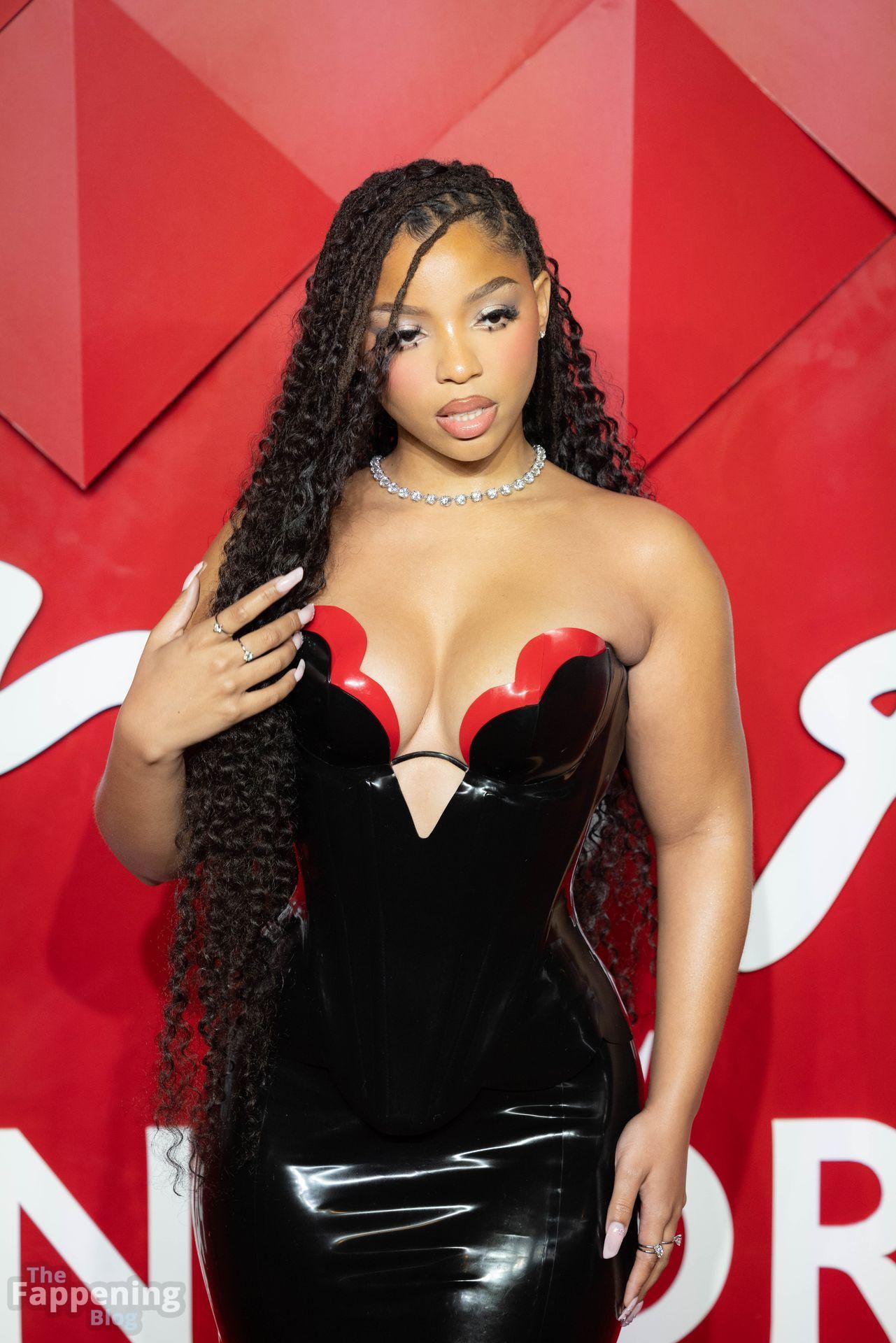 Chloe Bailey aparece en un atrevido vestido de cuero negro y rojo que resalta todas sus curvas y su escote.