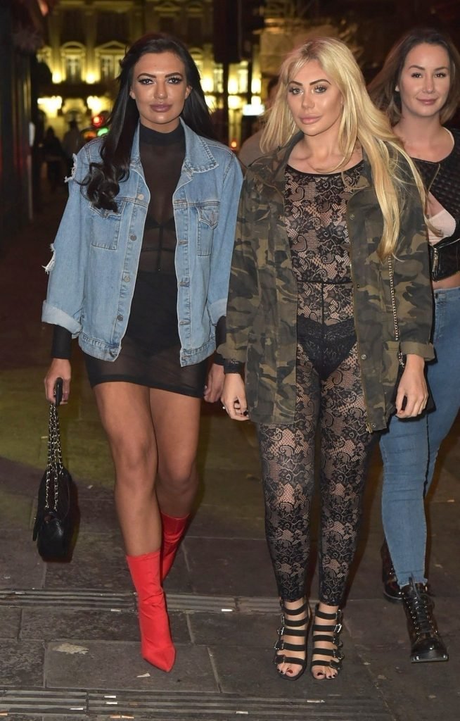 Reality TV star Chloe Ferry, 22, sale de noche con un body transparente mientras se encuentra con la compañera de Geordie Shore Abbie Holborn en Newcastle, 27/01/2018.