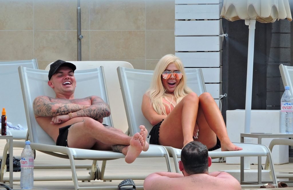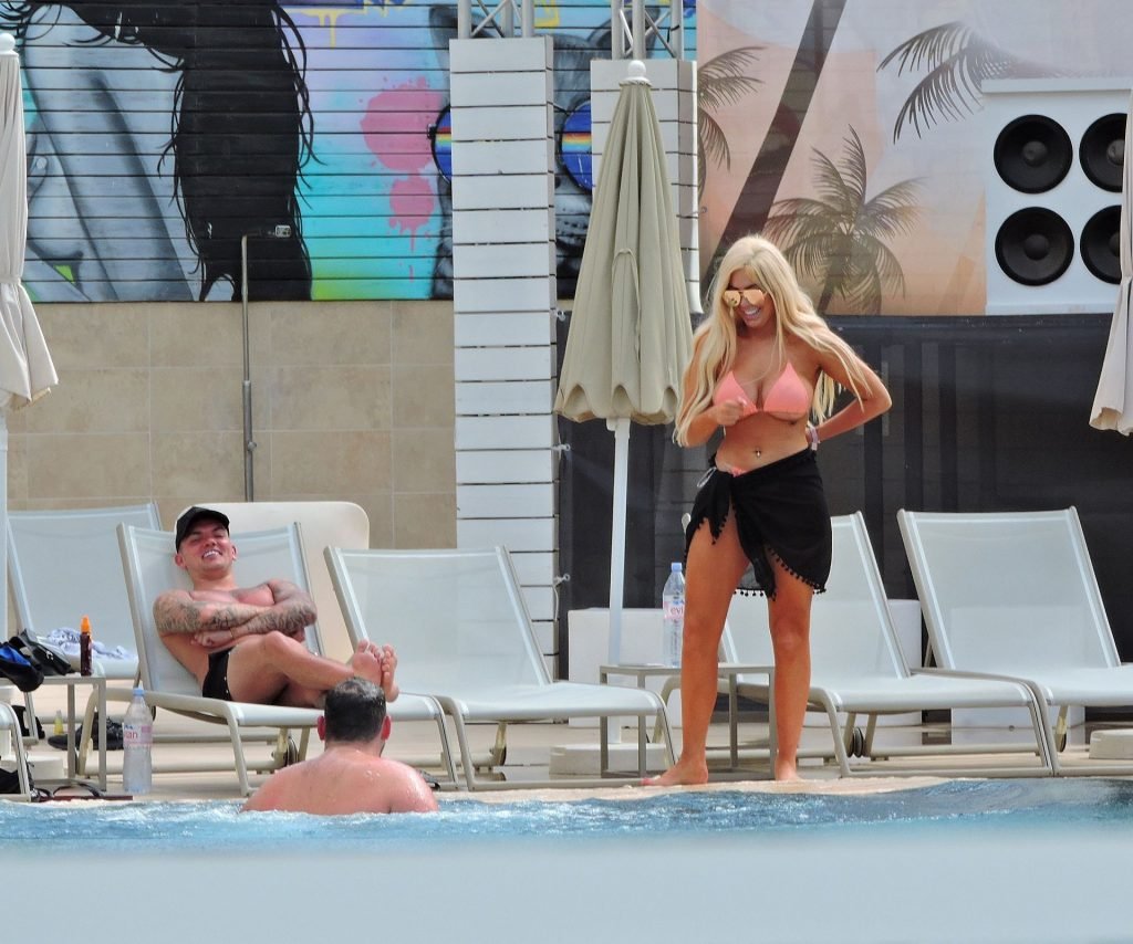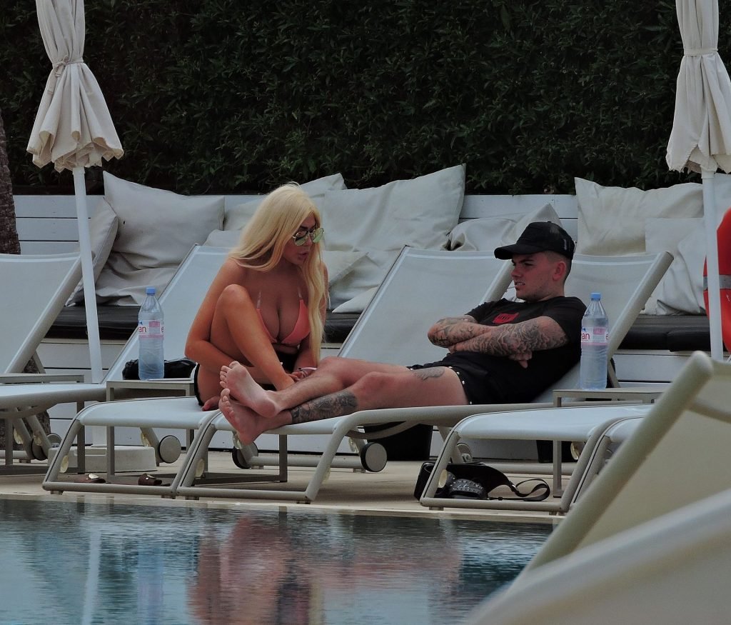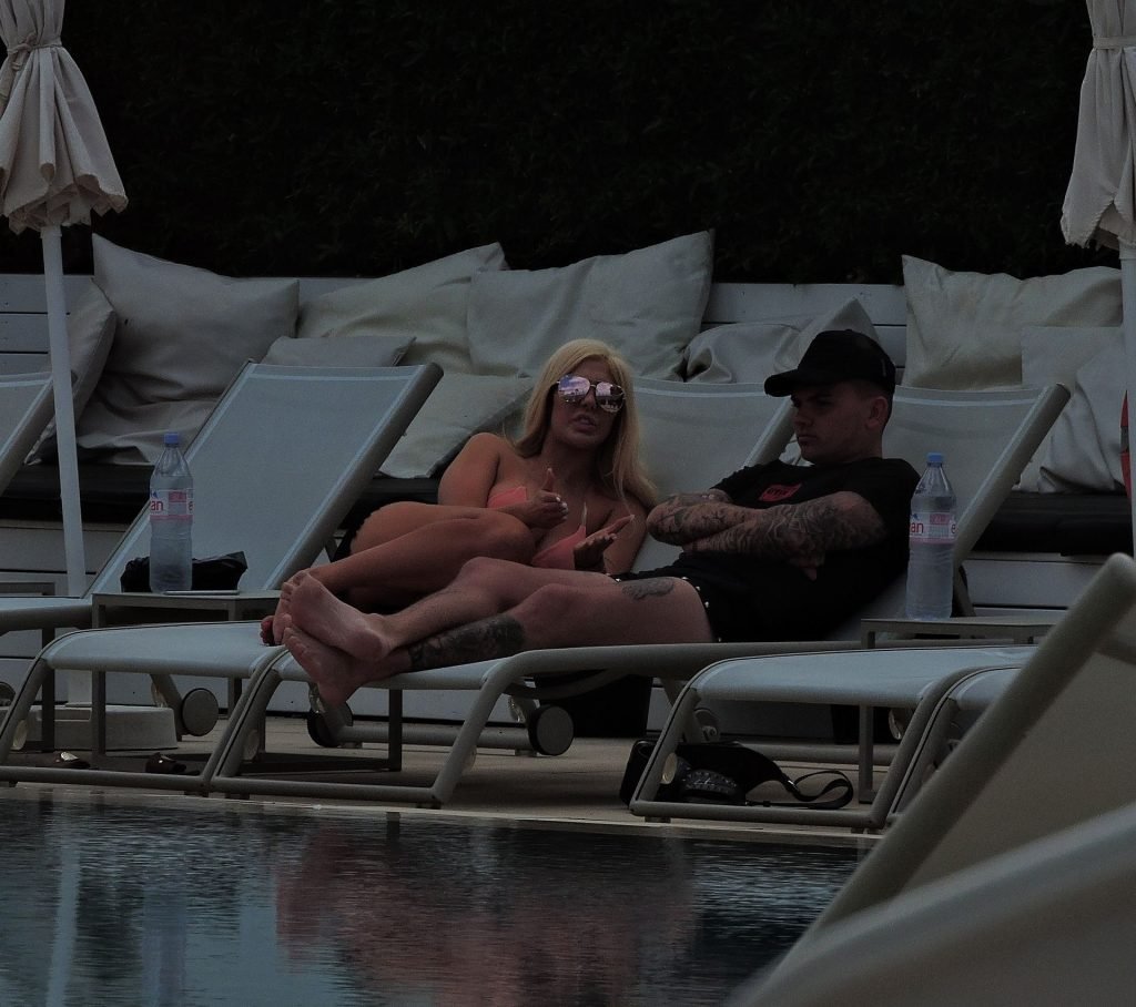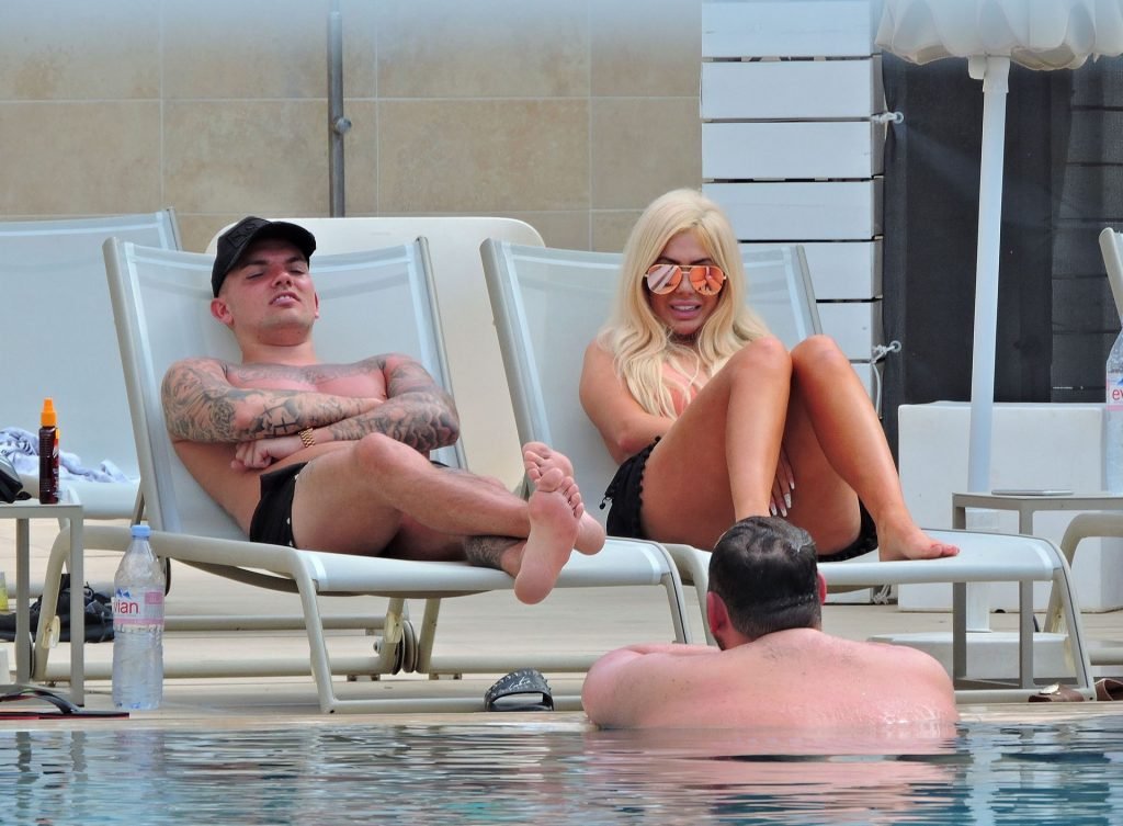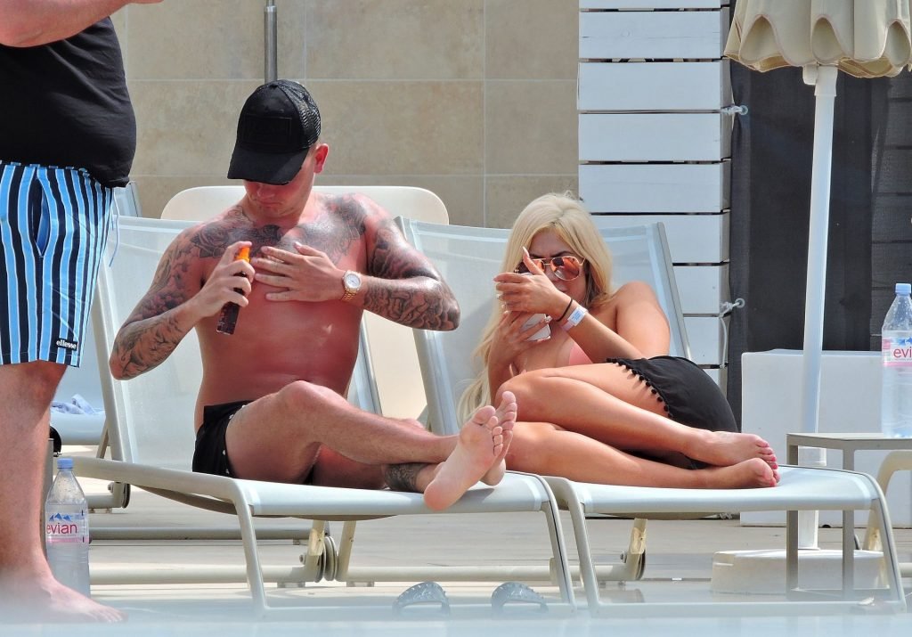 La estrella inglesa de telerrealidad Chloe Ferry y su novio intermitente Sam Gowland son vistos descansando junto a la piscina mientras están de vacaciones juntos en Magaluf, Mallorca, 21/05/2019.