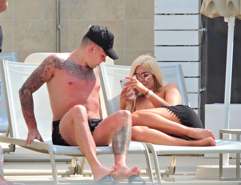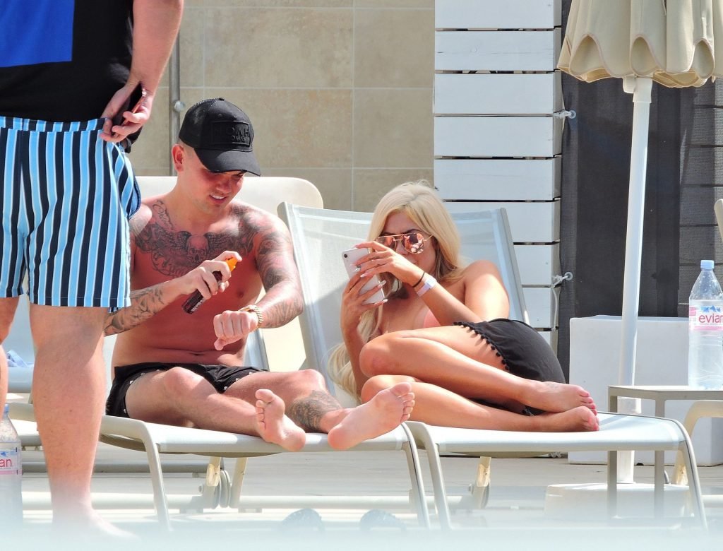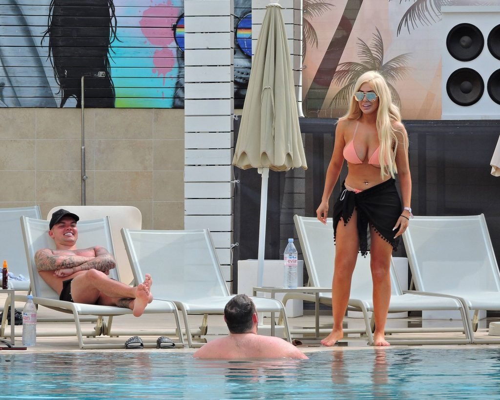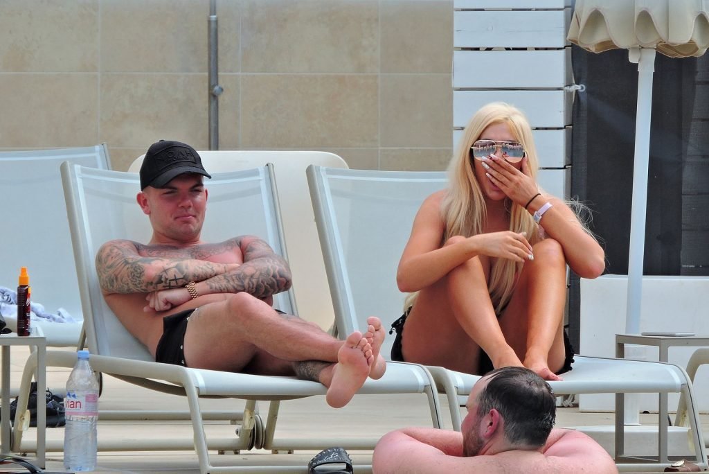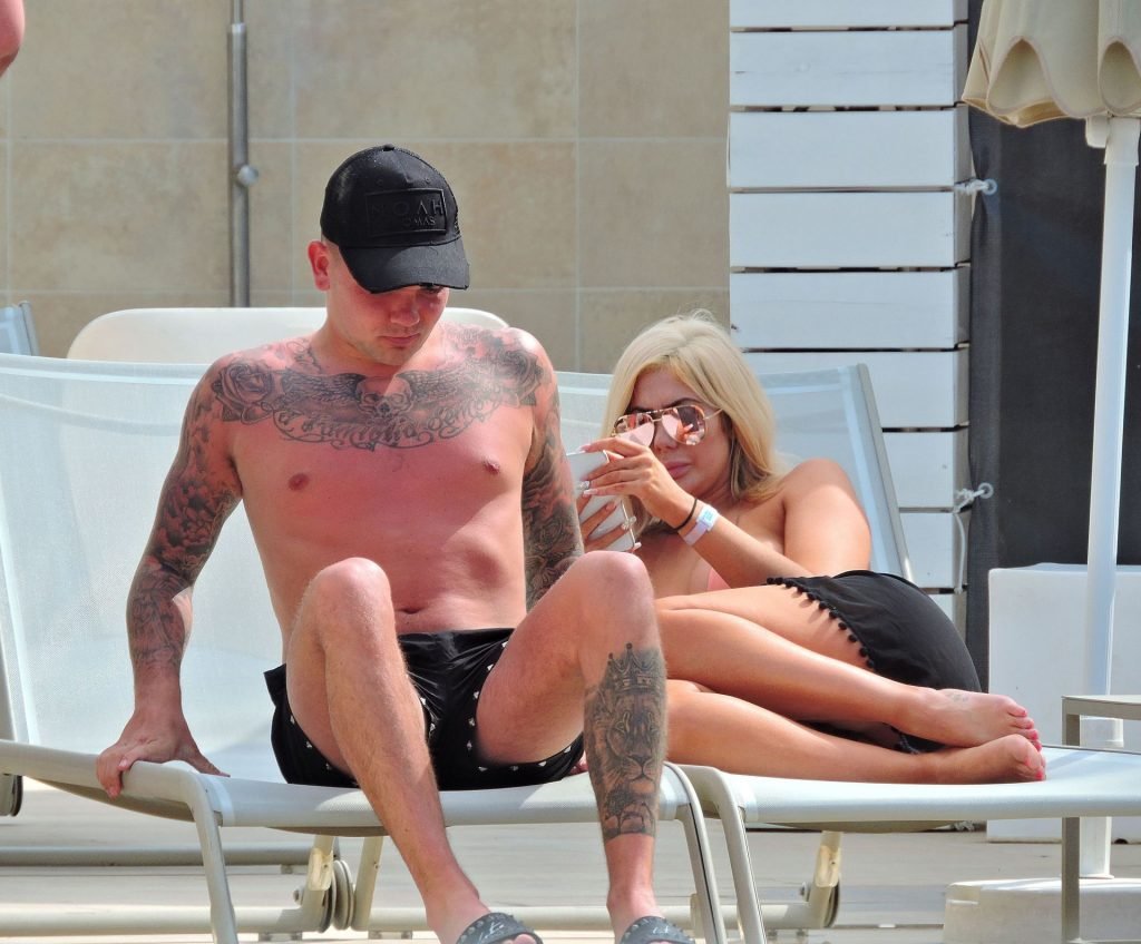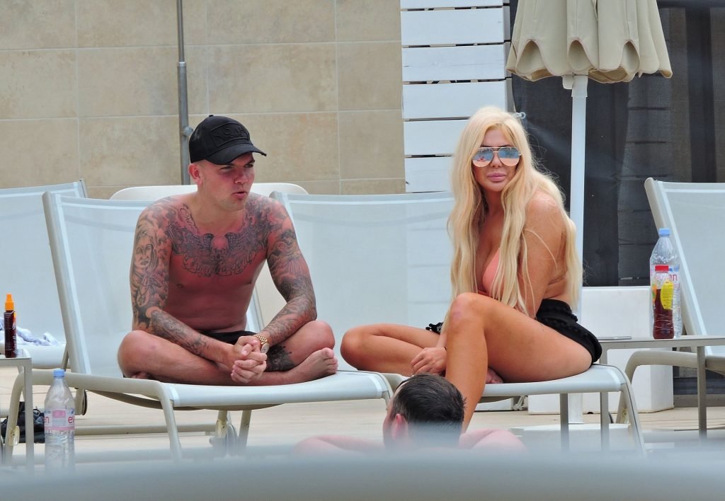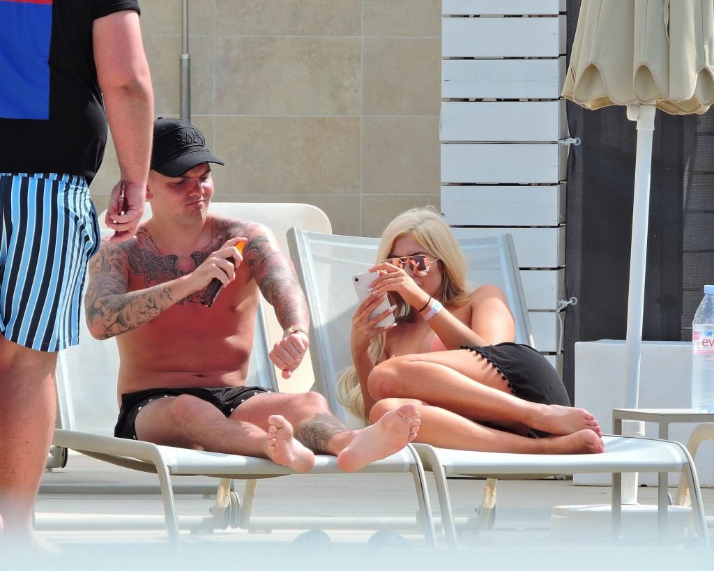 La estrella inglesa de telerrealidad Chloe Ferry y su novio intermitente Sam Gowland son vistos descansando junto a la piscina mientras están de vacaciones juntos en Magaluf, Mallorca, 21/05/2019.