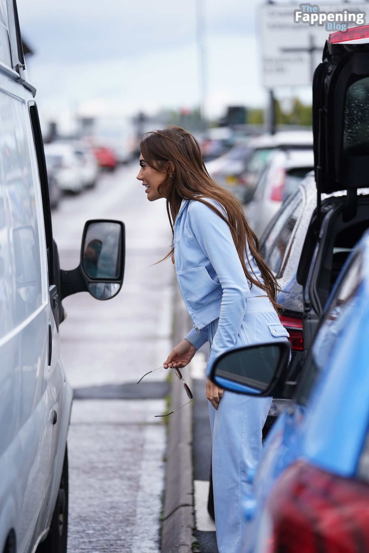Chloe Ferry muestra sus abdominales y bajo pecho durante una visita a su salón donde recoge una cabeza de maniquí de su coche – Newcastle, 15/08/2023.