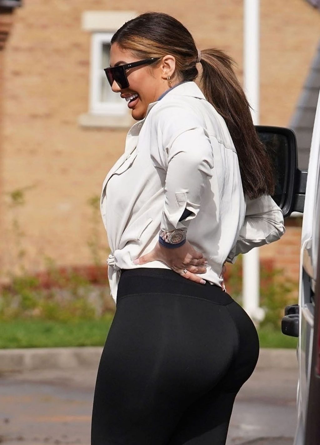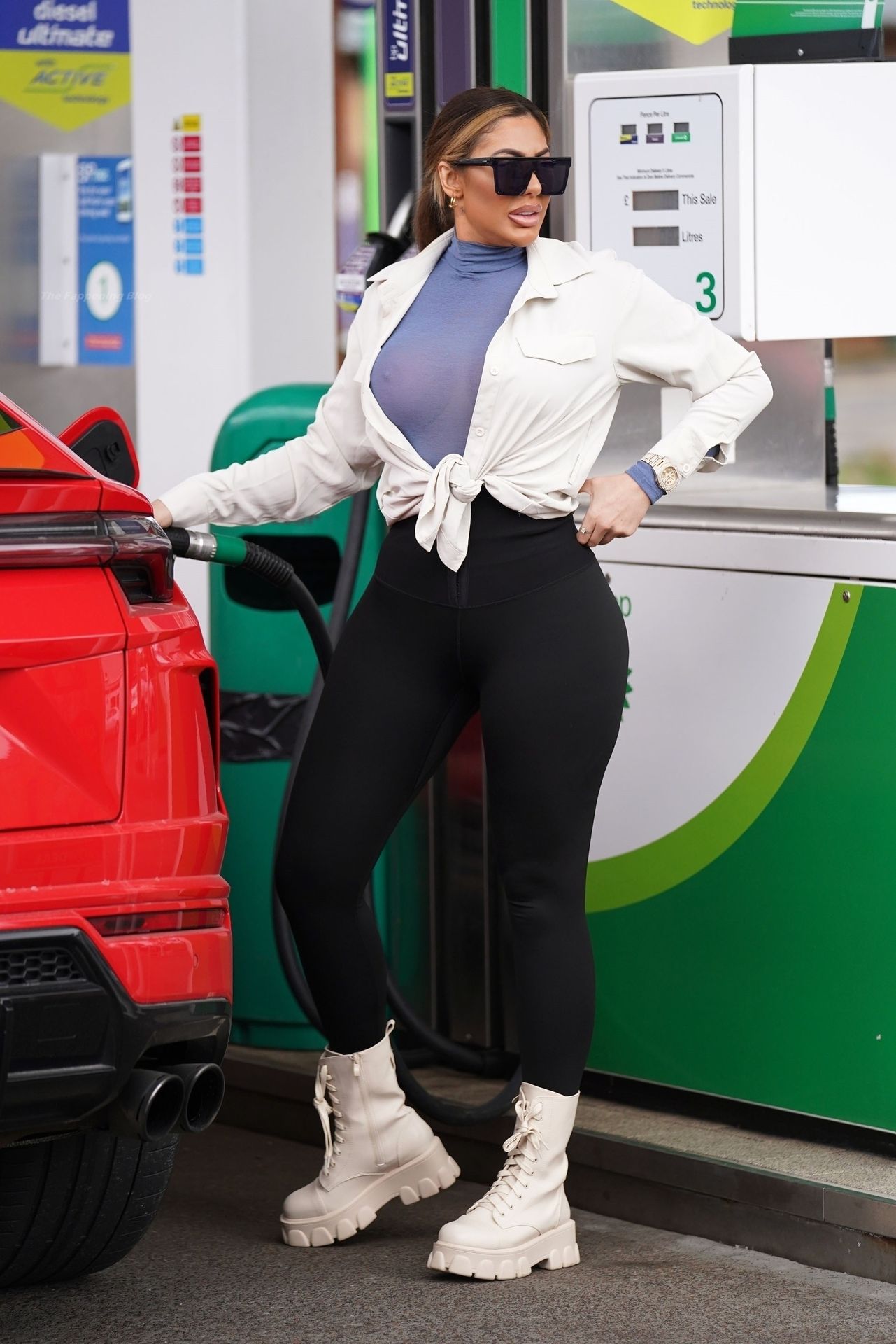Chloe Ferry aparece en un vehículo Lamborghini Urus 4×4 de £180,000 mientras se detiene para repostar y revisar el aire de un neumático en una gasolinera local.