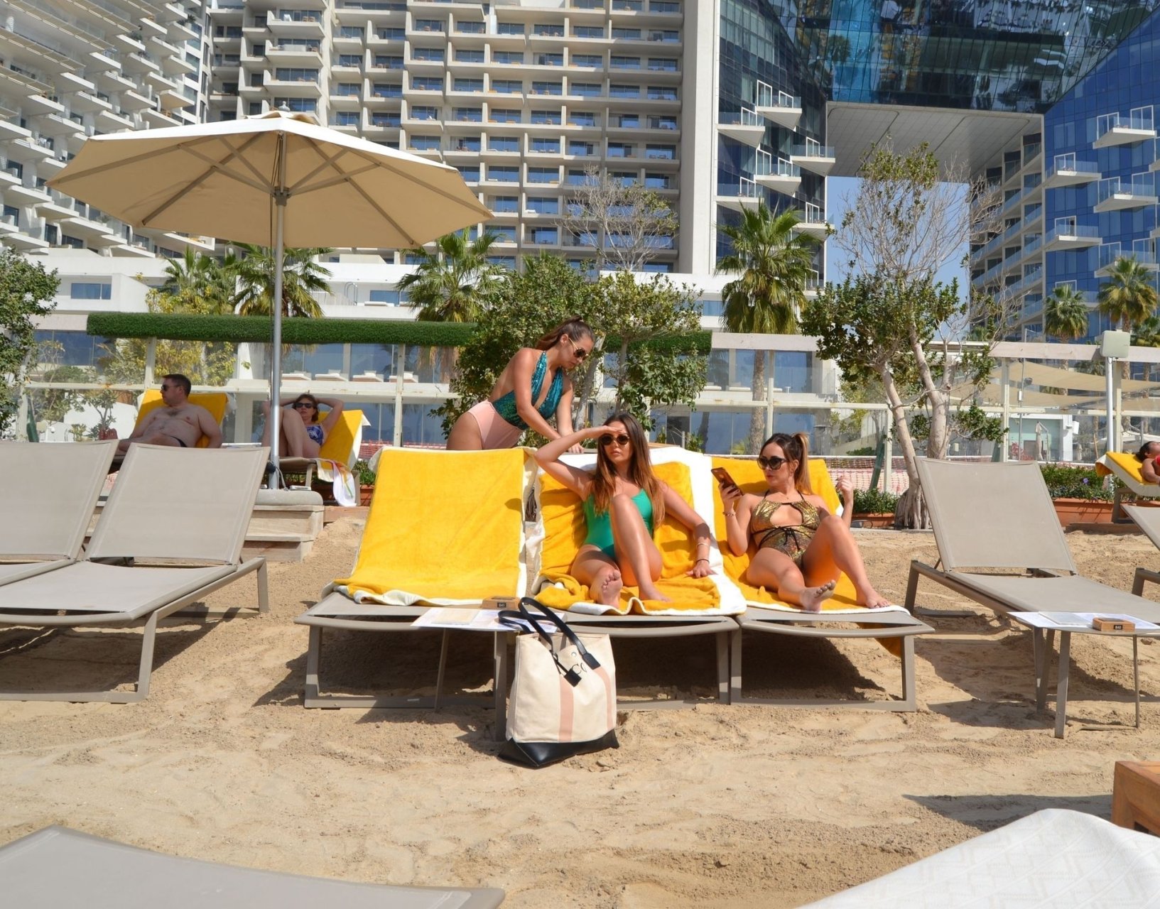 Las hermanas Goodman tomando el sol en la playa de su hotel de lujo en el FIVE Palm Jumeirah Hotel en Dubái, 13/02/2019. Con temperaturas en los altos 20 grados, las chicas se asolean en sus tumbonas disfrutando del cálido sol árabe con sus bikinis a la vista.