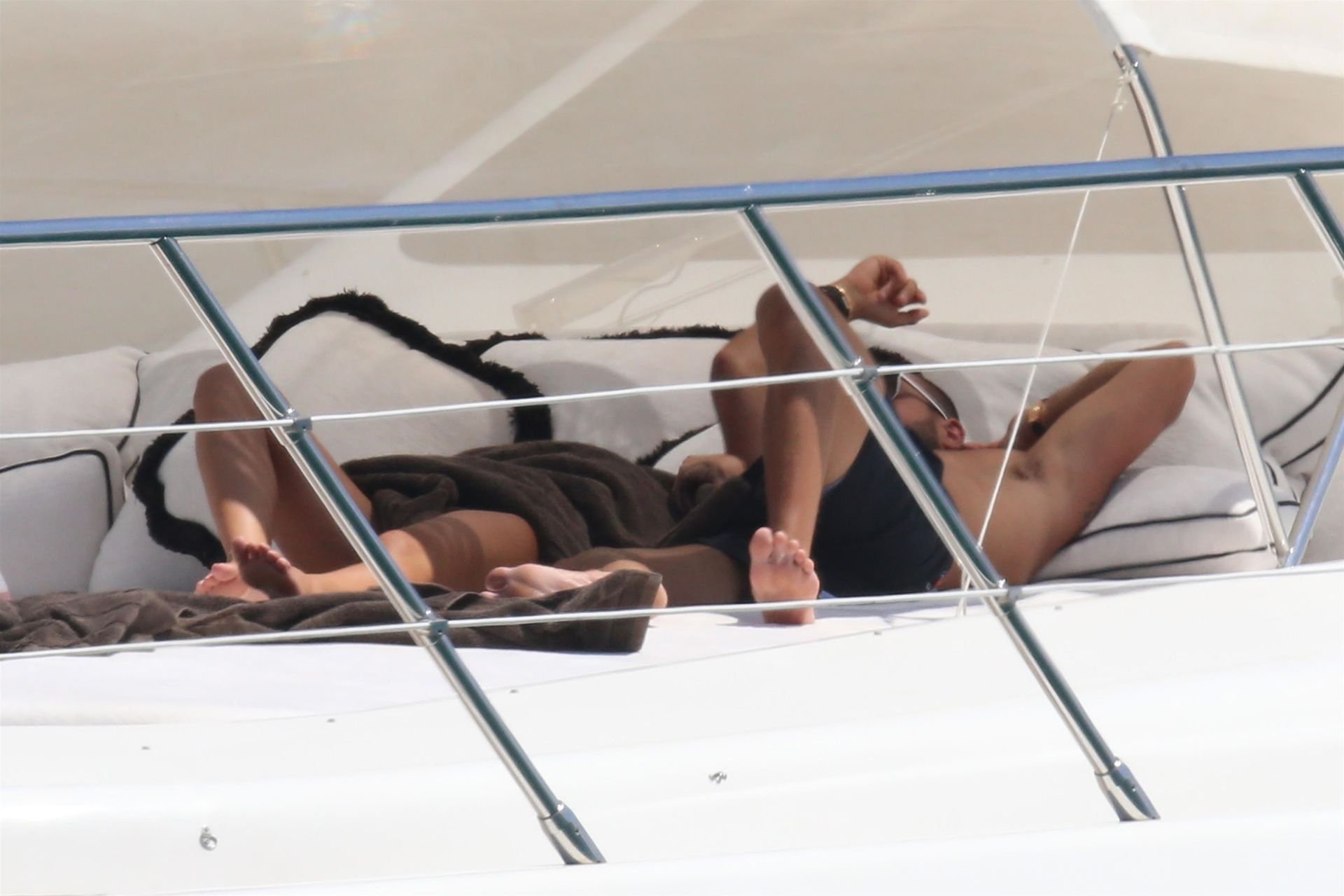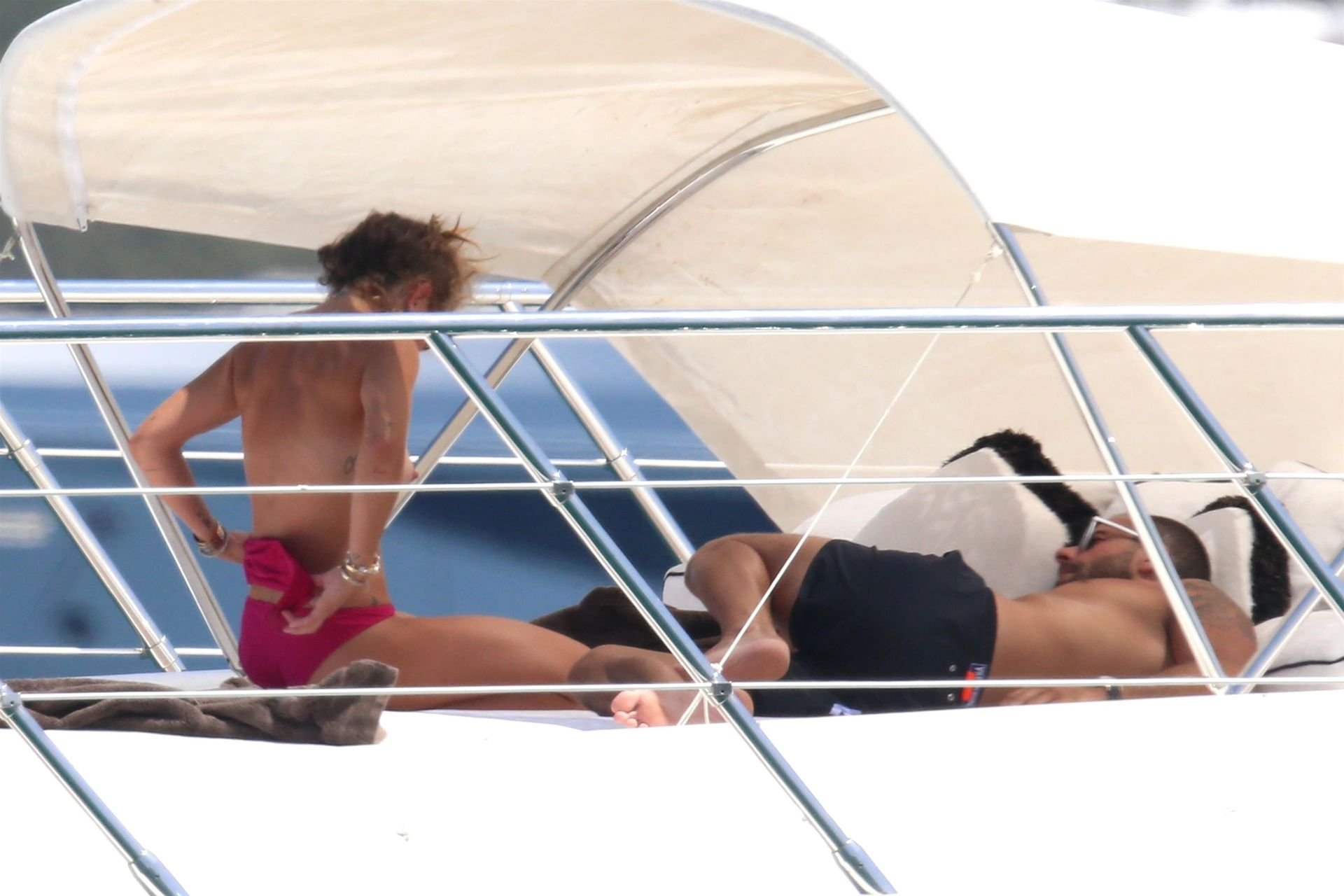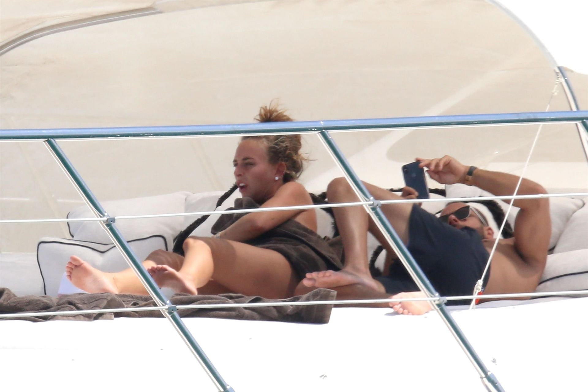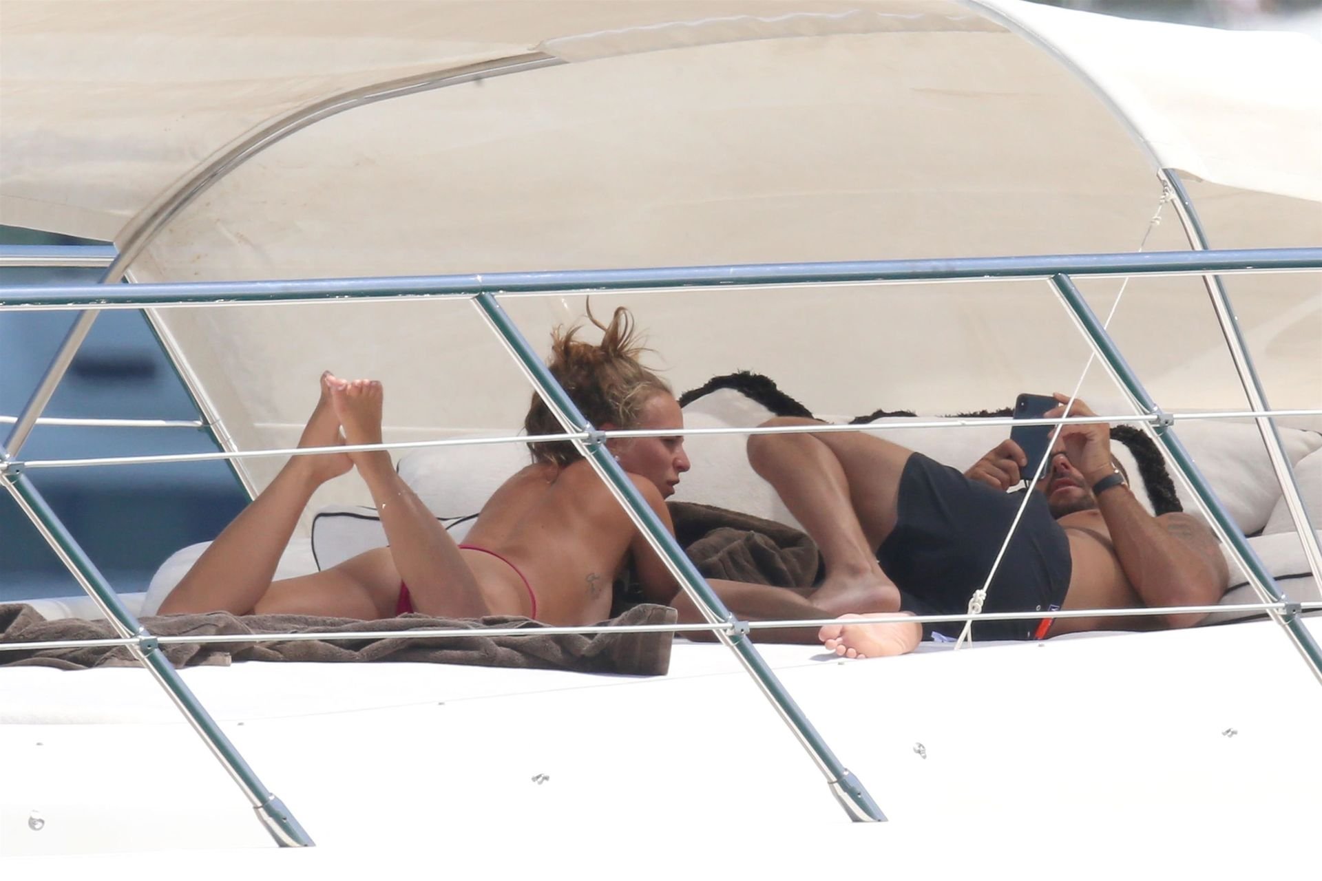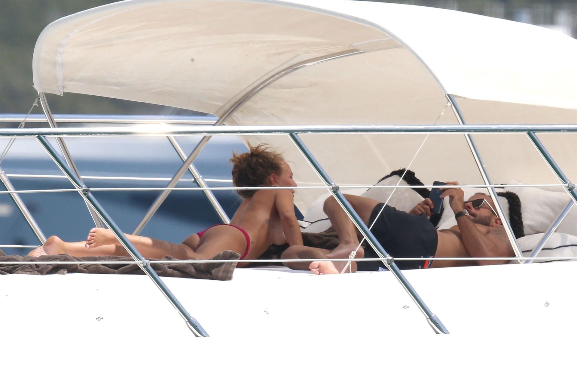 Chloe Green desnuda y un hombre desconocido se acercan mientras descansan en el mega yate Lion Heart de su padre en Cerdeña, Italia, 11/08/2019. La hija del multimillonario Philip Green fue vista recientemente sin el anillo de compromiso de su “Prófugo Sexy” Jeremy Meeks y, por lo que parece, ha seguido adelante.