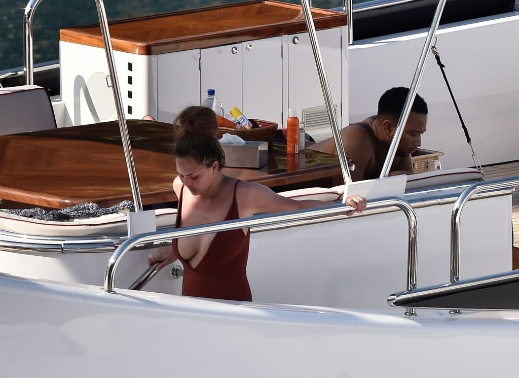 Cantante de soul estadounidense, John Legend y su esposa Chrissy Teigen disfrutan de un paseo en barco durante sus vacaciones de aventura en Italia, en Portofino, 07/02/2019.