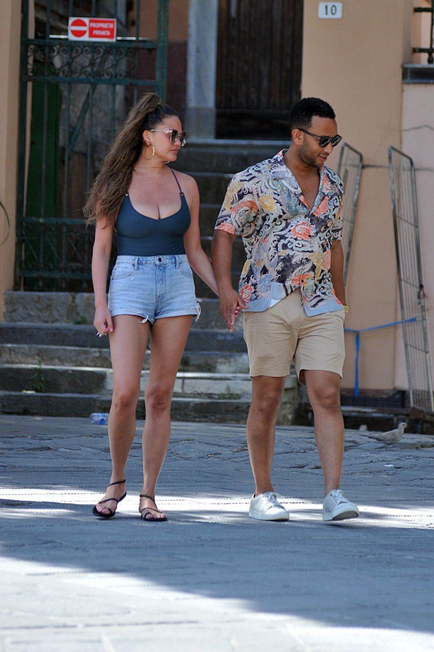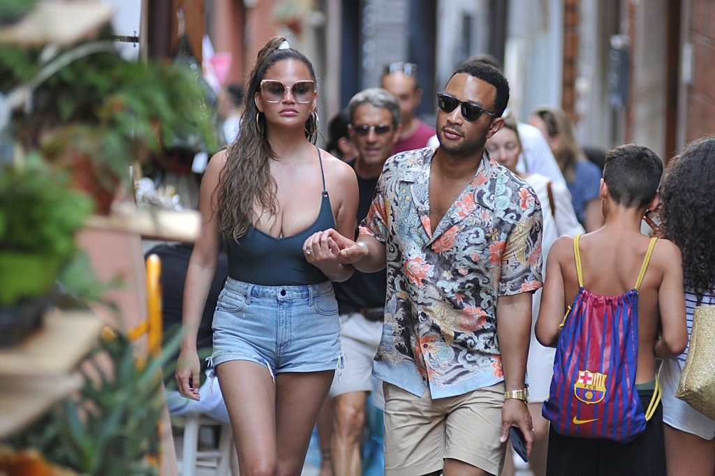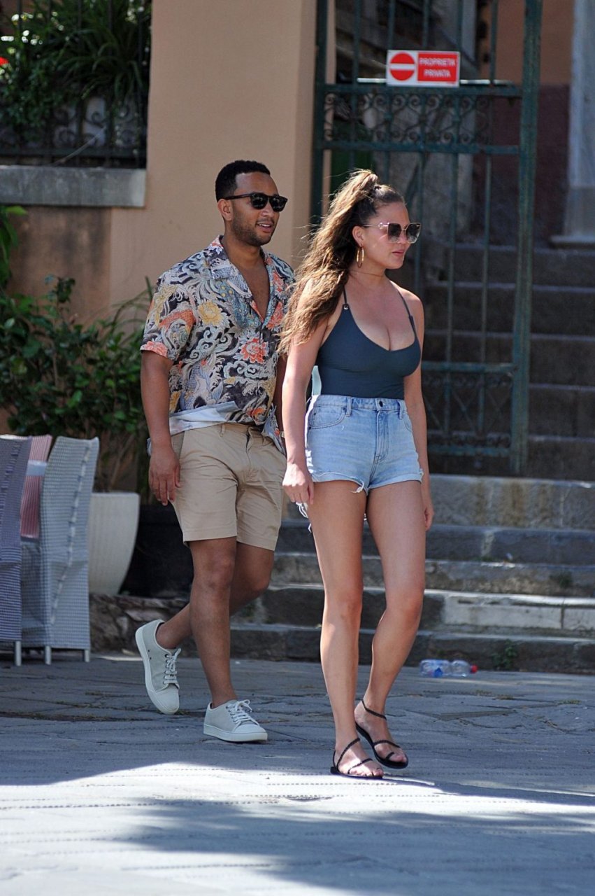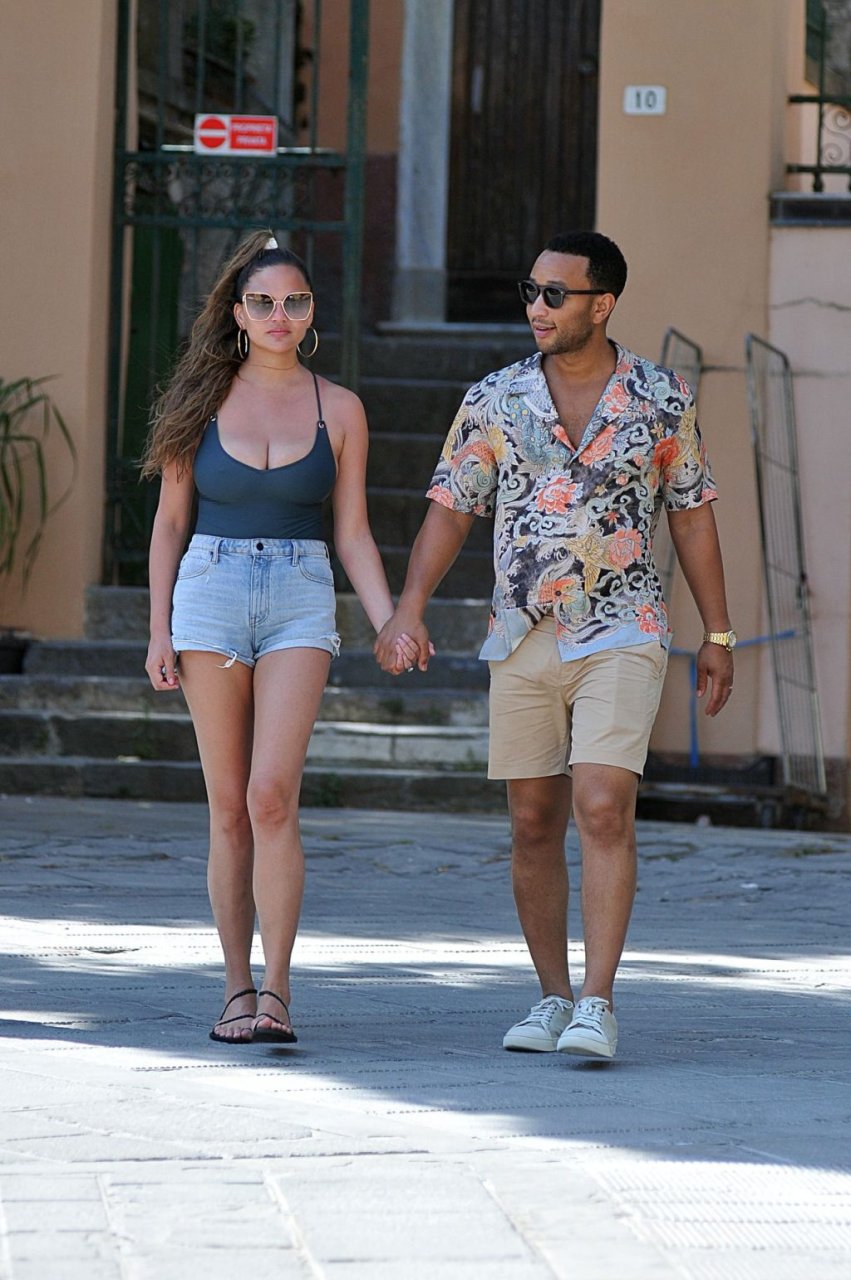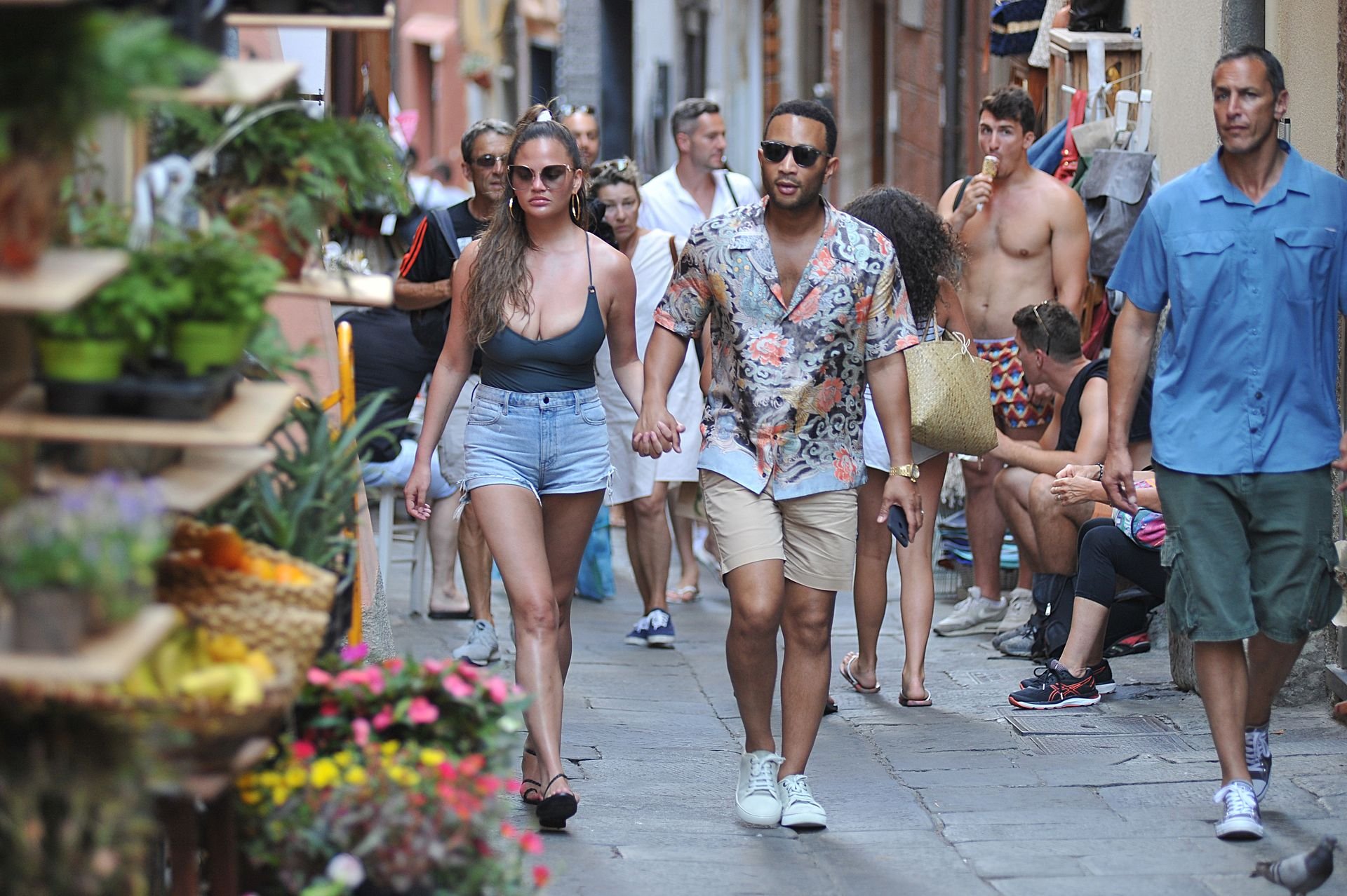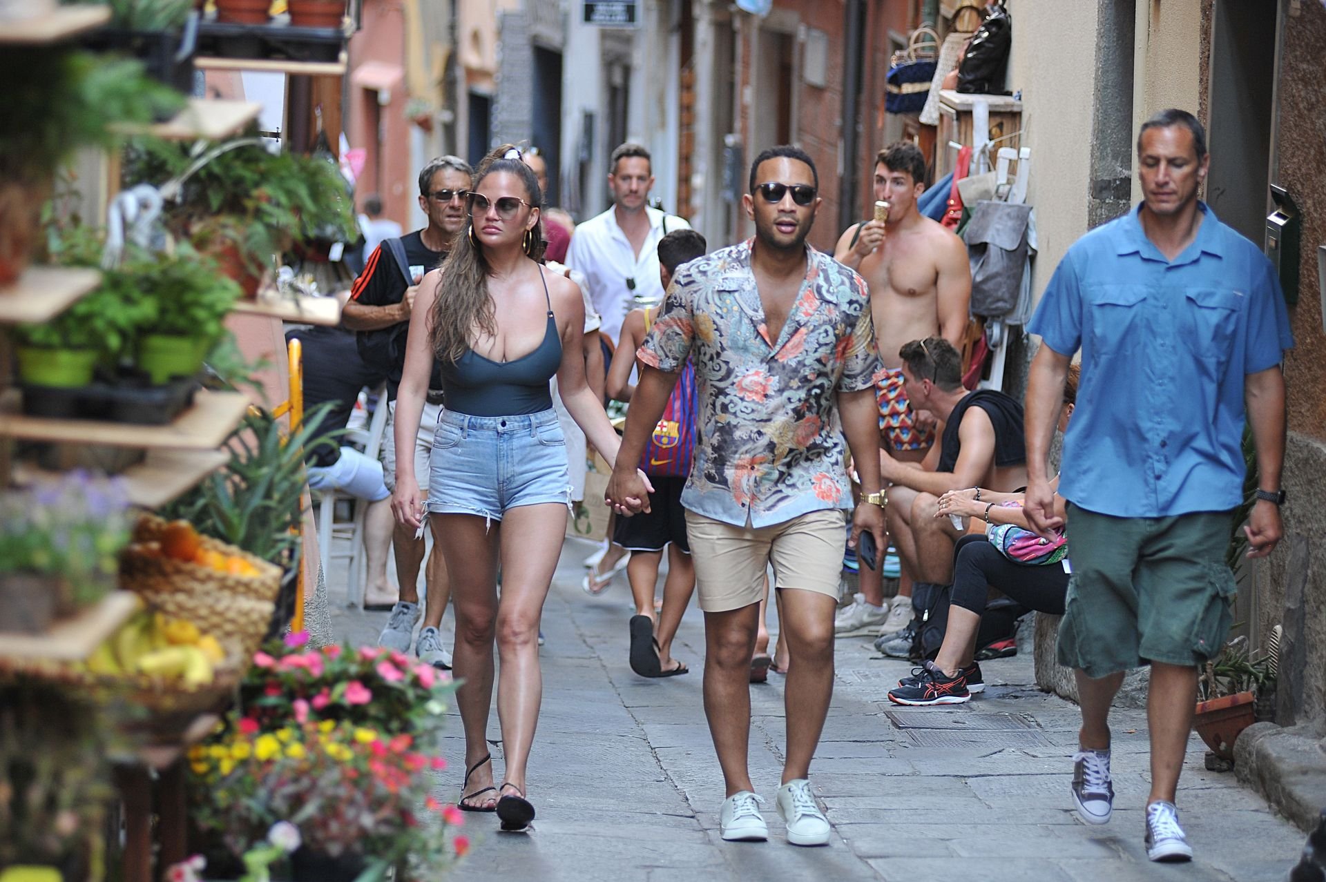 John Legend y Chrissy Teigen fueron vistos mostrando muestras públicas de afecto en Porto Venere, 07/04/2019. Chrissy fue fotografiada con shorts de mezclilla y un body verde oscuro con un escote pronunciado.