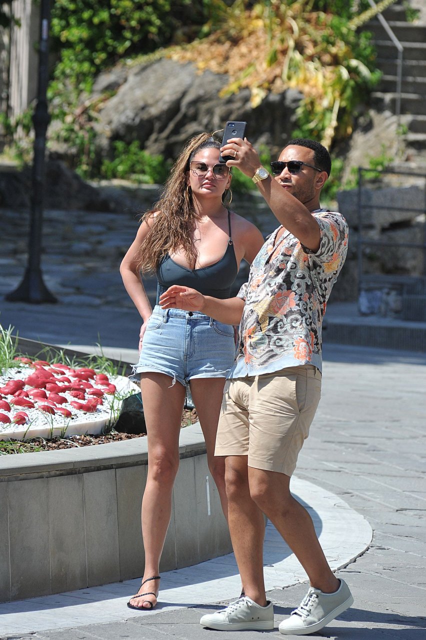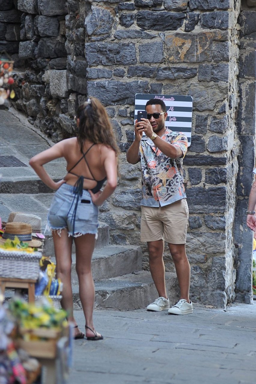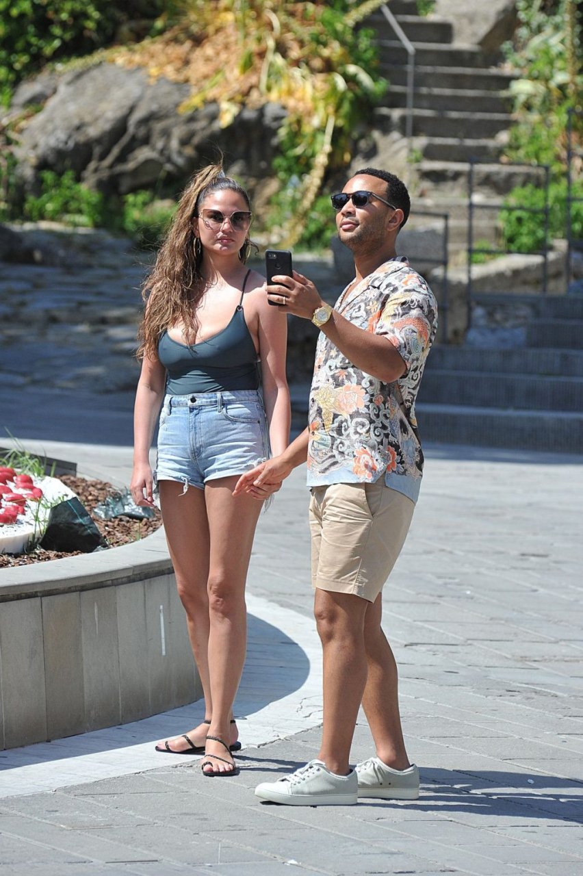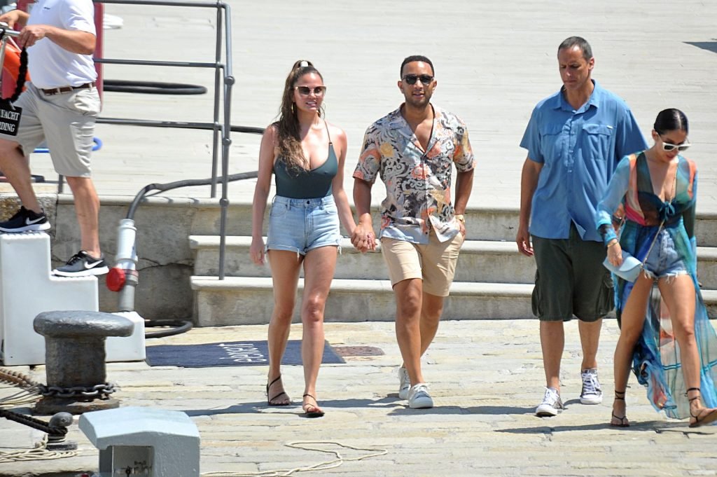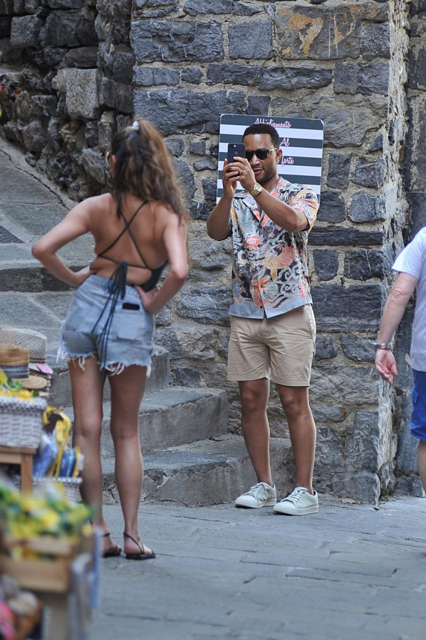 John Legend y Chrissy Teigen fueron vistos mostrando muestras públicas de afecto en Porto Venere, 07/04/2019. Chrissy fue fotografiada con shorts de mezclilla y un body verde oscuro con un escote pronunciado.