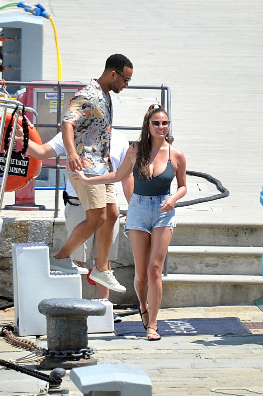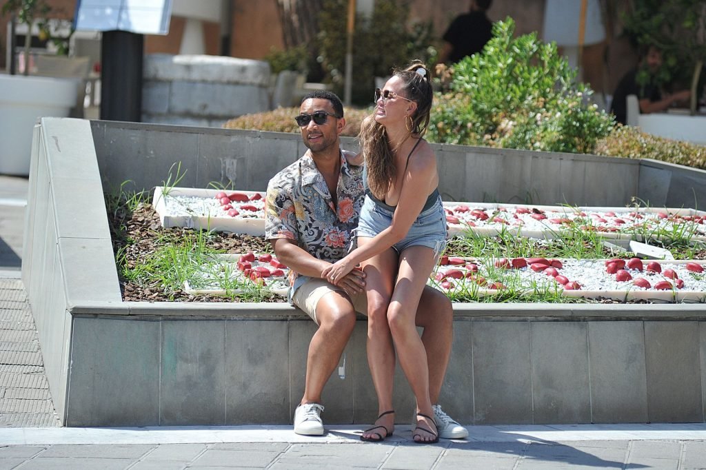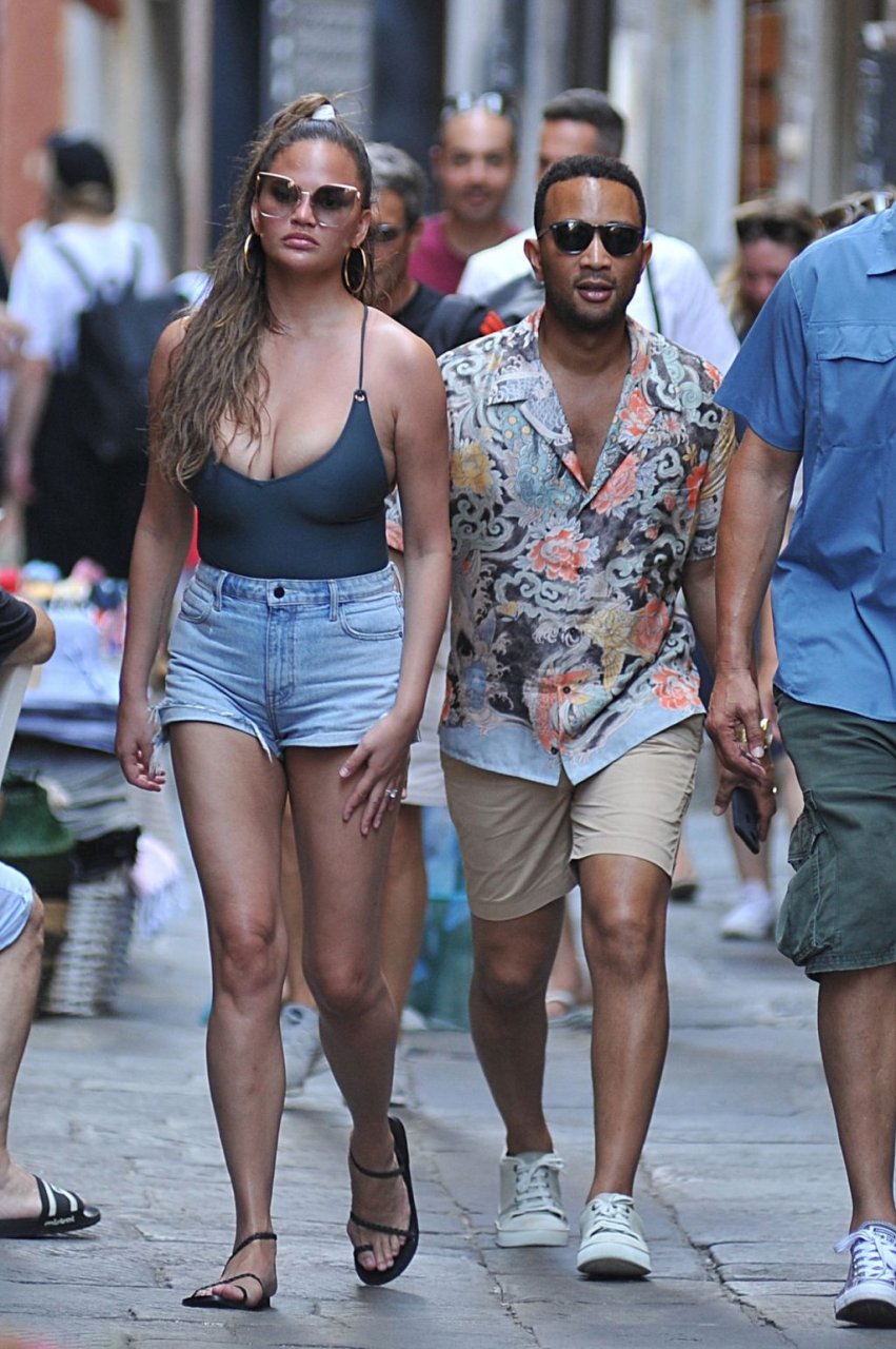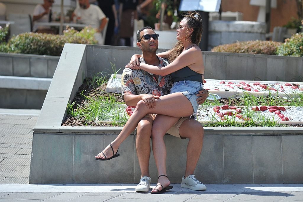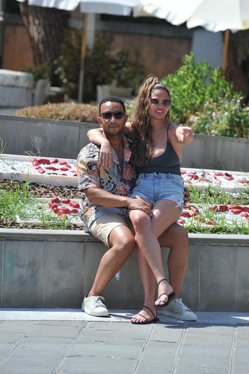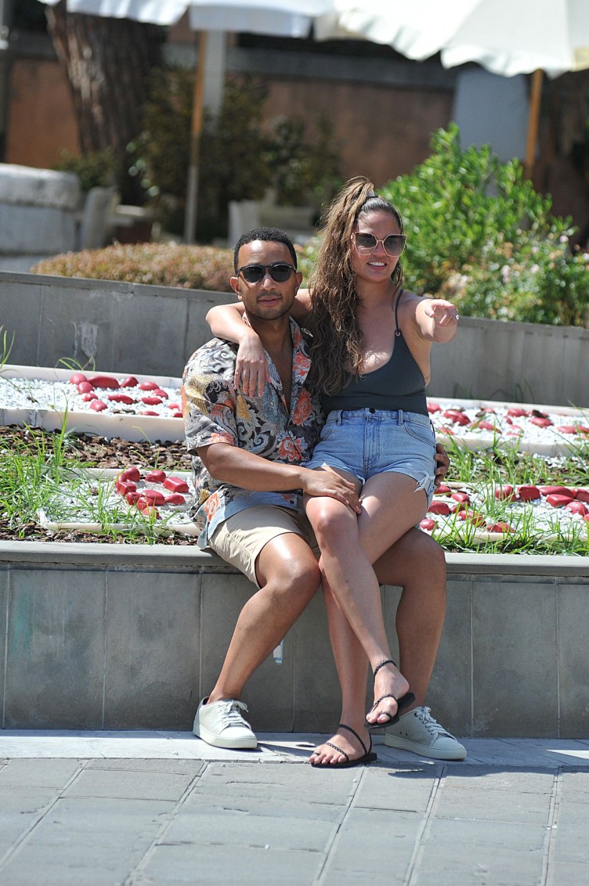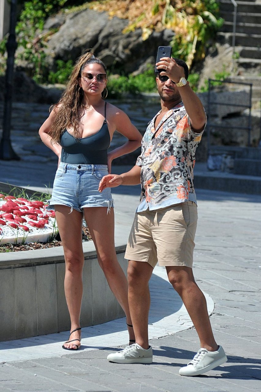 John Legend y Chrissy Teigen fueron vistos mostrando muestras públicas de afecto en Porto Venere, 07/04/2019. Chrissy fue fotografiada con shorts de mezclilla y un body verde oscuro con un escote pronunciado.