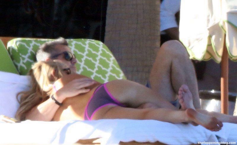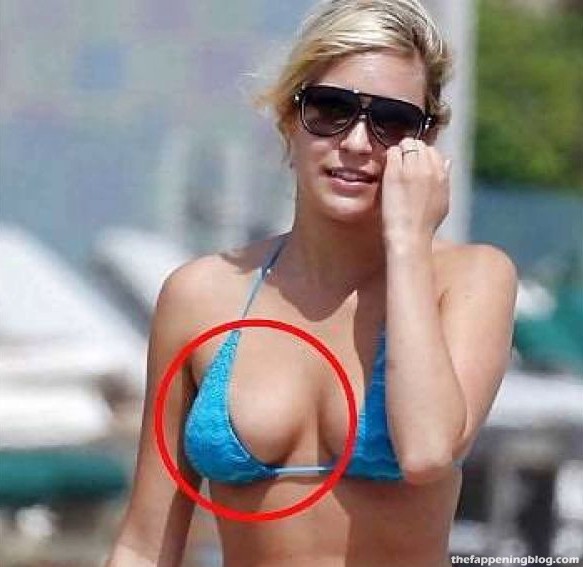 La presentadora de televisión y empresaria estadounidense muestra un bonito escote, luciendo sus grandes pechos, exhibe un trasero sexy y tiene algunos fallos de vestuario: destellos de ropa interior al levantar la falda y un ligero desliz de pezón.