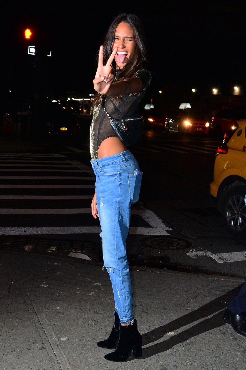 Cindy Bruna throws the peace sign as she heads to the Victoria’s Secret after party at Avenue in NYC after the fashion show.