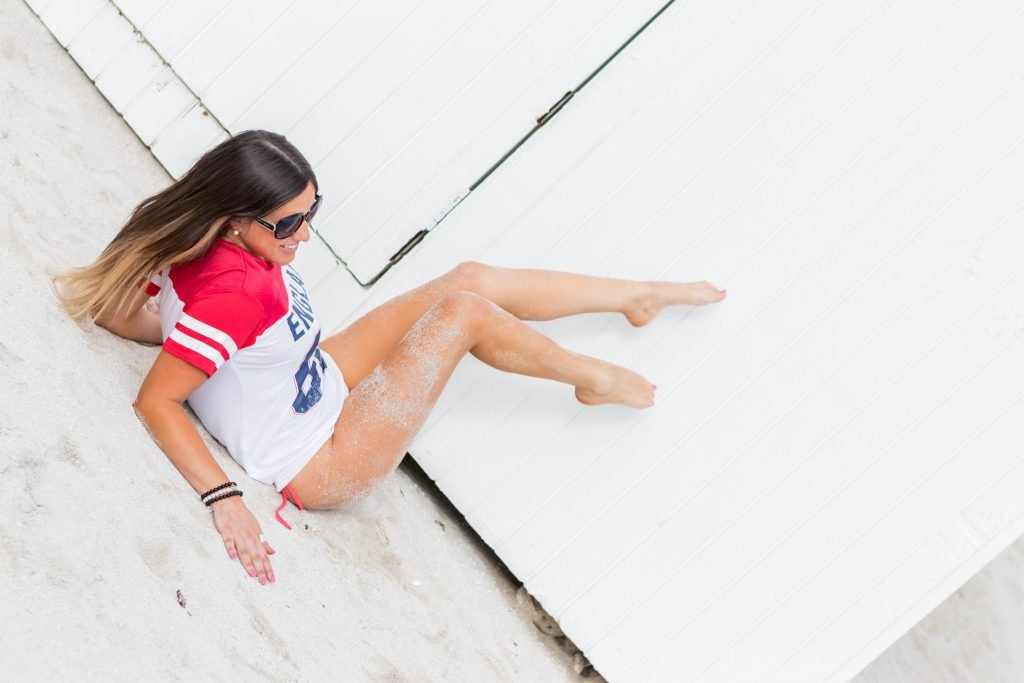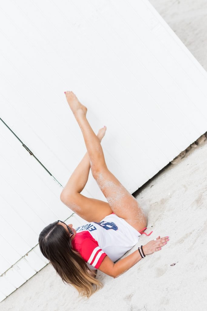 Modelo, estrella de reality TV, árbitra, reina del tanga Claudia Romani apoya a Inglaterra una vez más antes de su partido de cuartos de final – South Beach, 07/06/2018. Ella llevaba una camiseta de Inglaterra y un tanga rojo muy pequeño.